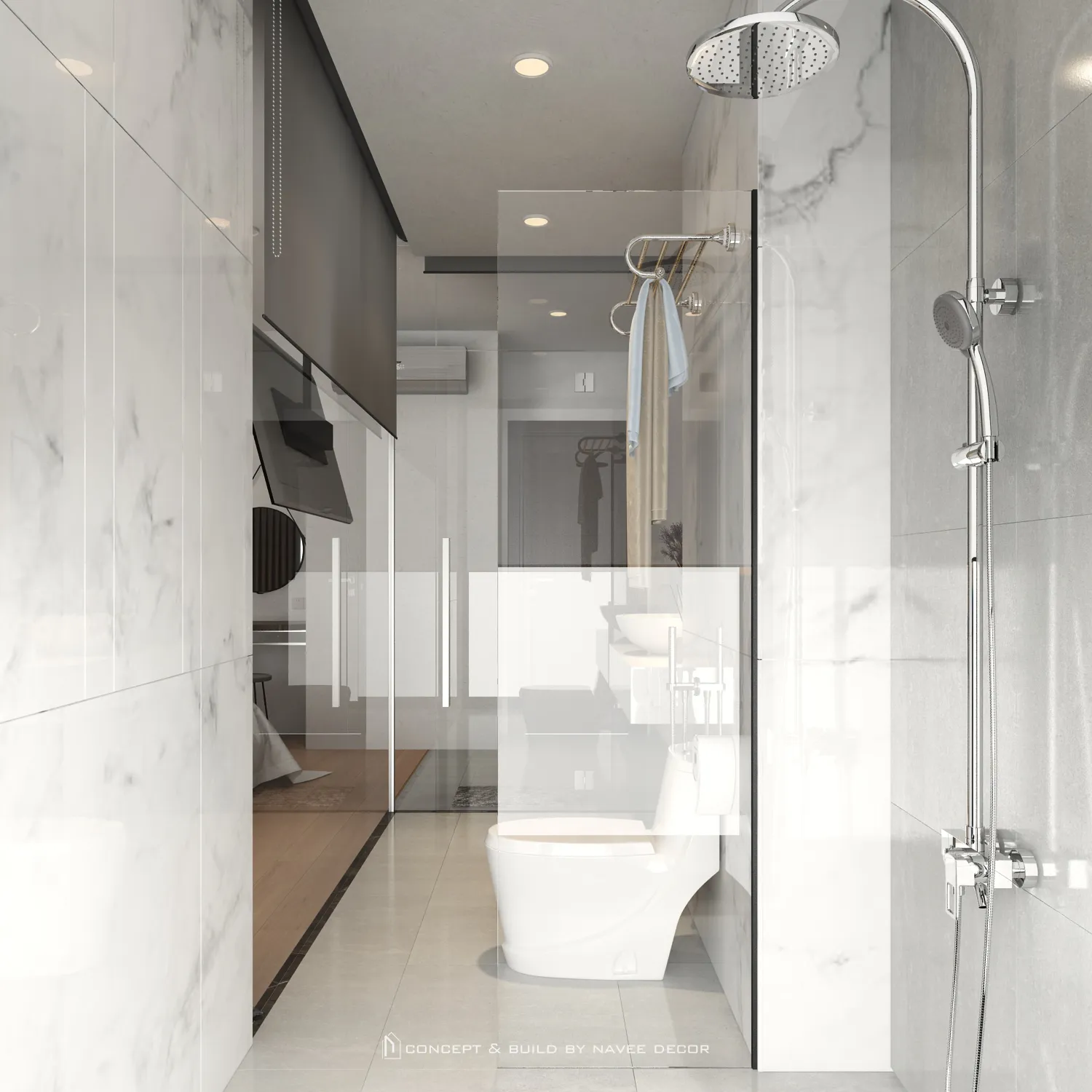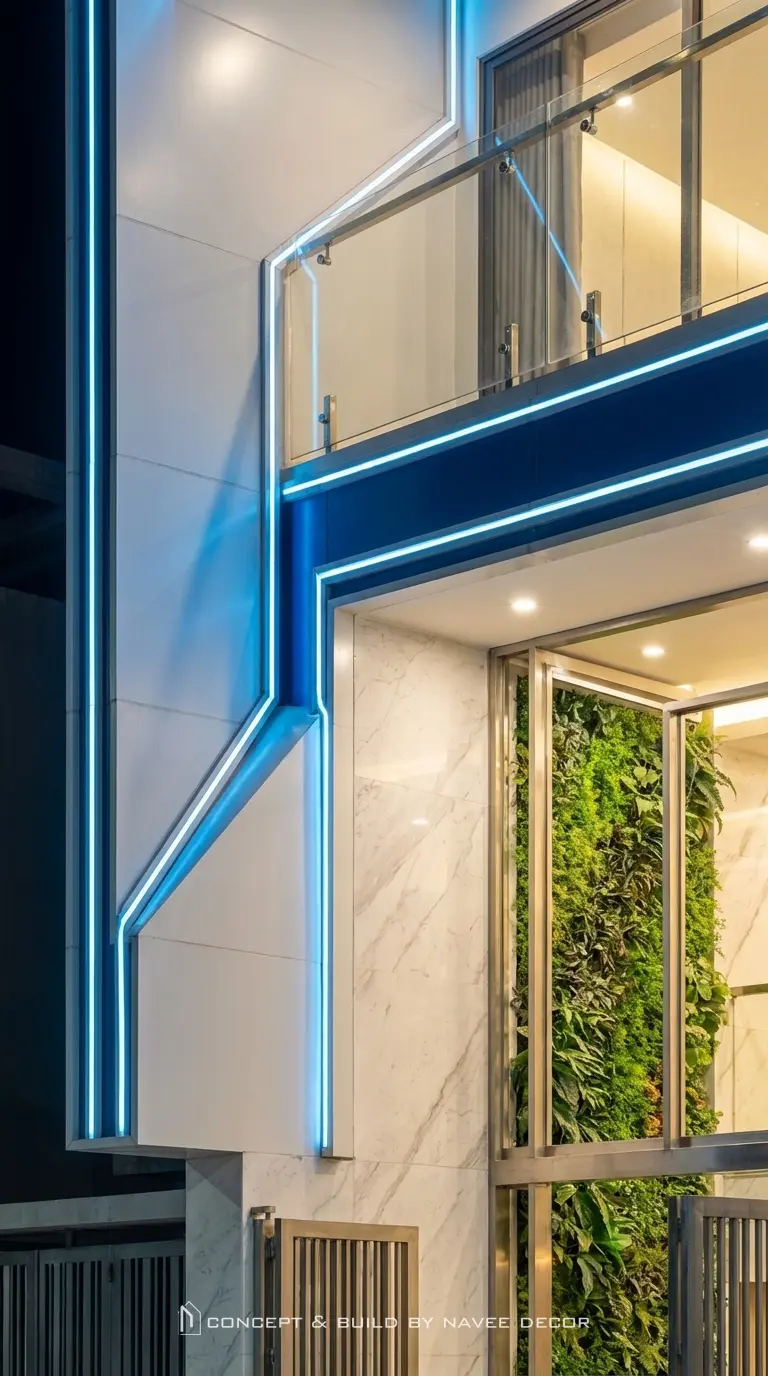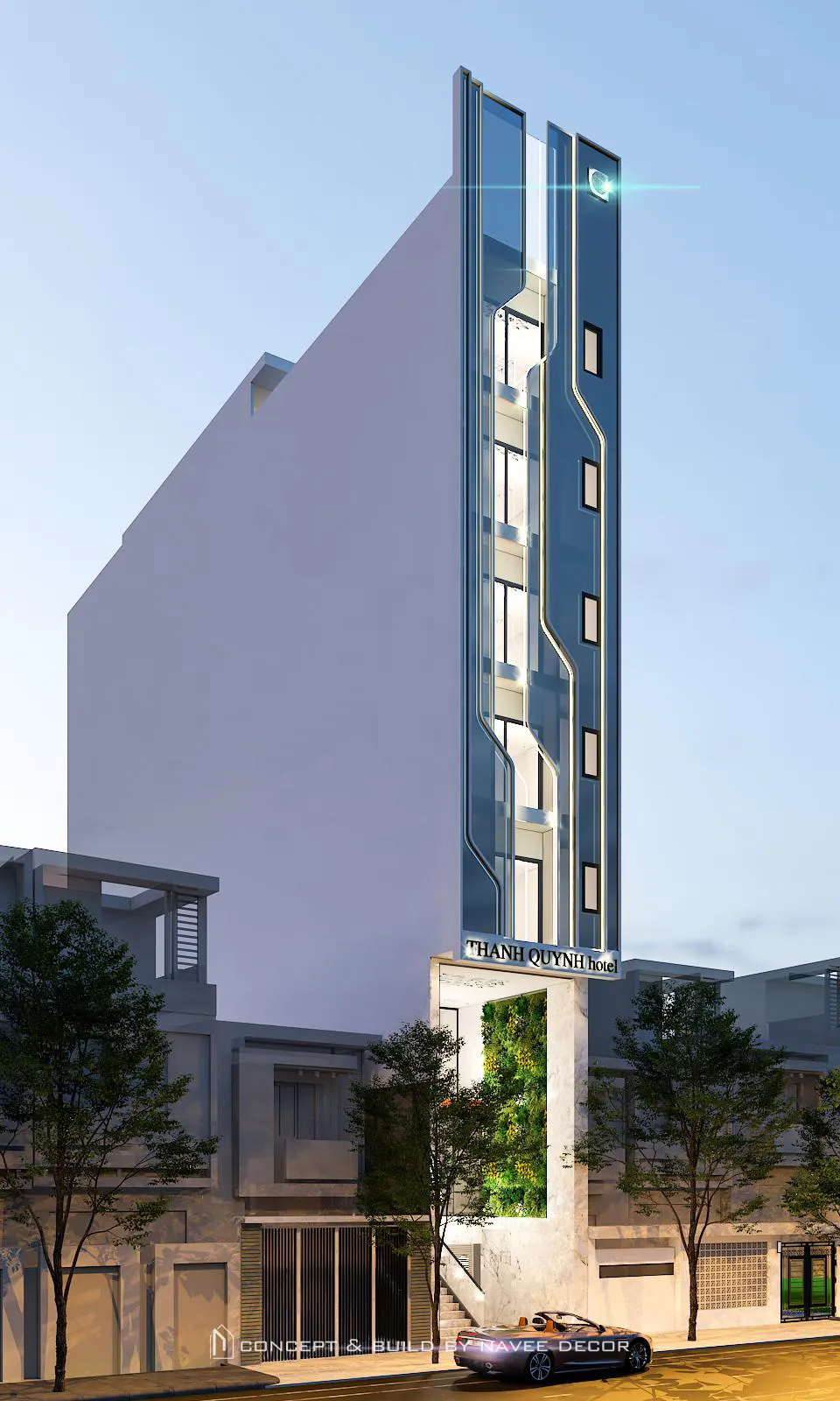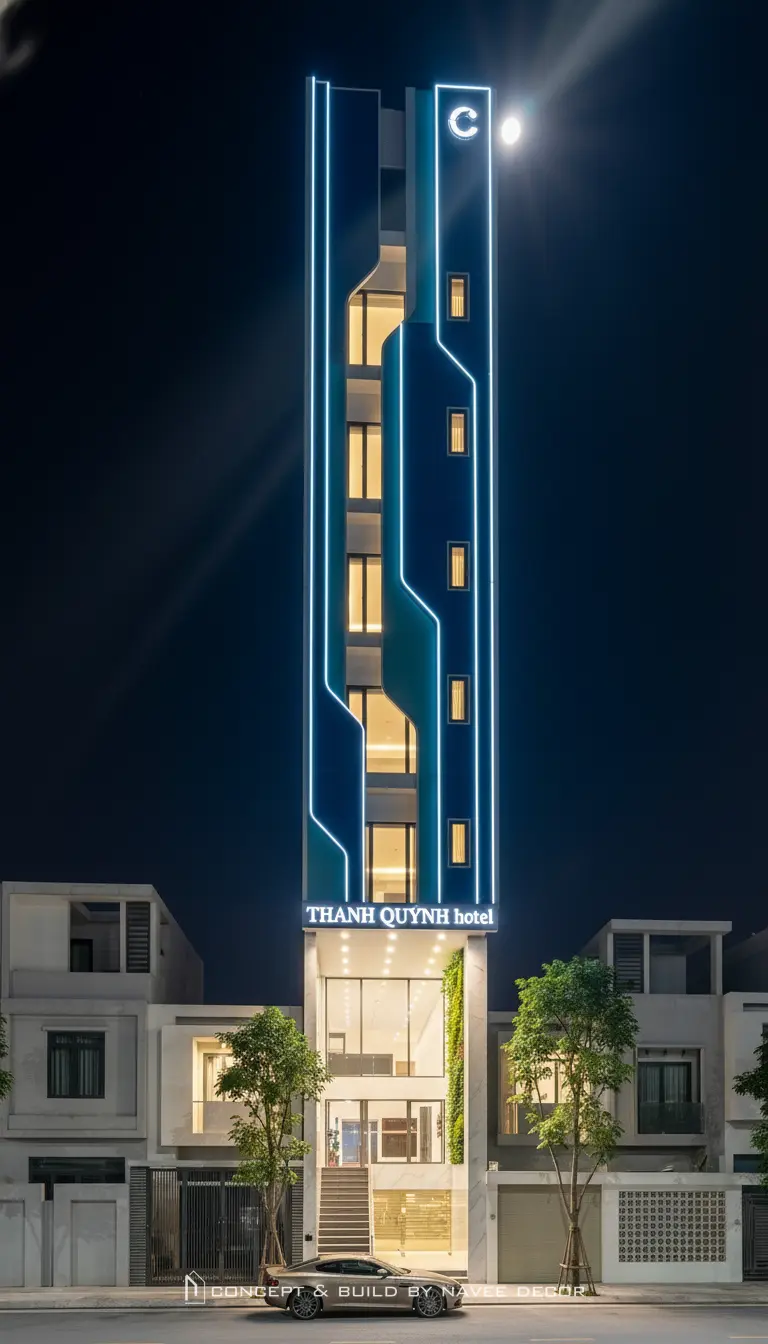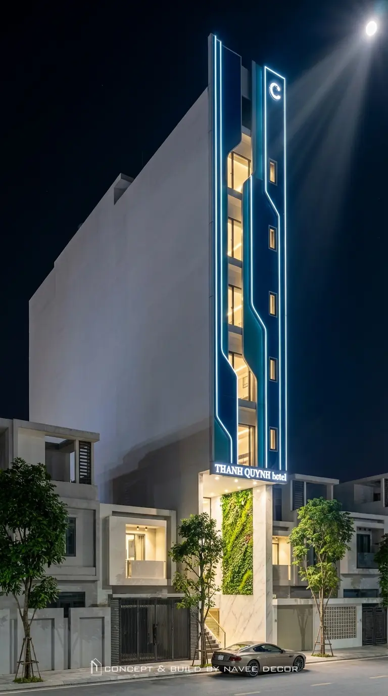 Điểm thách thức lớn nhất của dự án là mặt tiền hẹp – chiều cao lớn, yêu cầu công trình phải nổi bật cả ban ngày lẫn ban đêm. Thấu hiểu điều đó, Navee lên phương án concept mặt tiền tạo hình bằng các đường LED tăng nhận diện thương hiệu từ xa, mảng khối giật cấp mềm mại, tông màu xanh – trắng tương phản tạo chiều sâu thị giác.