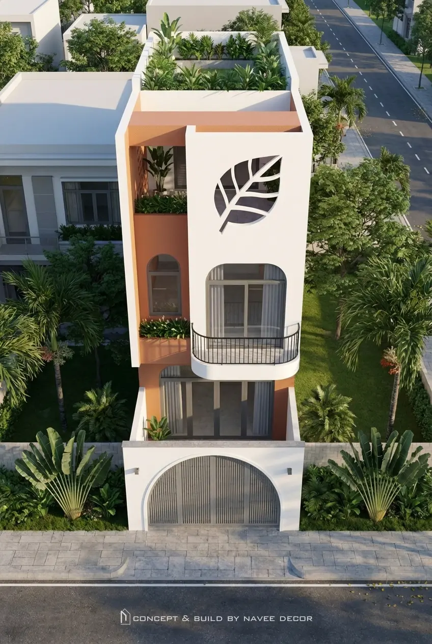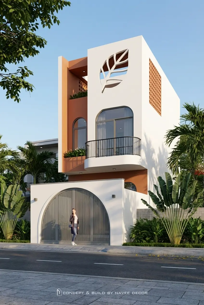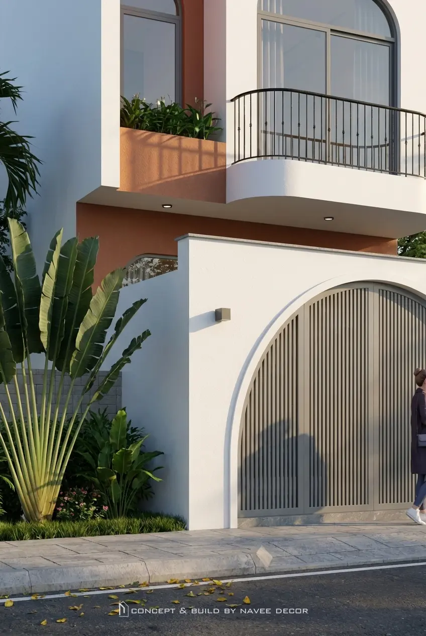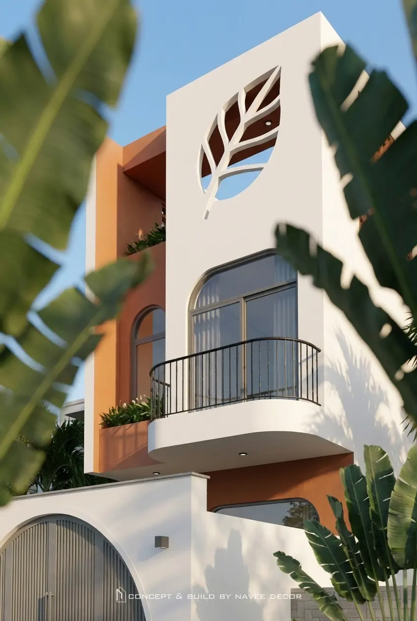 Mặt tiền công trình gây ấn tượng mạnh với ngôn ngữ hình khối rõ ràng – tinh giản nhưng giàu cảm xúc: tông màu trắng – cam đất tạo cảm giác ấm áp, gần gũi khí hậu Nha Trang. Ban công cong mềm mại kết hợp lan can sắt thanh mảnh tăng độ thoáng và chiều sâu mặt đứng.