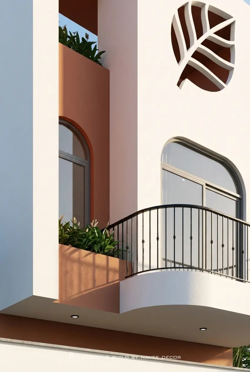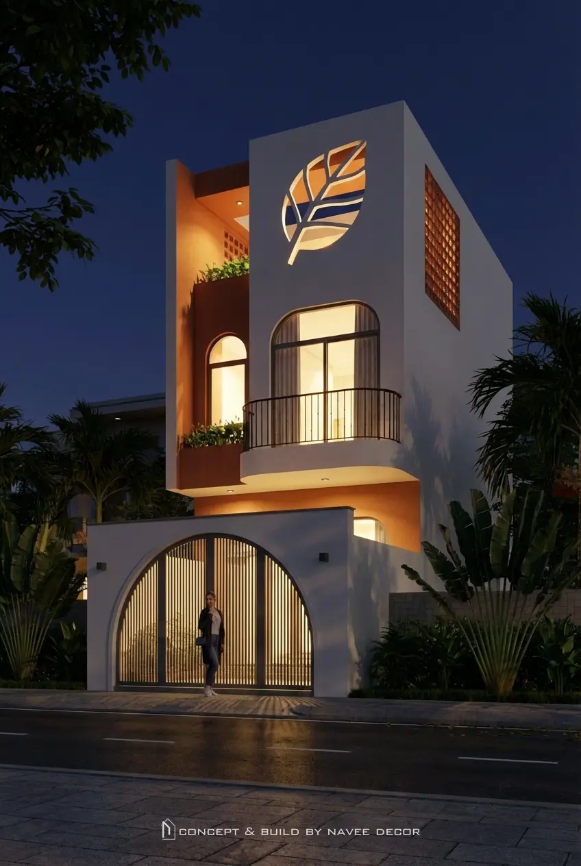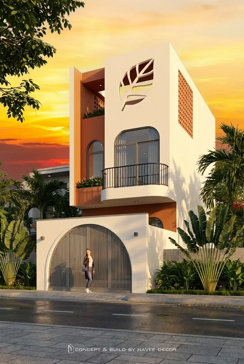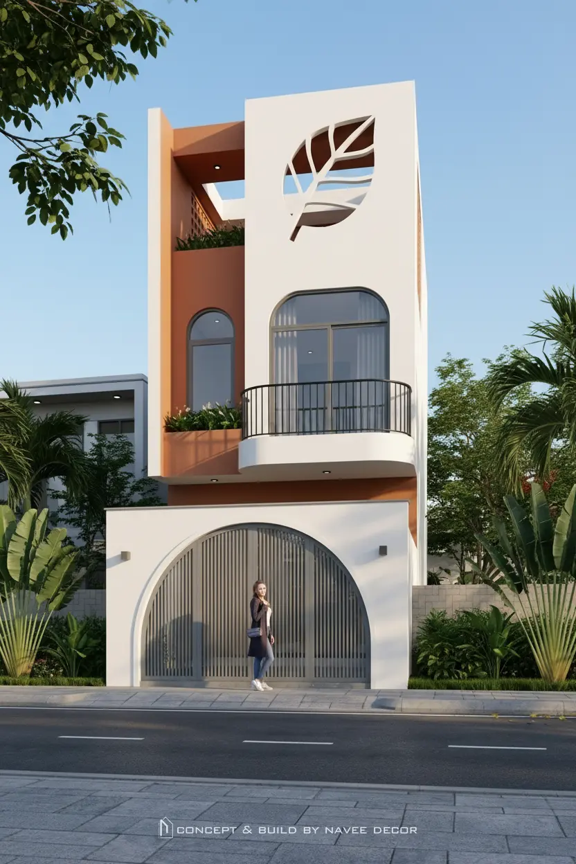 Mặt tiền công trình gây ấn tượng mạnh với ngôn ngữ hình khối rõ ràng – tinh giản nhưng giàu cảm xúc: tông màu trắng – cam đất tạo cảm giác ấm áp, gần gũi khí hậu Nha Trang. Ban công cong mềm mại kết hợp lan can sắt thanh mảnh tăng độ thoáng và chiều sâu mặt đứng.