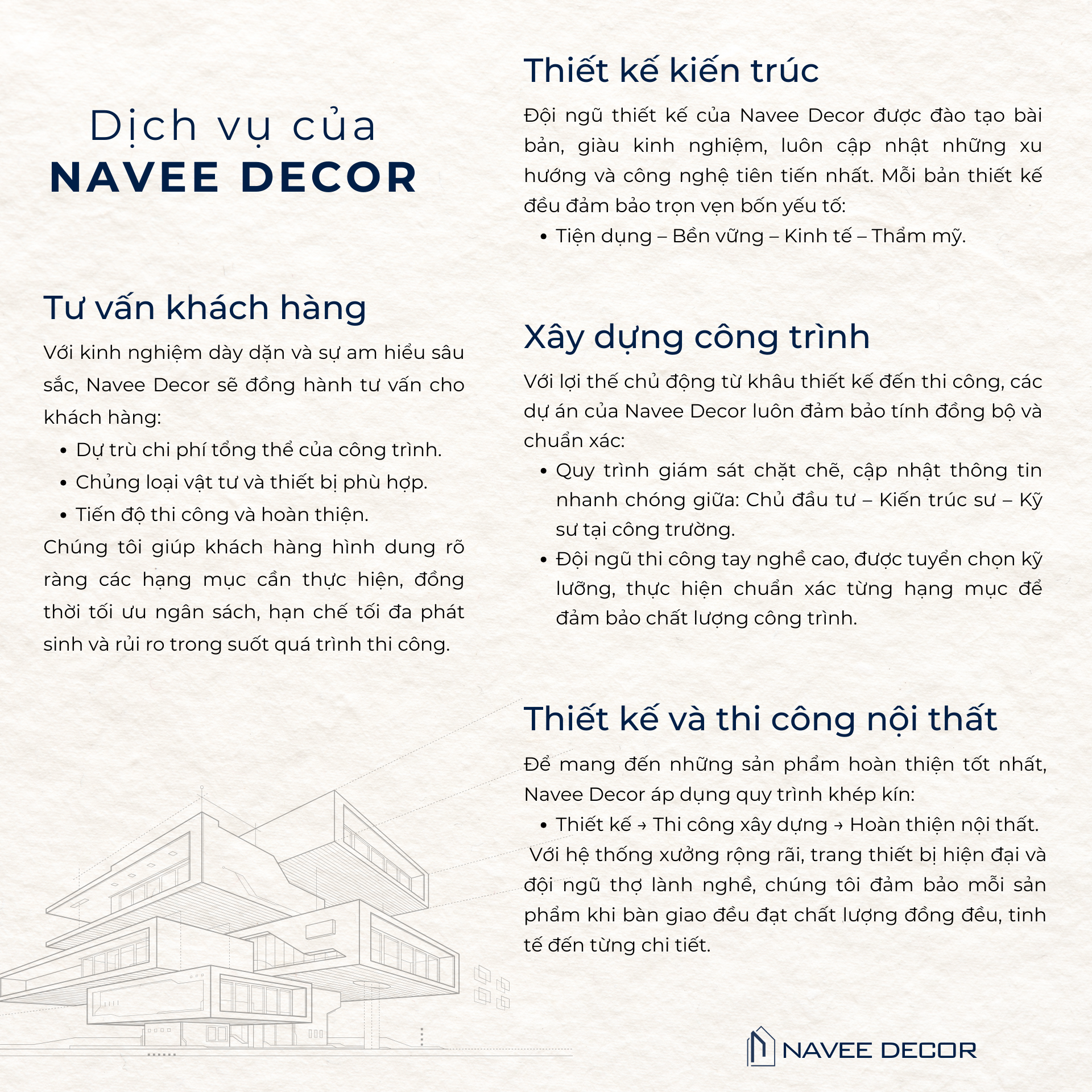 Tại NAVEE DECOR, dịch vụ thiết kế và thi công biệt thự được triển khai theo định hướng đồng bộ, trong đó từng giải pháp được nghiên cứu kỹ từ kiến trúc, nội thất đến cảnh quan, nhằm đảm bảo sự thống nhất giữa ý tưởng và công trình thực tế khi hoàn thiện.