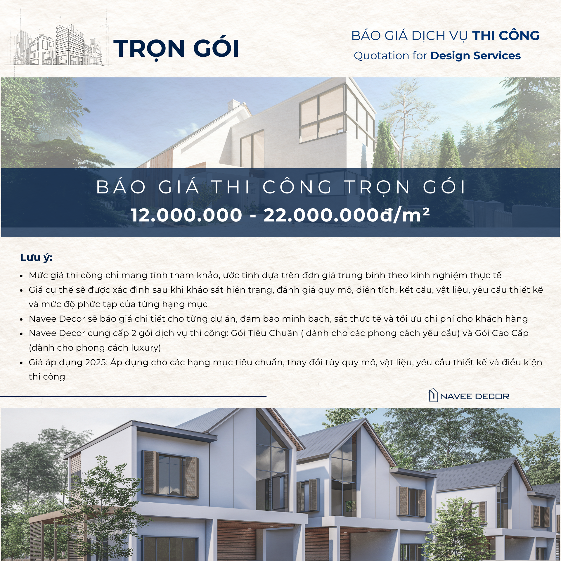 Với hình thức trọn gói, NAVEE DECOR chịu trách nhiệm xuyên suốt từ thiết kế, thi công xây dựng đến hoàn thiện nội thất, giúp đảm bảo tiến độ, kiểm soát chi phí và giữ được tinh thần thiết kế ban đầu khi công trình hoàn thiện.