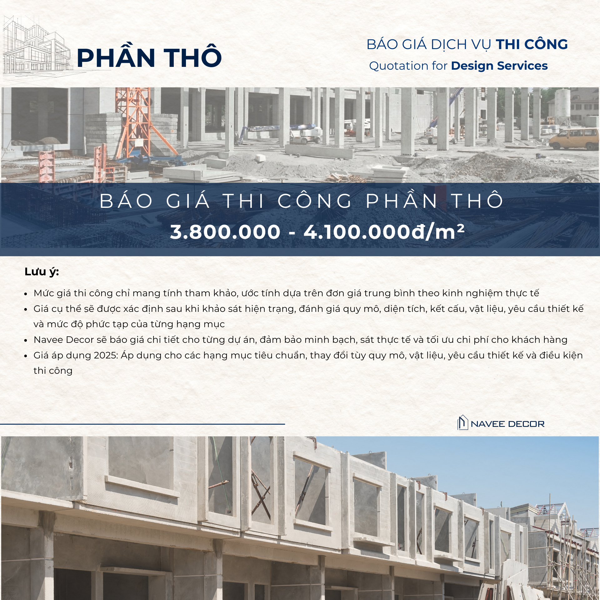 NAVEE DECOR kiểm soát chặt chẽ vật liệu, biện pháp thi công và công tác giám sát để đảm bảo phần thô được triển khai đúng tiêu chuẩn kỹ thuật, tạo nền tảng vững chắc cho các giai đoạn hoàn thiện tiếp theo.