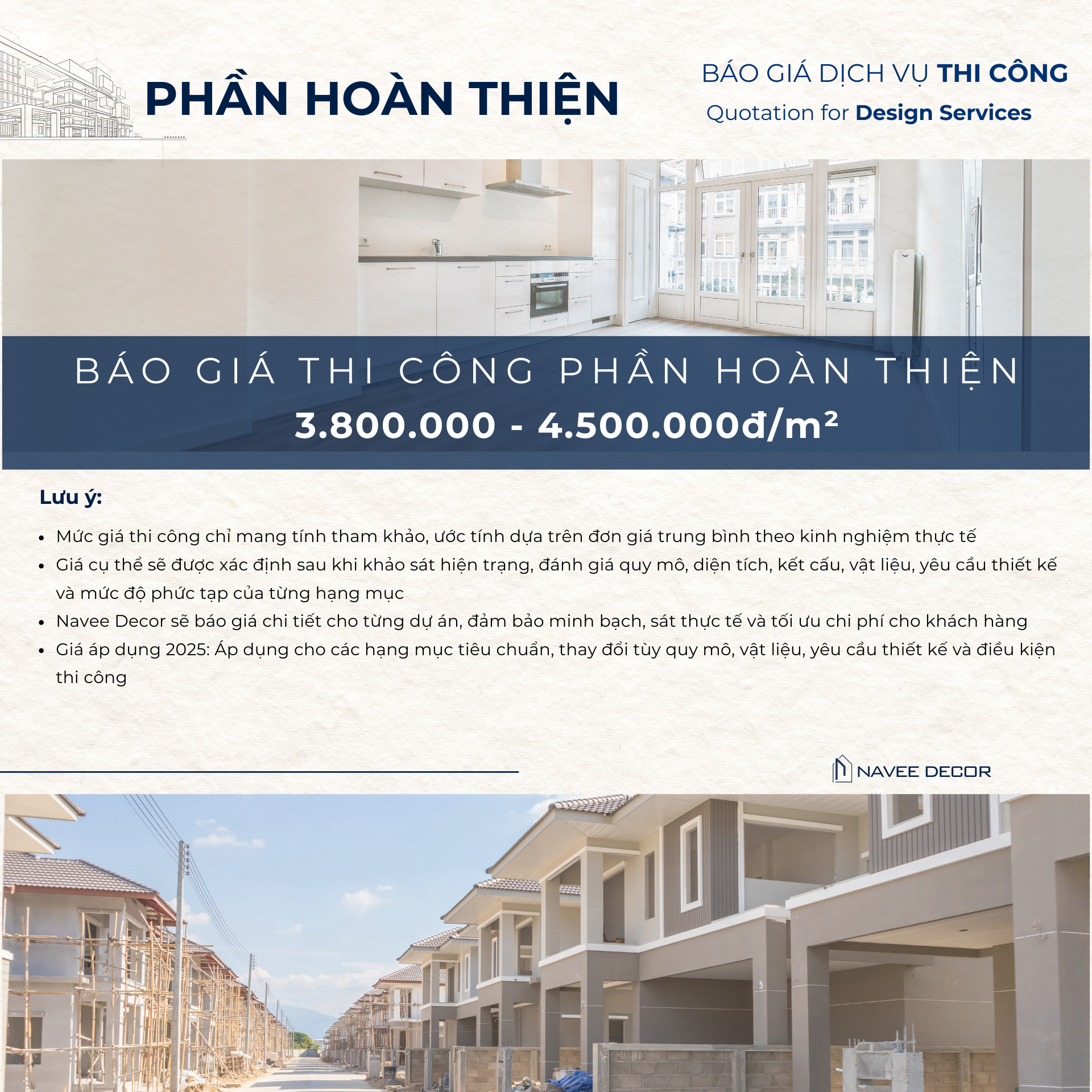 Với hình thức trọn gói, NAVEE DECOR chịu trách nhiệm xuyên suốt từ thiết kế, thi công xây dựng đến hoàn thiện nội thất, giúp đảm bảo tiến độ, kiểm soát chi phí và giữ được tinh thần thiết kế ban đầu khi công trình hoàn thiện.