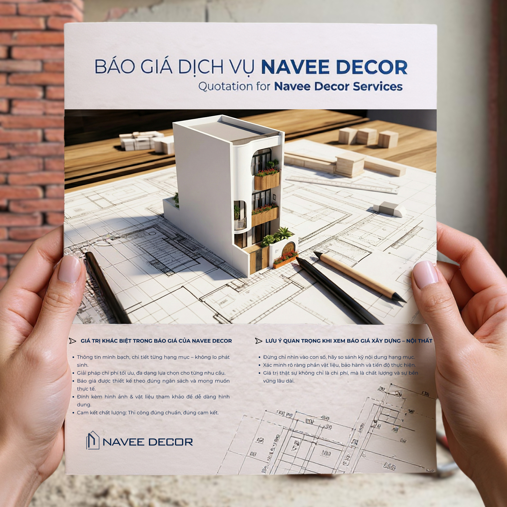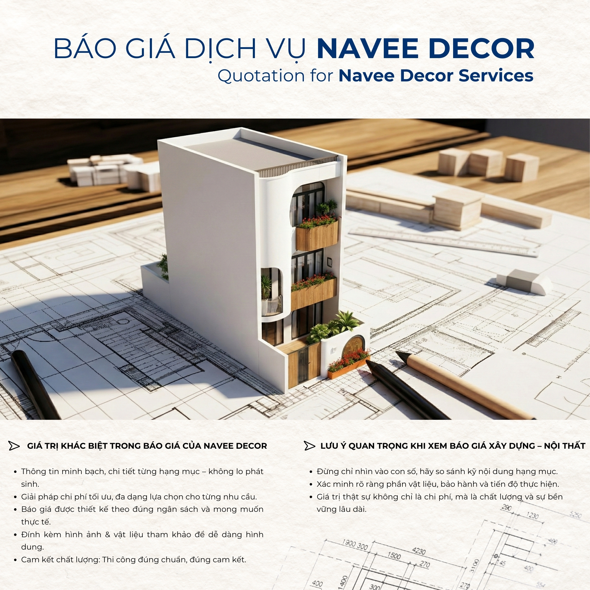 Báo giá tại Navee Decor không chỉ thể hiện chi phí thi công, mà còn phản ánh cách tổ chức và lập kế hoạch cho toàn bộ công trình. Mỗi báo giá được xây dựng dựa trên việc đánh giá kỹ nhu cầu sử dụng, quy mô xây dựng và mức độ hoàn thiện mong muốn.