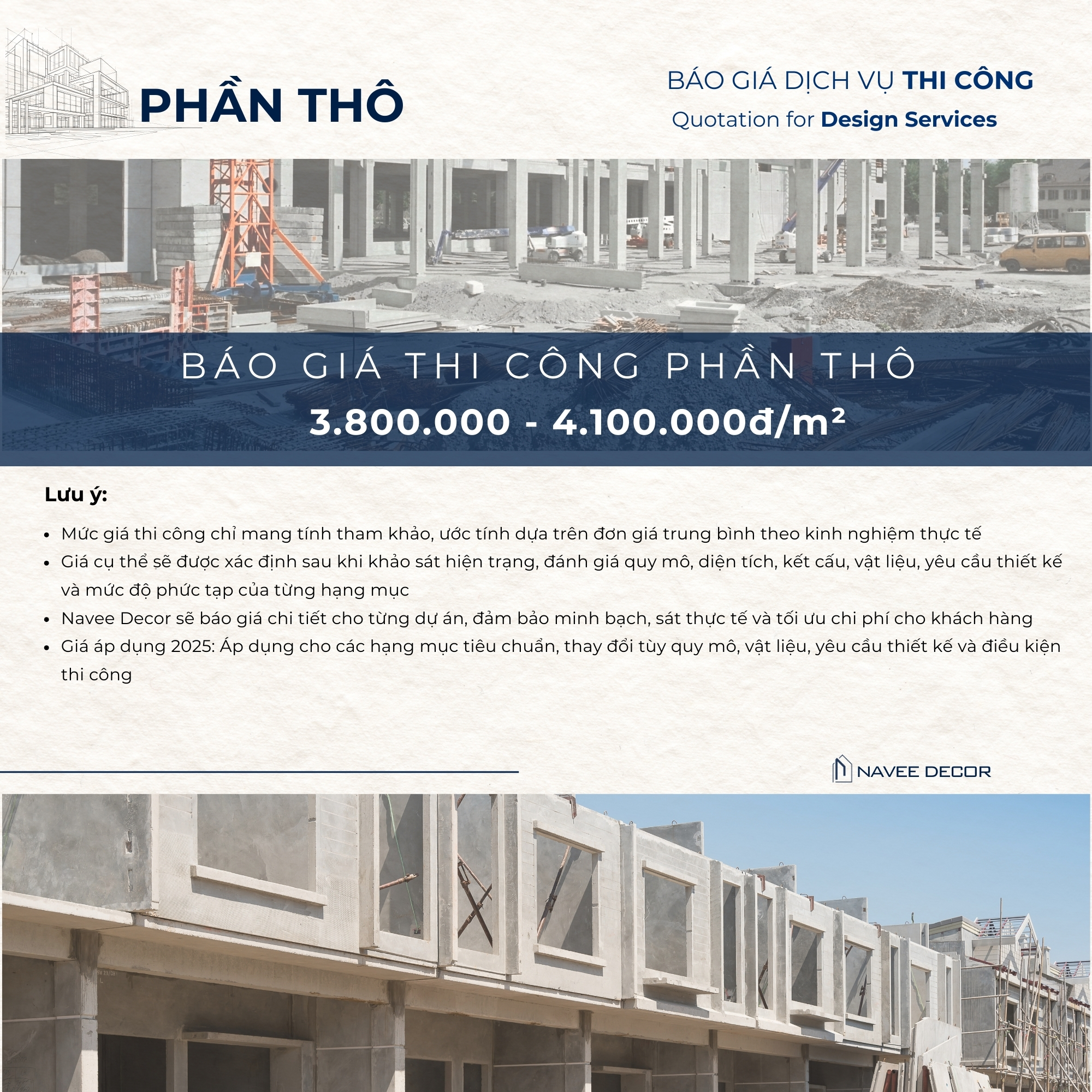 Chi phí thi công phần thô sẽ thay đổi tùy theo điều kiện địa chất, quy mô xây dựng và giải pháp kết cấu của từng công trình. Việc khảo sát kỹ trước khi báo giá giúp đảm bảo tính chính xác và hạn chế phát sinh trong quá trình triển khai.