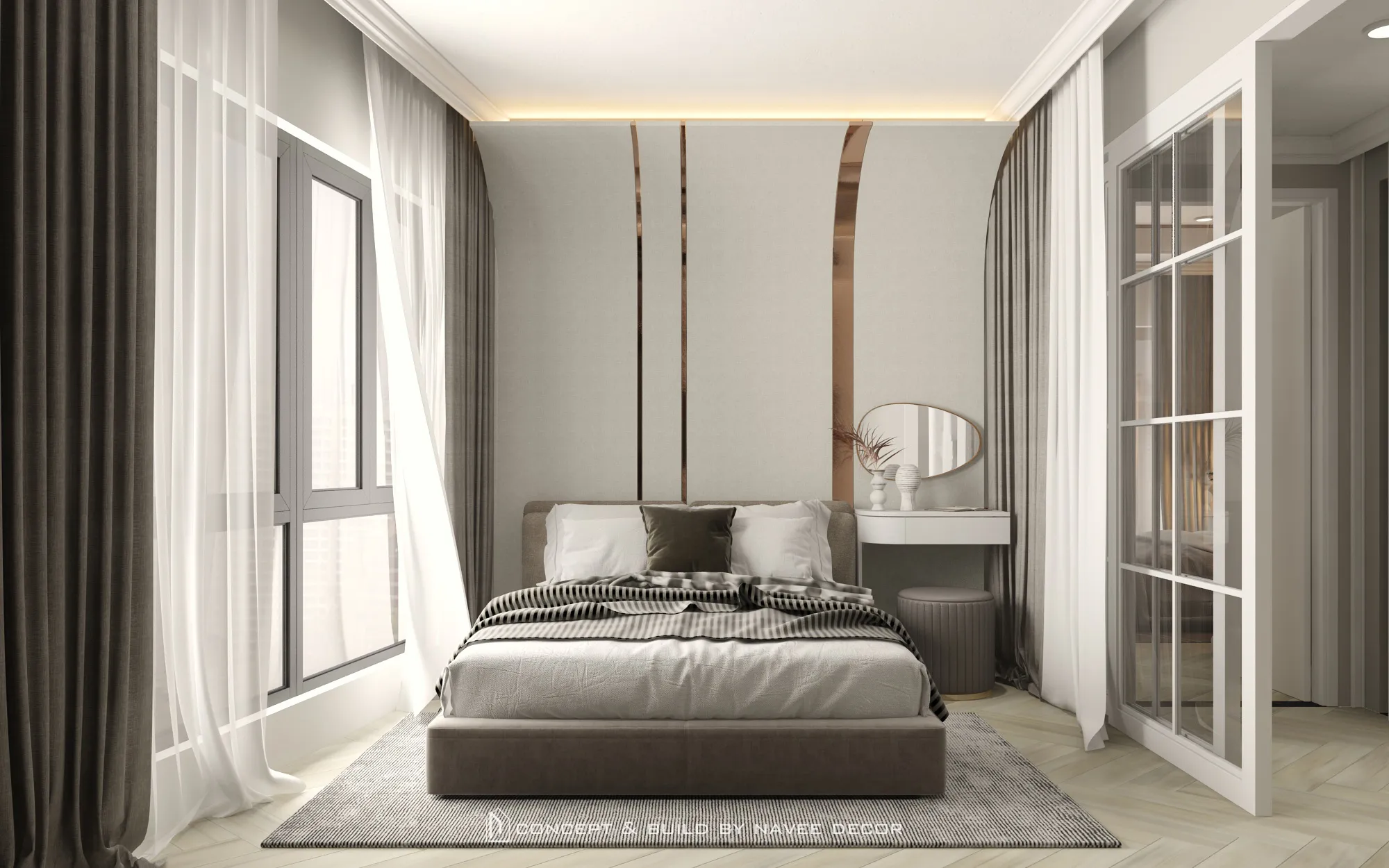 Tổng thể không gian sử dụng gam màu ấm (beige – kem – nâu gỗ) kết hợp vật liệu đá, gỗ và kính, tạo nên cảm giác nhẹ nhàng, thanh lịch nhưng vẫn giữ được chiều sâu thẩm mỹ.