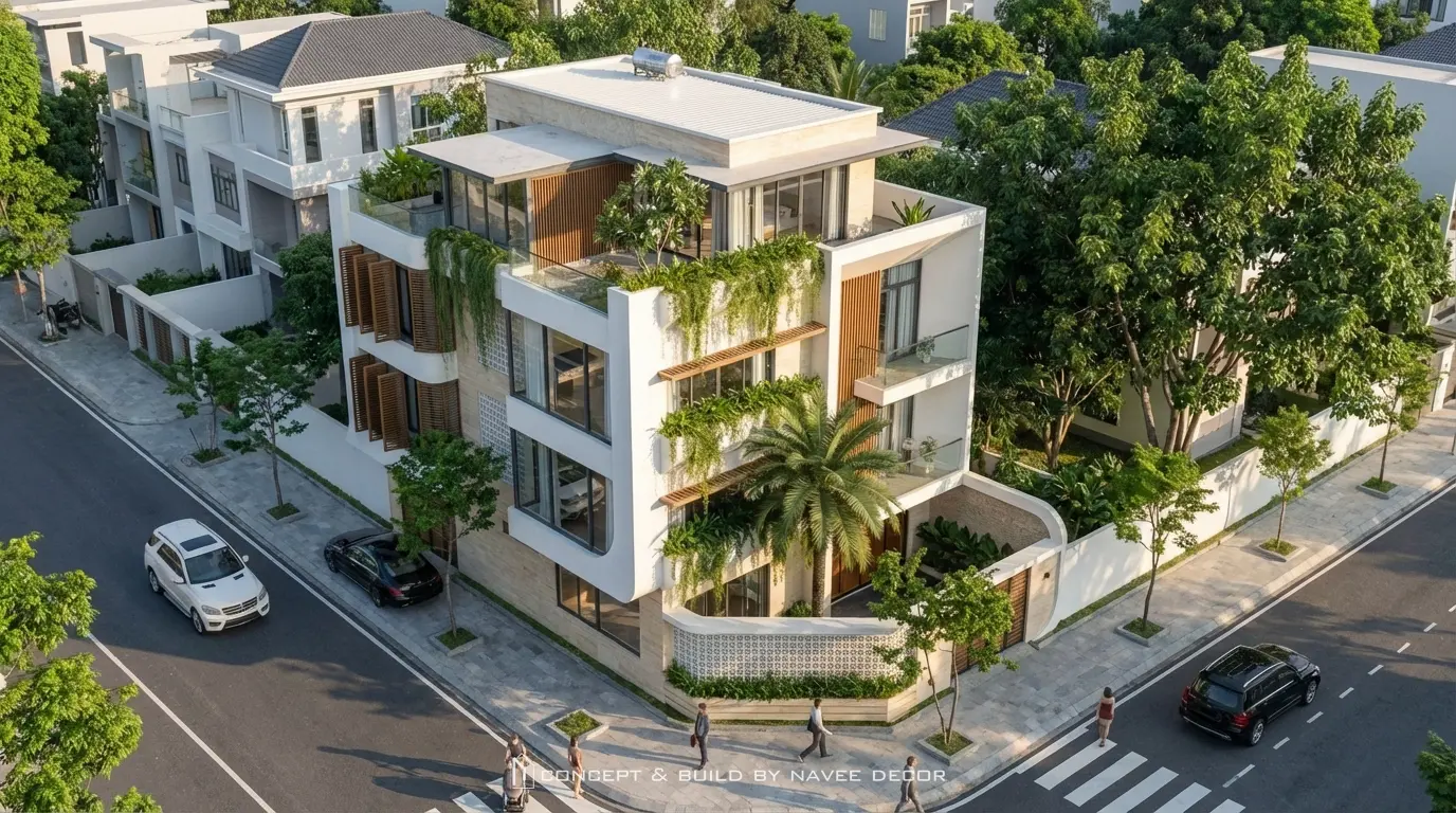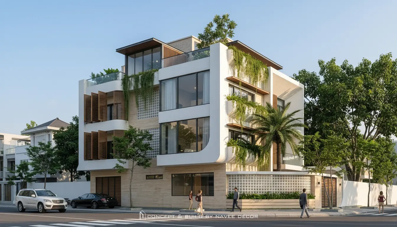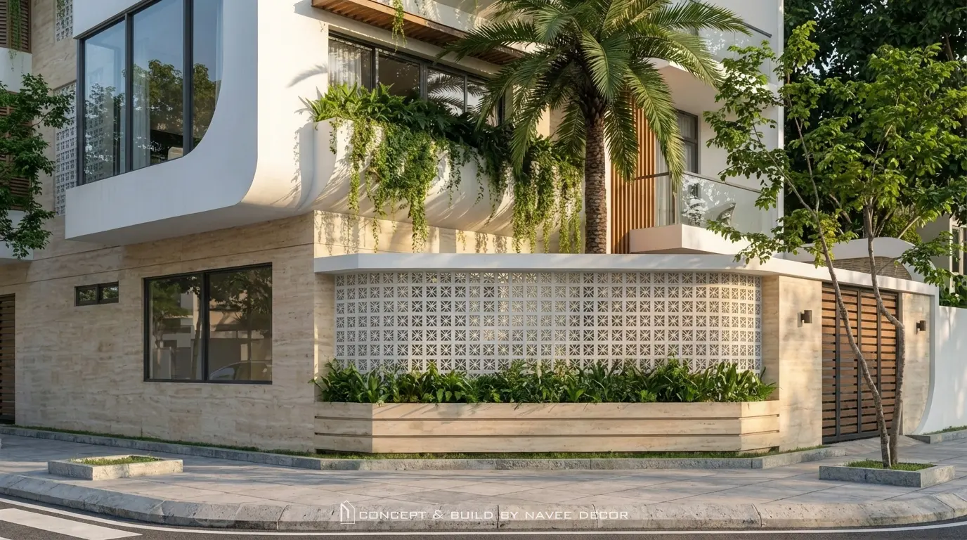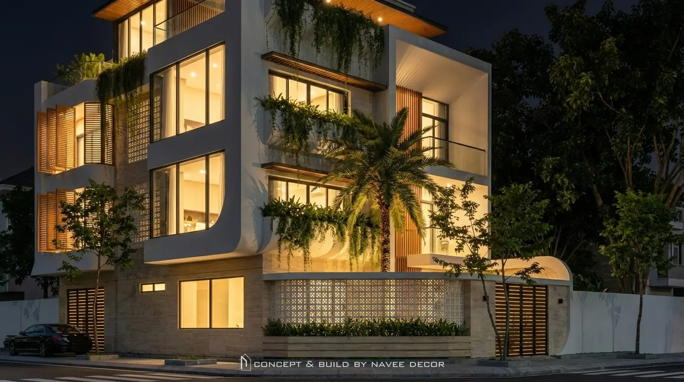 Công trình nổi bật với hình khối mạnh mẽ, bo cong mềm mại tạo cảm giác thanh thoát. Mảng xanh bố trí xuyên suốt từ mặt đứng đến sân thượng cùng giải pháp thông gió chéo tối ưu cho khí hậu Nha Trang.