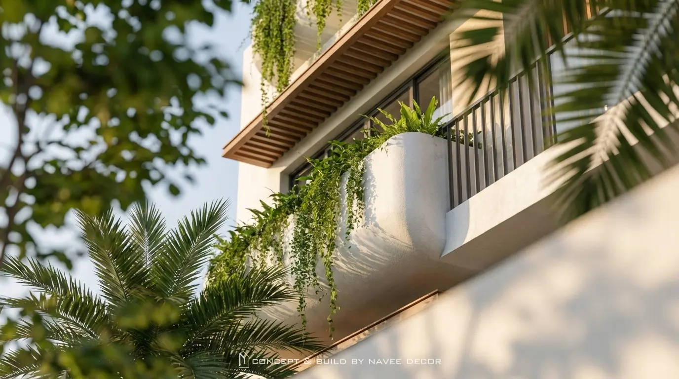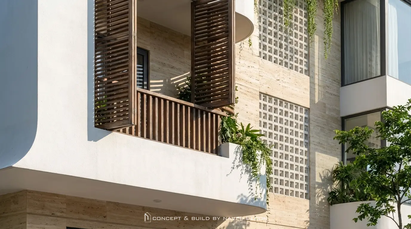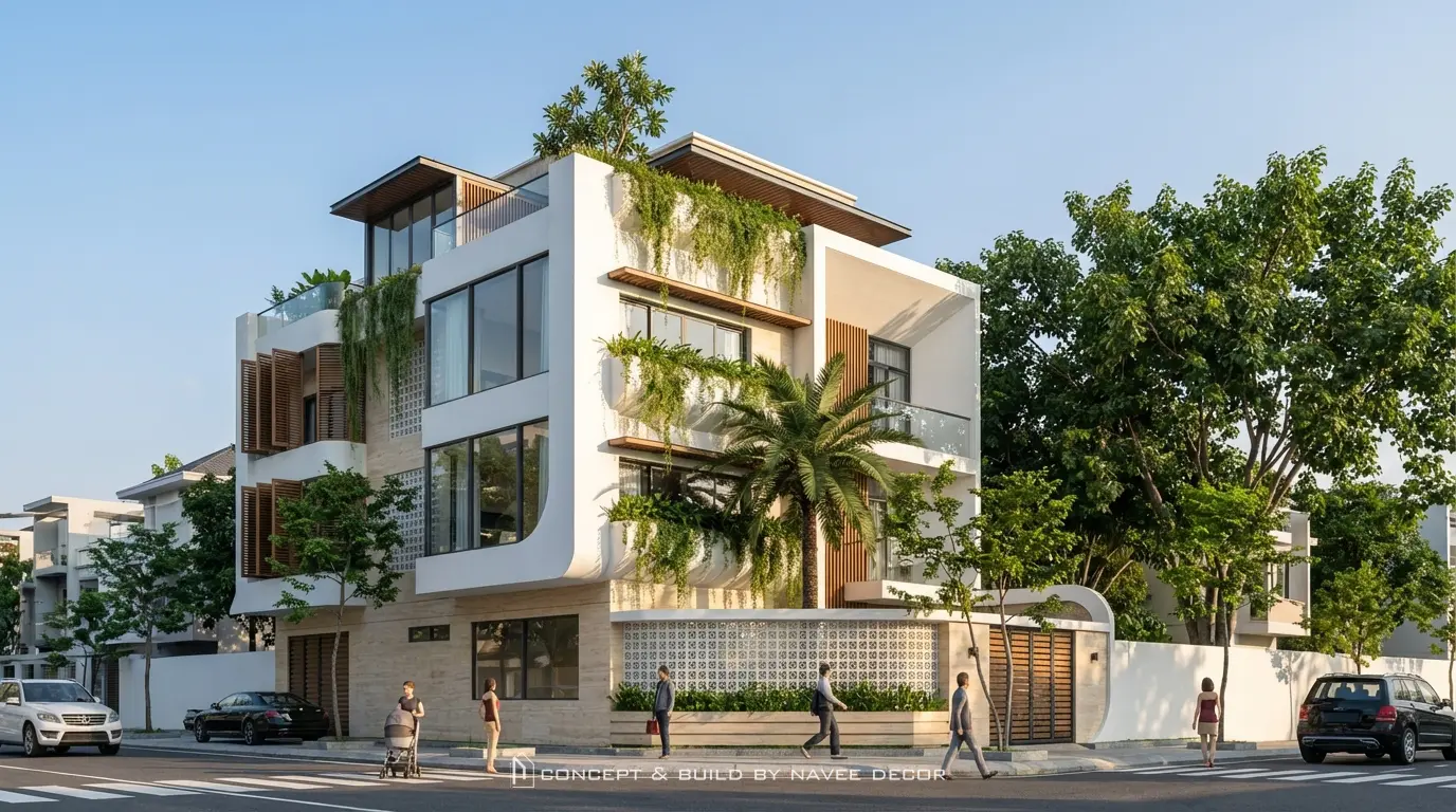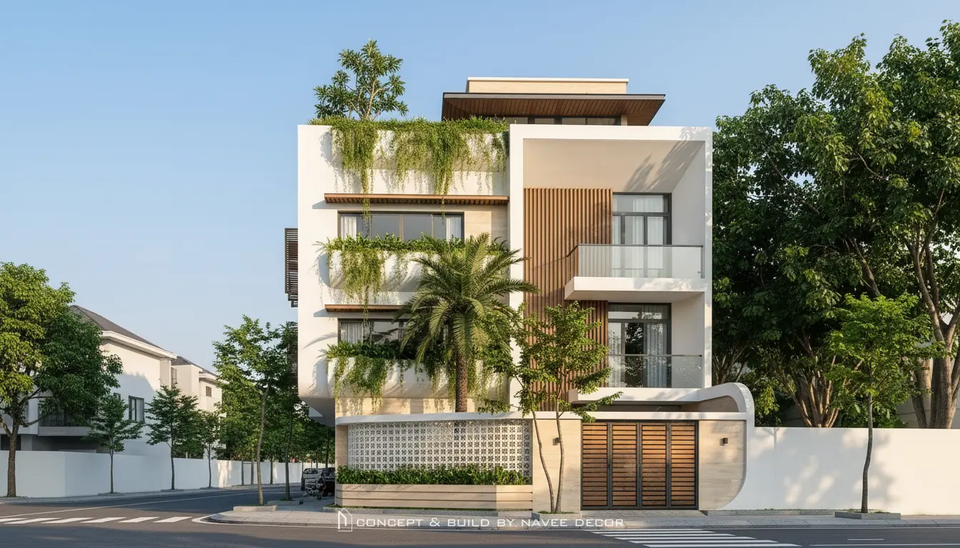 Công trình nổi bật với hình khối mạnh mẽ, bo cong mềm mại tạo cảm giác thanh thoát. Mảng xanh bố trí xuyên suốt từ mặt đứng đến sân thượng cùng giải pháp thông gió chéo tối ưu cho khí hậu Nha Trang.