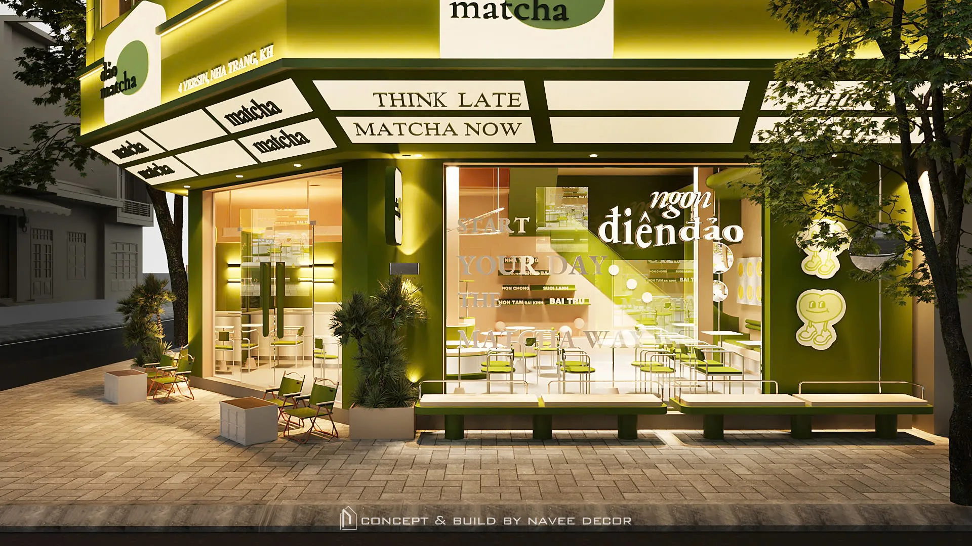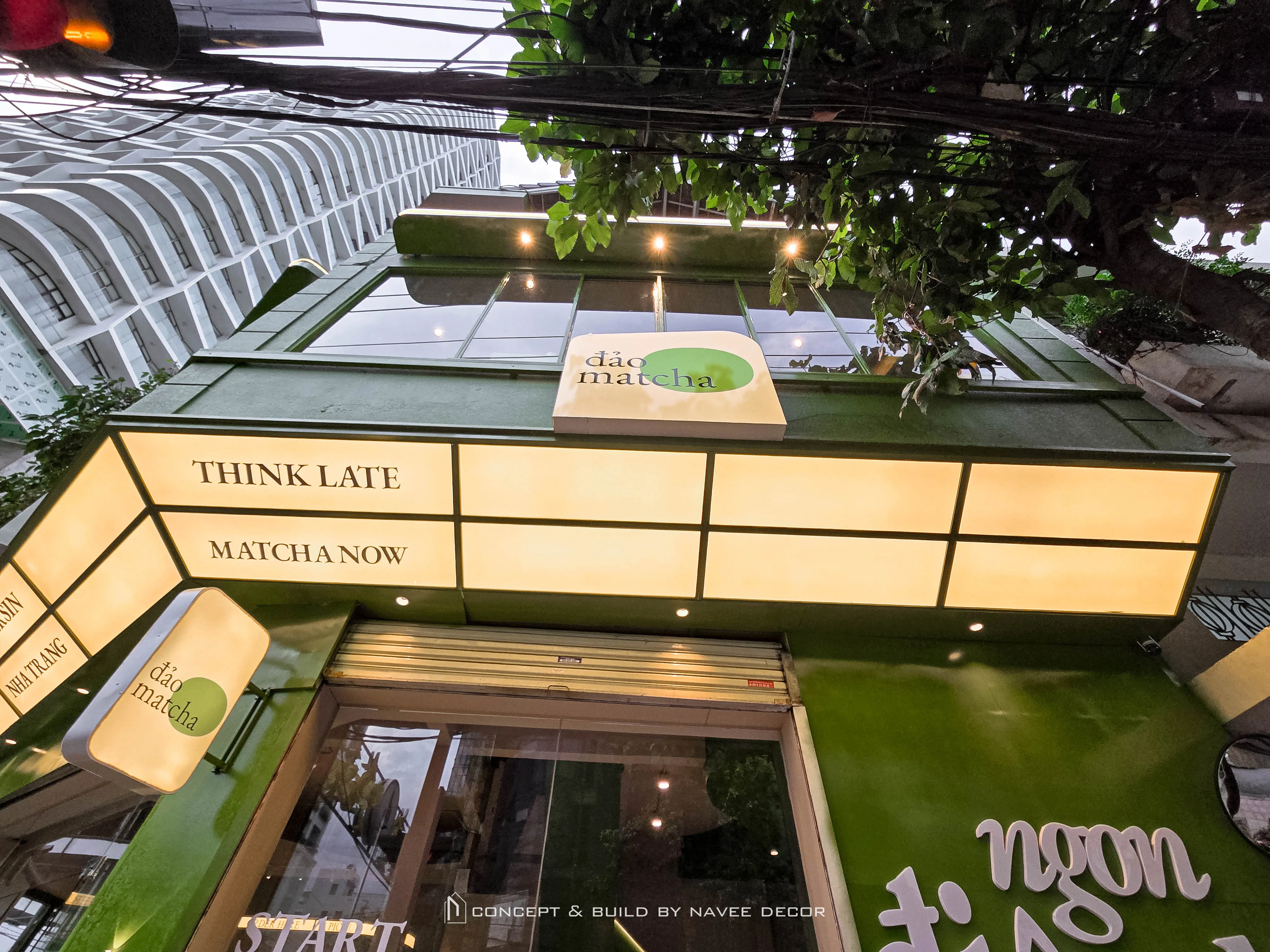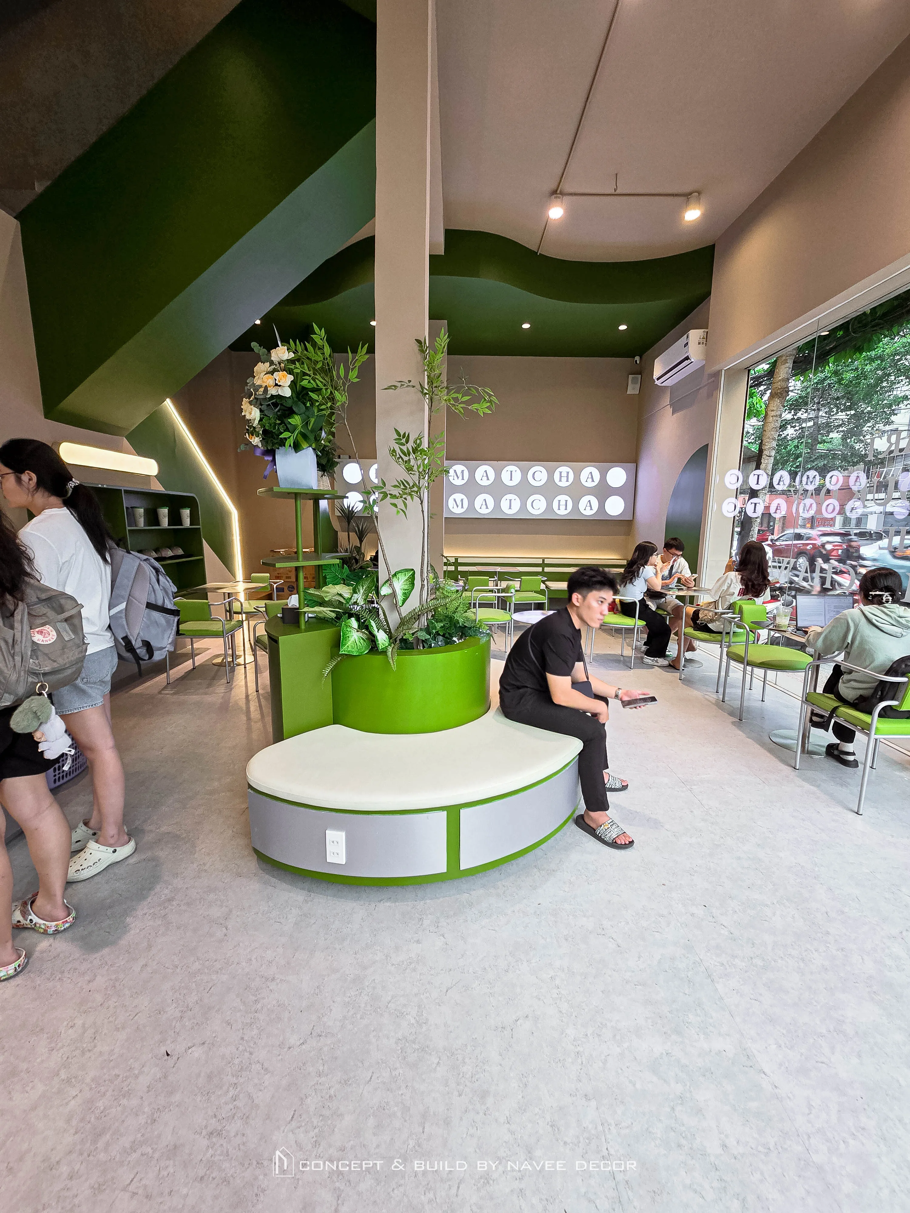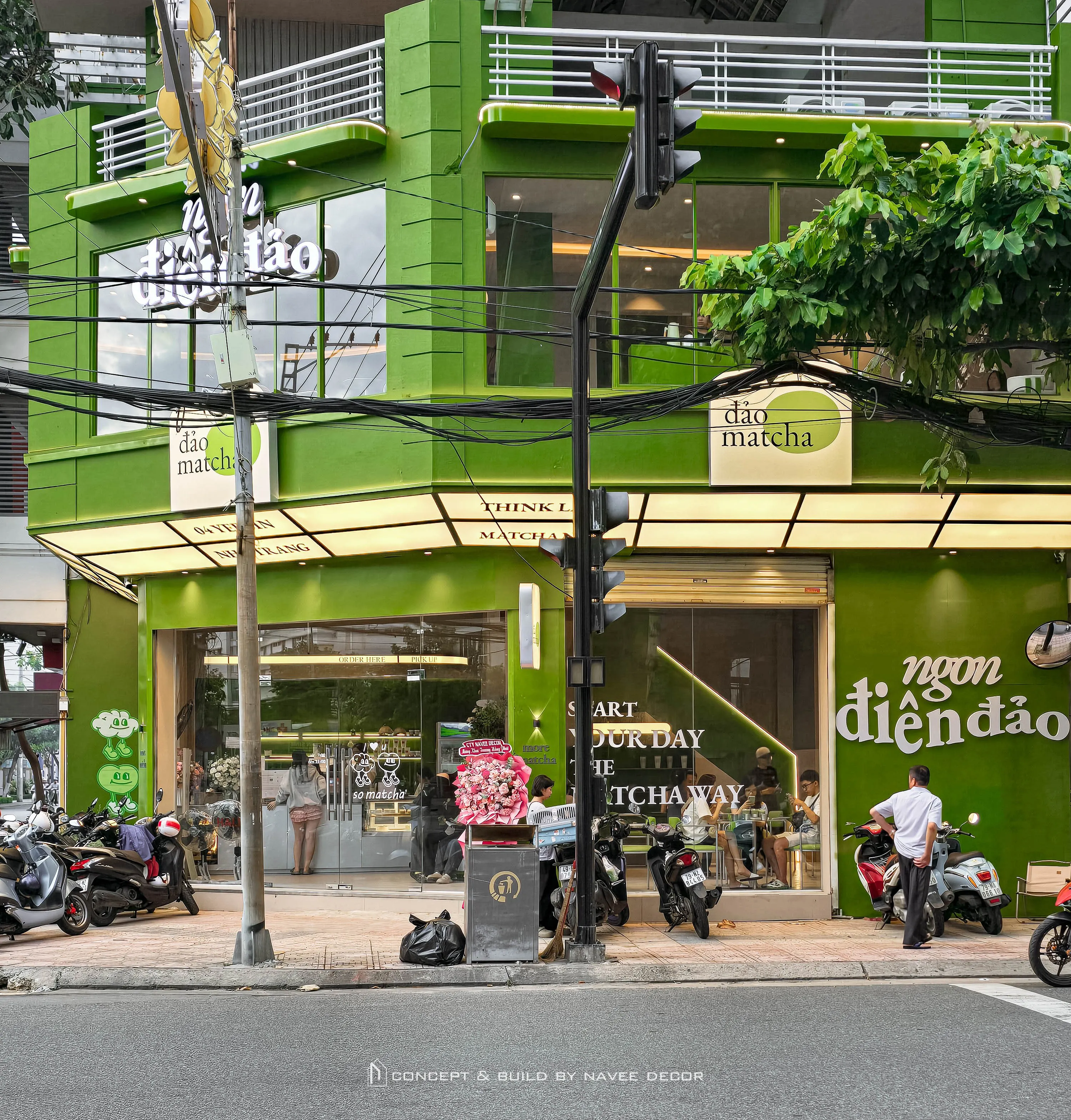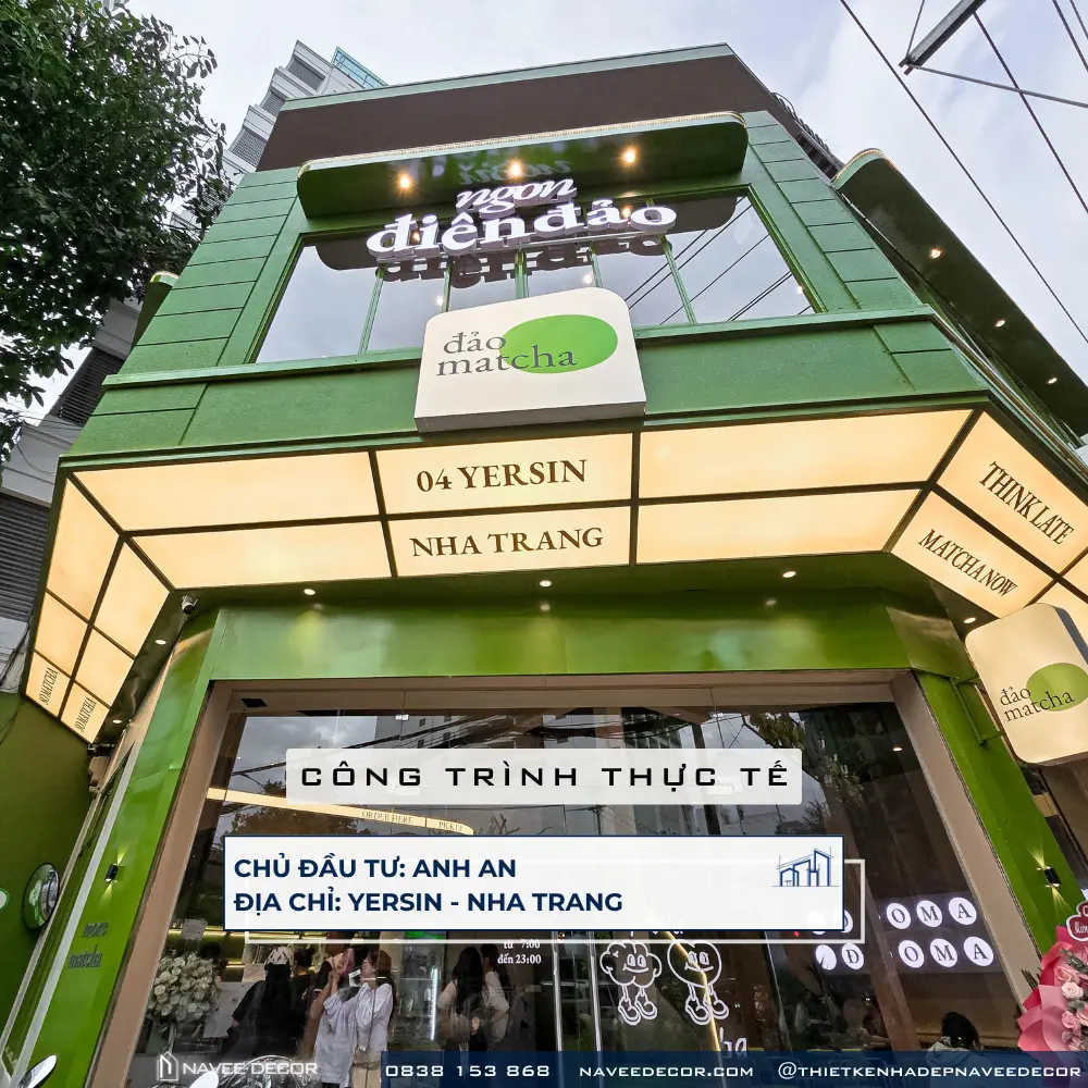 Tọa lạc tại vị trí góc phố với hai mặt tiền đắt giá, Đảo Matcha được định hình như một “điểm chạm thị giác” nổi bật giữa không gian đô thị. Giải pháp thi công nội thất tập trung vào nhận diện thương hiệu ngay từ kiến trúc, với tone xanh matcha chủ đạo kết hợp hệ ánh sáng vàng ấm – hiệu ứng thị giác mạnh mẽ cả ngày lẫn đêm.