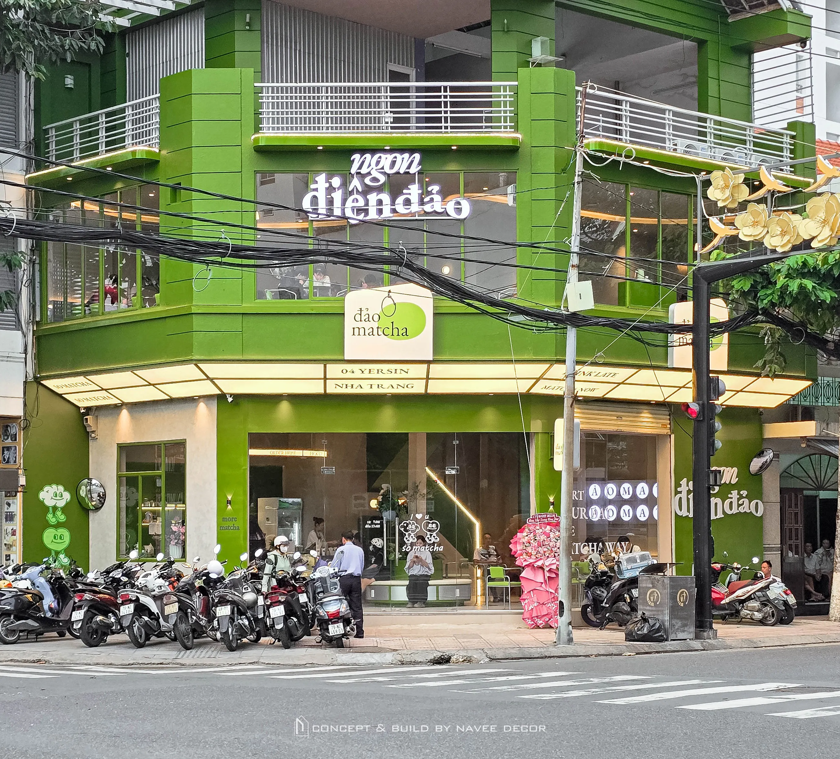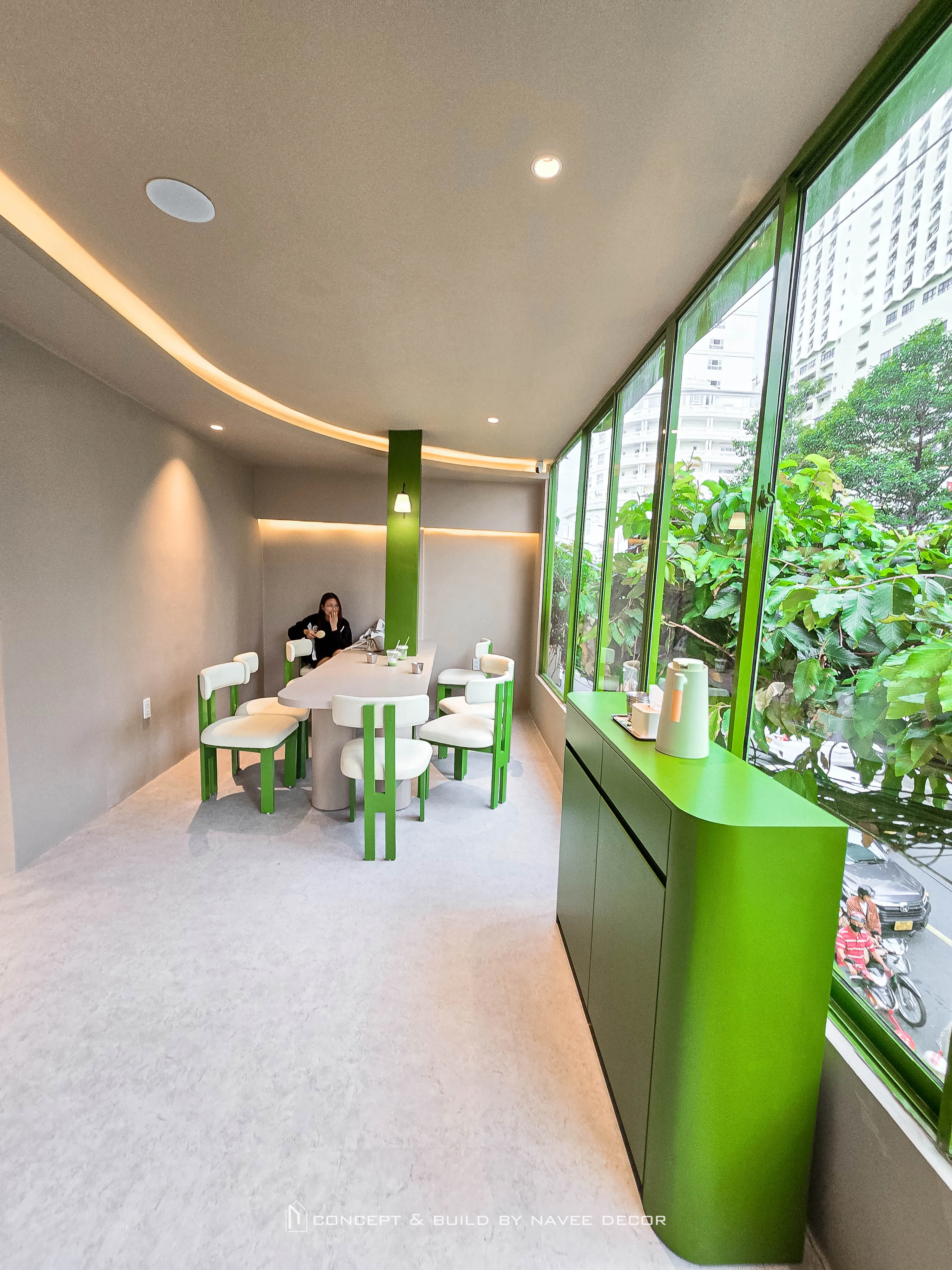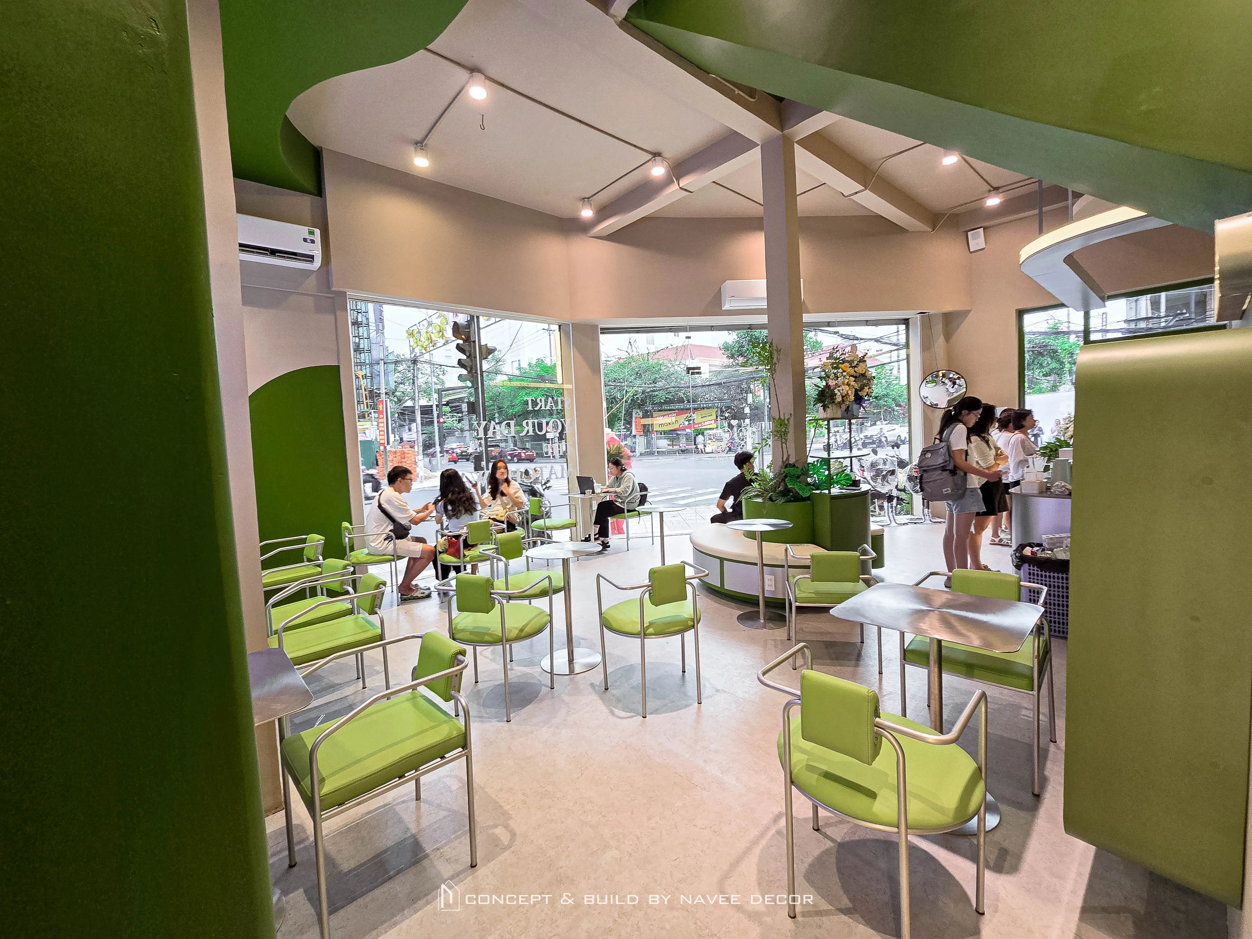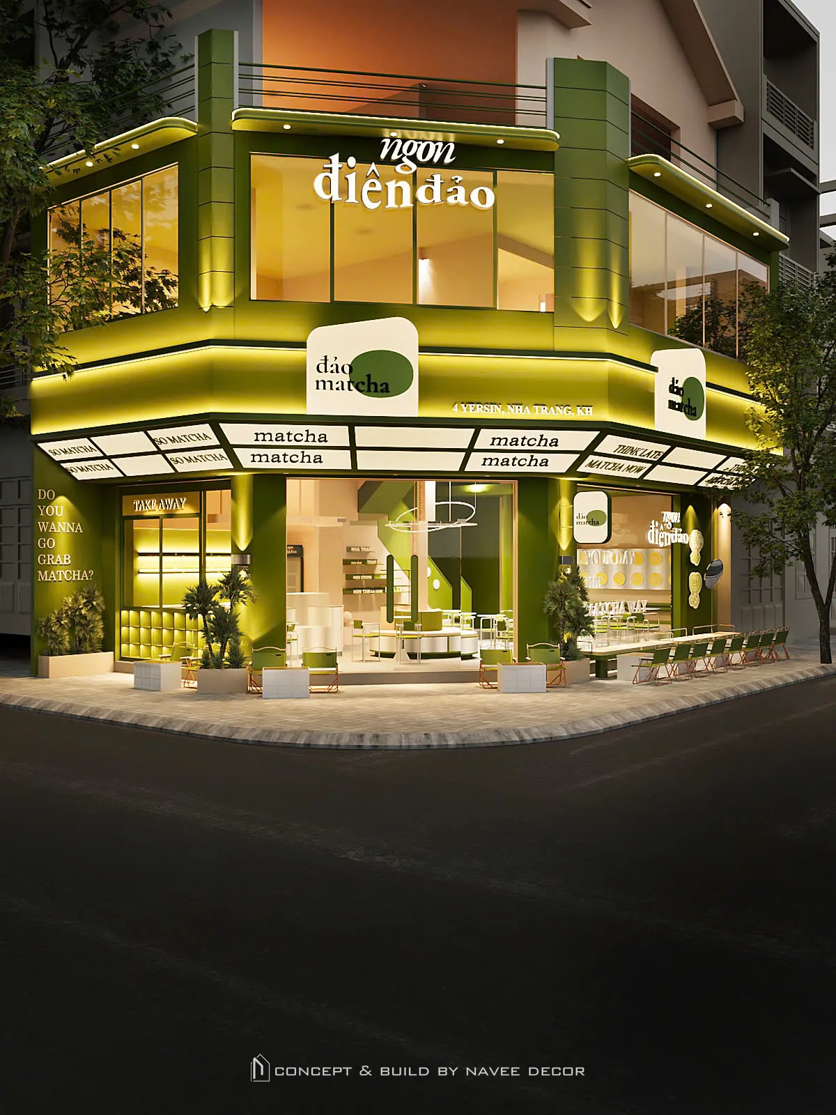 Tọa lạc tại vị trí góc phố với hai mặt tiền đắt giá, Đảo Matcha được định hình như một “điểm chạm thị giác” nổi bật giữa không gian đô thị. Giải pháp thi công nội thất tập trung vào nhận diện thương hiệu ngay từ kiến trúc, với tone xanh matcha chủ đạo kết hợp hệ ánh sáng vàng ấm – hiệu ứng thị giác mạnh mẽ cả ngày lẫn đêm.