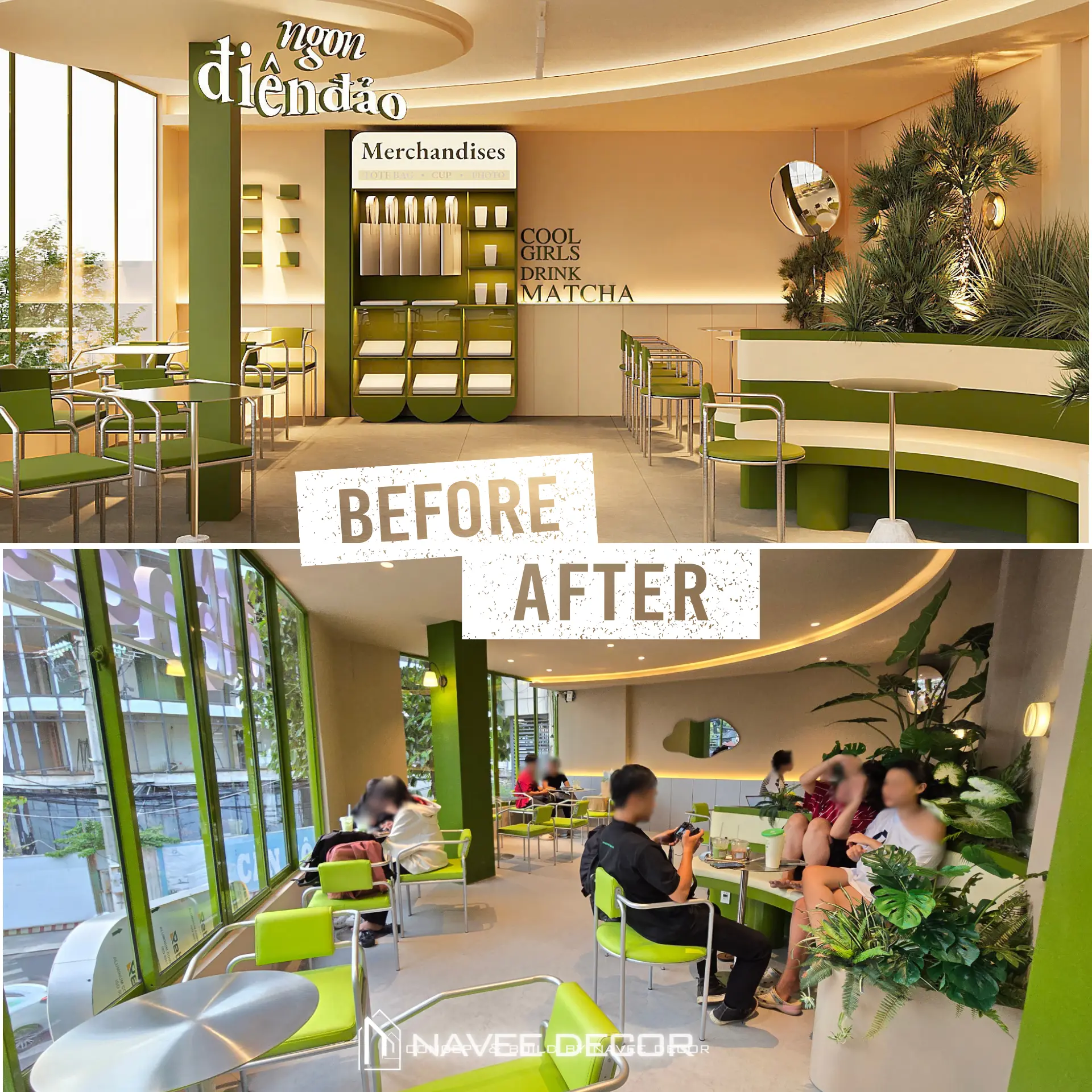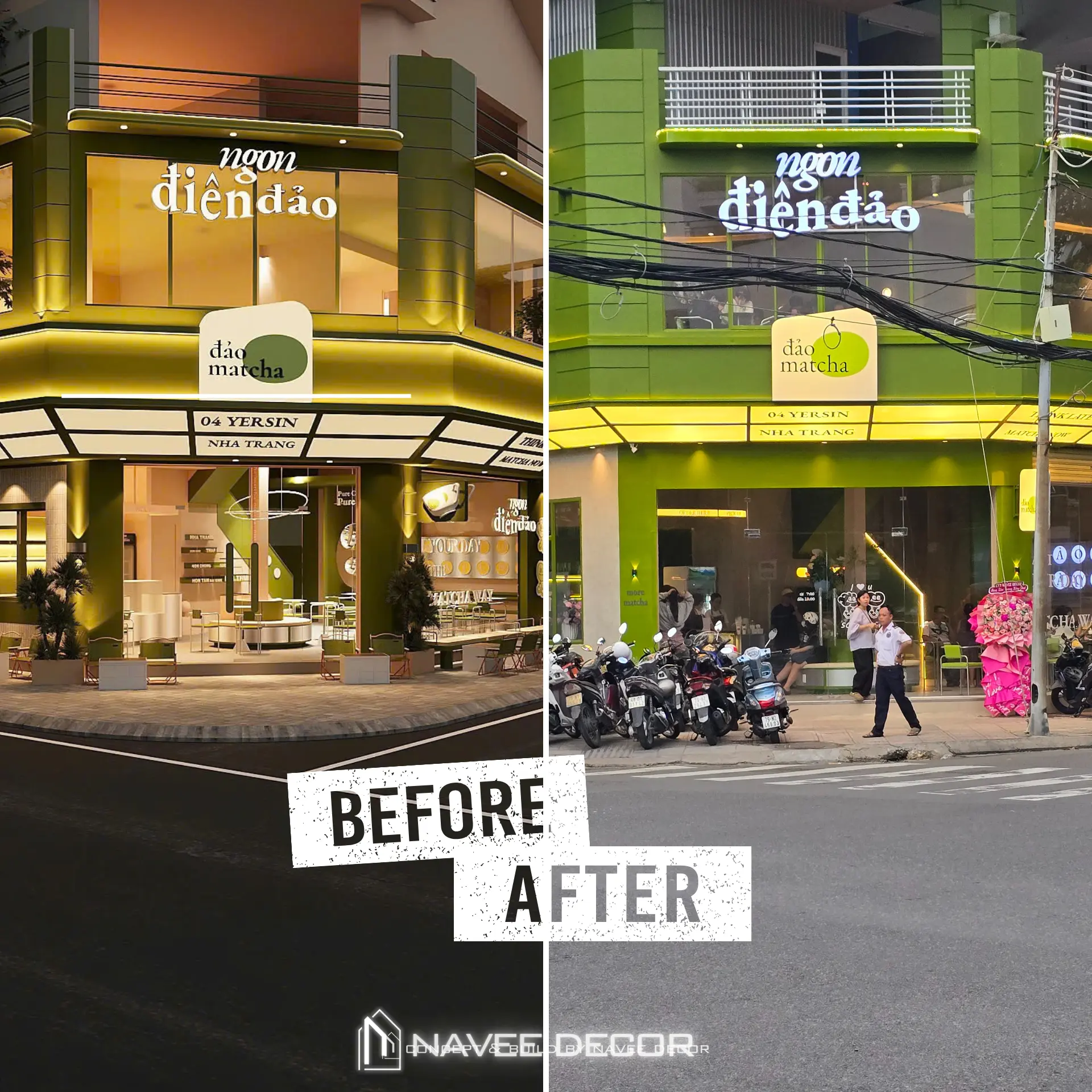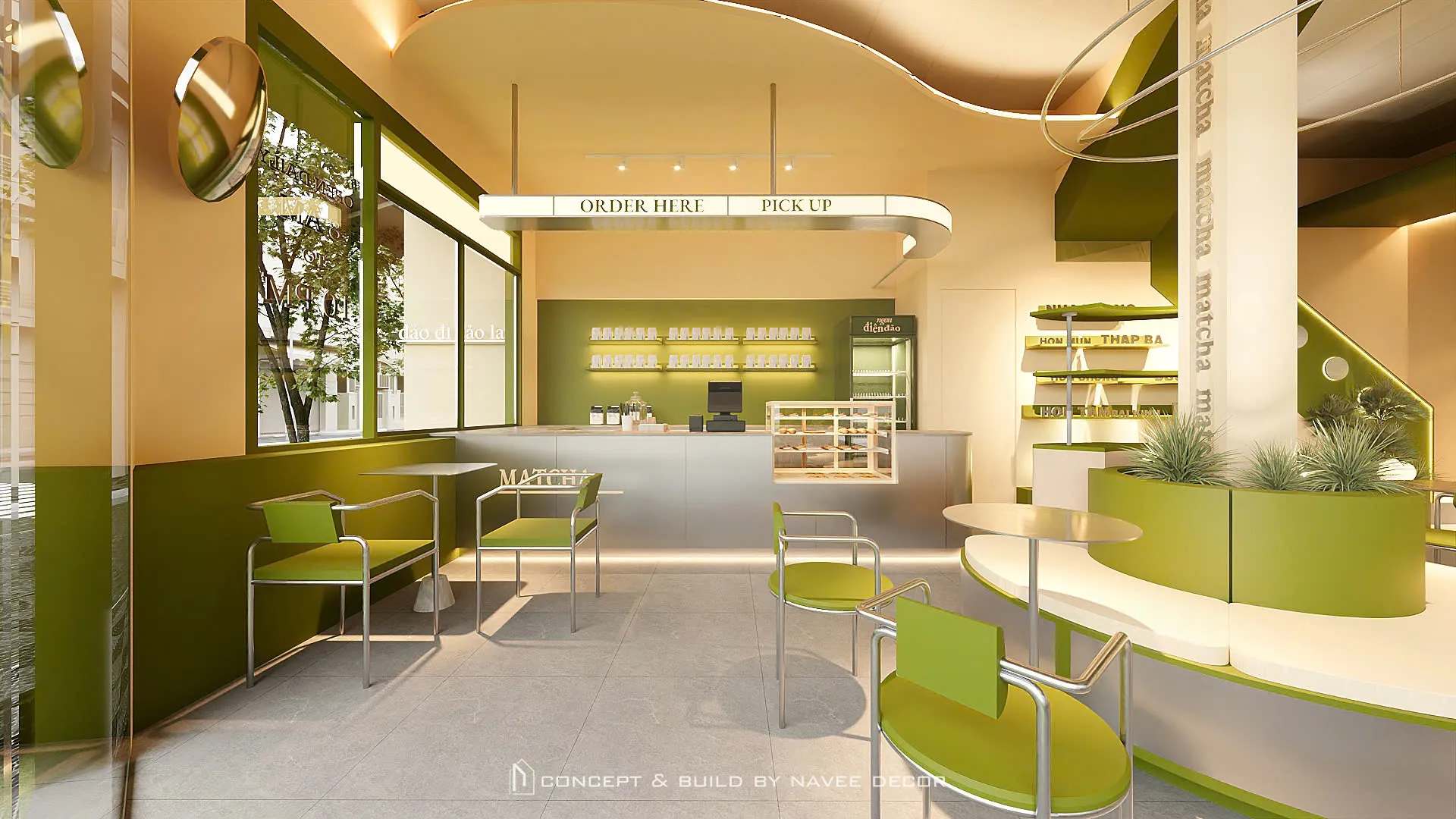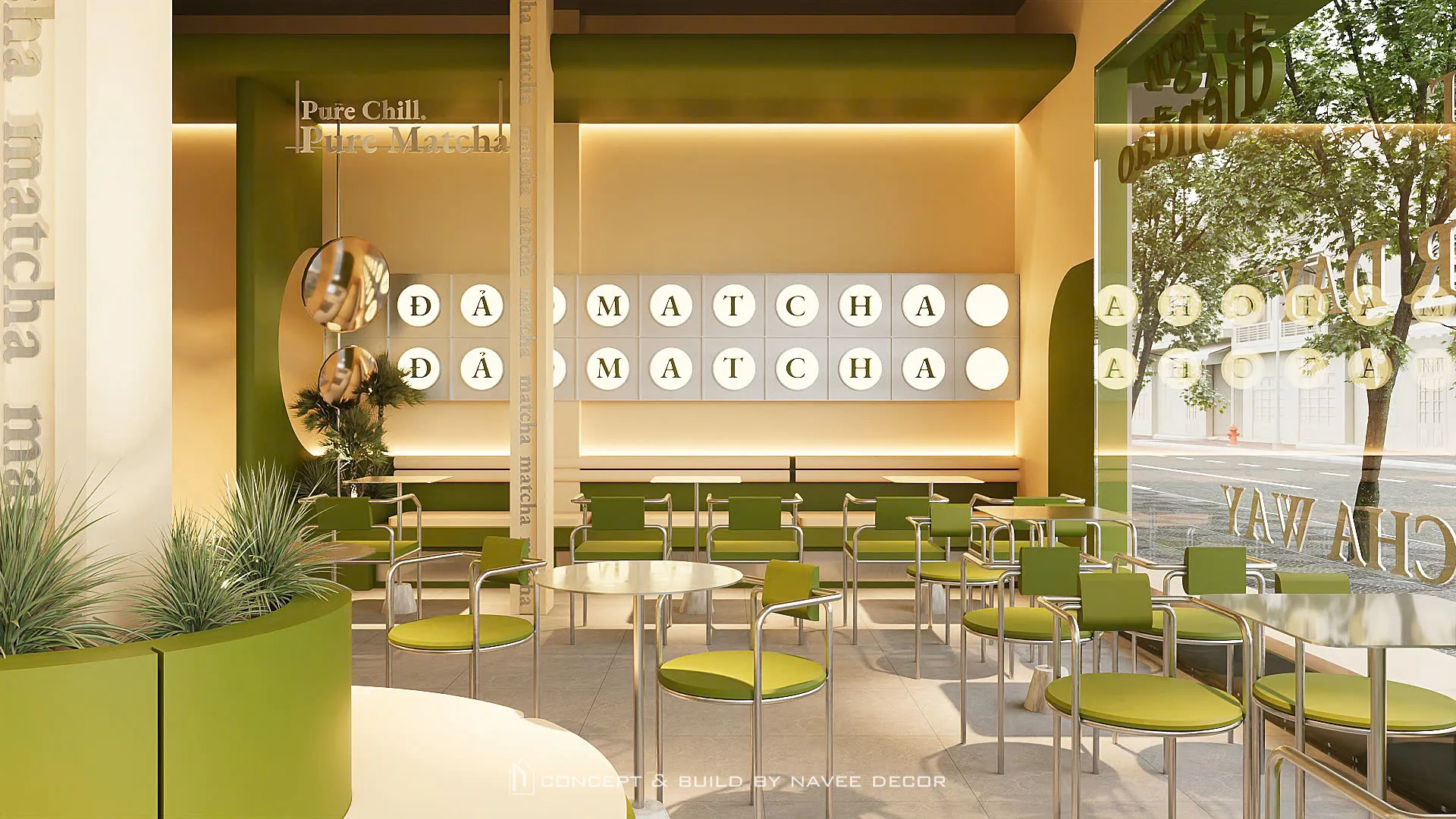 Tọa lạc tại vị trí góc phố với hai mặt tiền đắt giá, Đảo Matcha được định hình như một “điểm chạm thị giác” nổi bật giữa không gian đô thị. Giải pháp thi công nội thất tập trung vào nhận diện thương hiệu ngay từ kiến trúc, với tone xanh matcha chủ đạo kết hợp hệ ánh sáng vàng ấm – hiệu ứng thị giác mạnh mẽ cả ngày lẫn đêm.