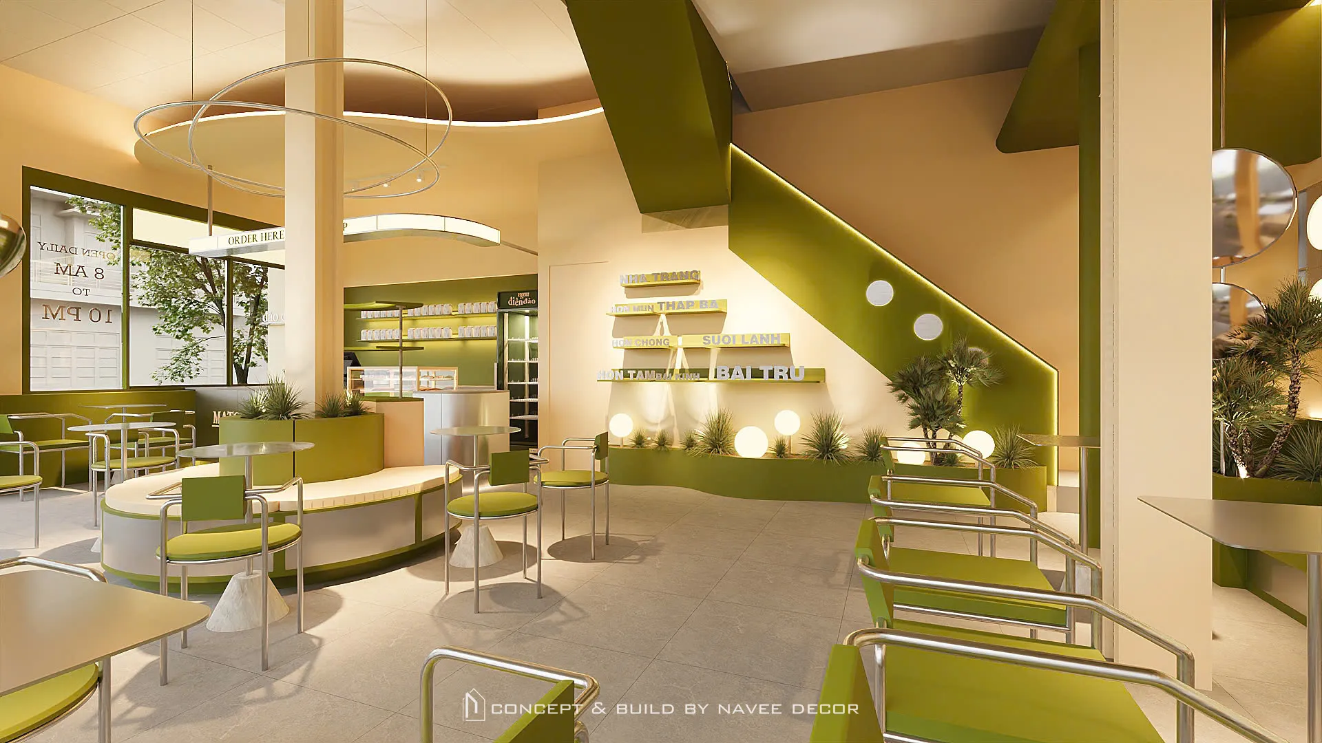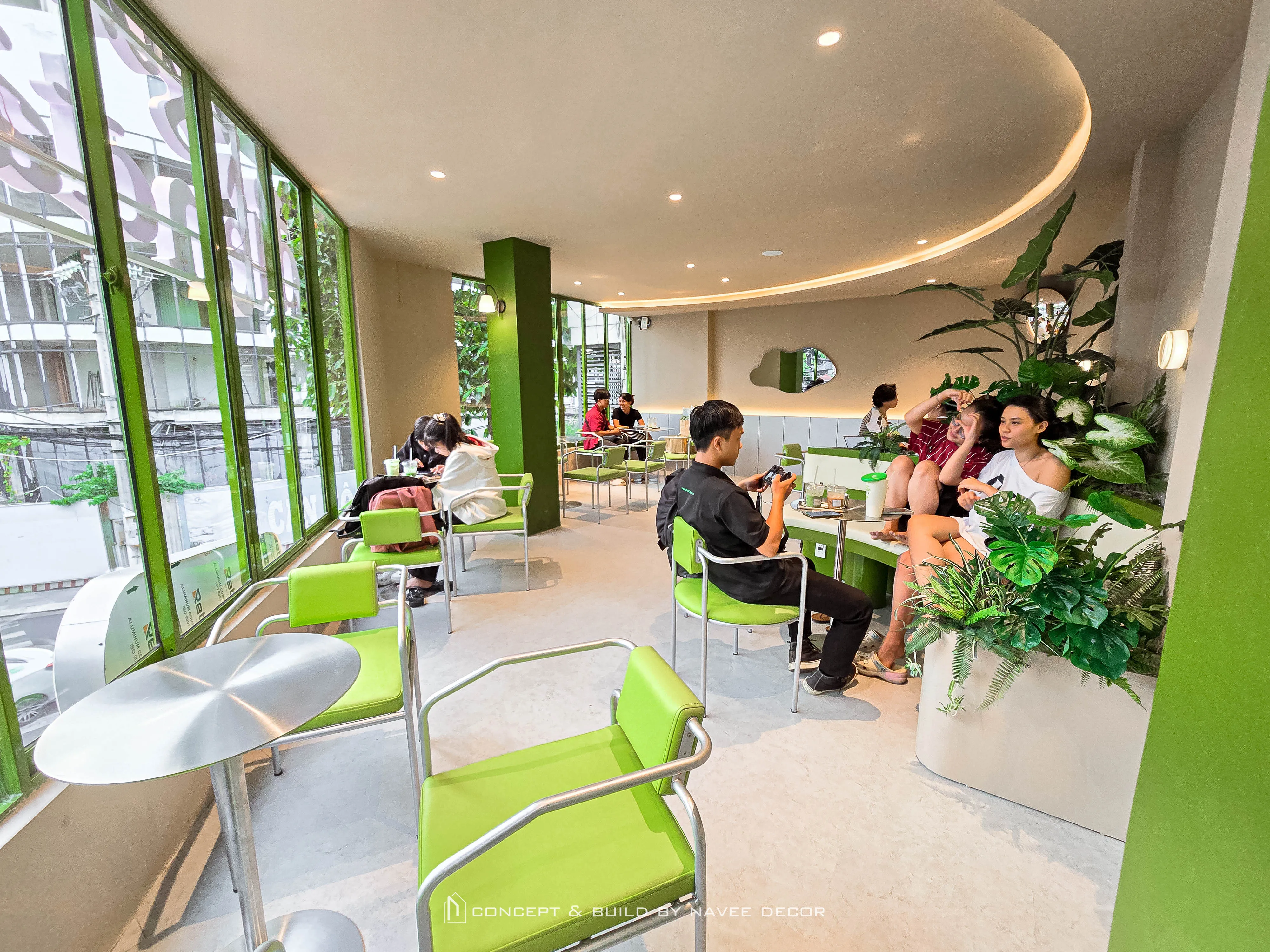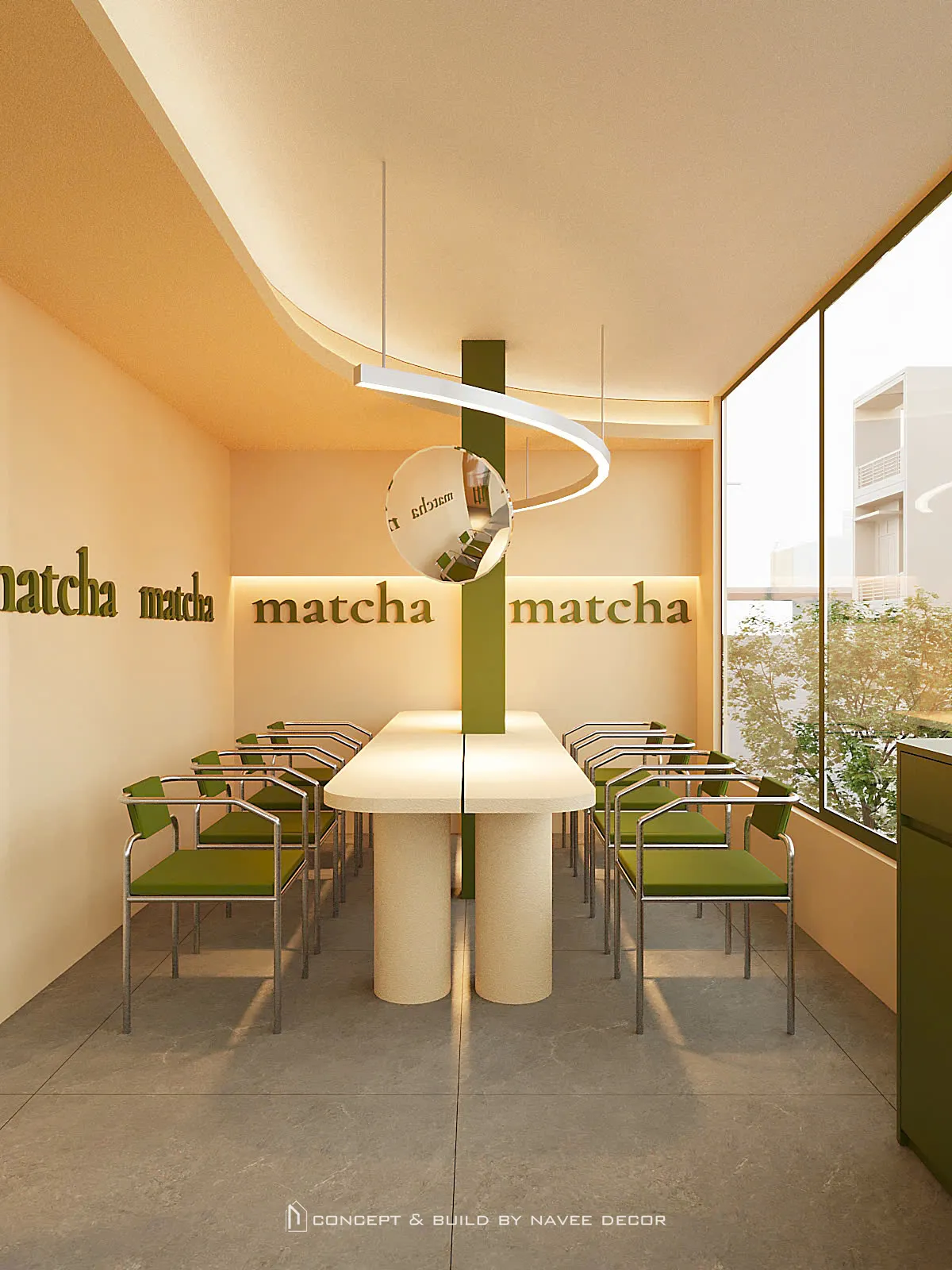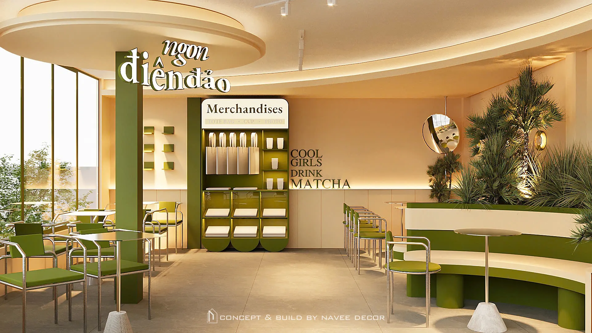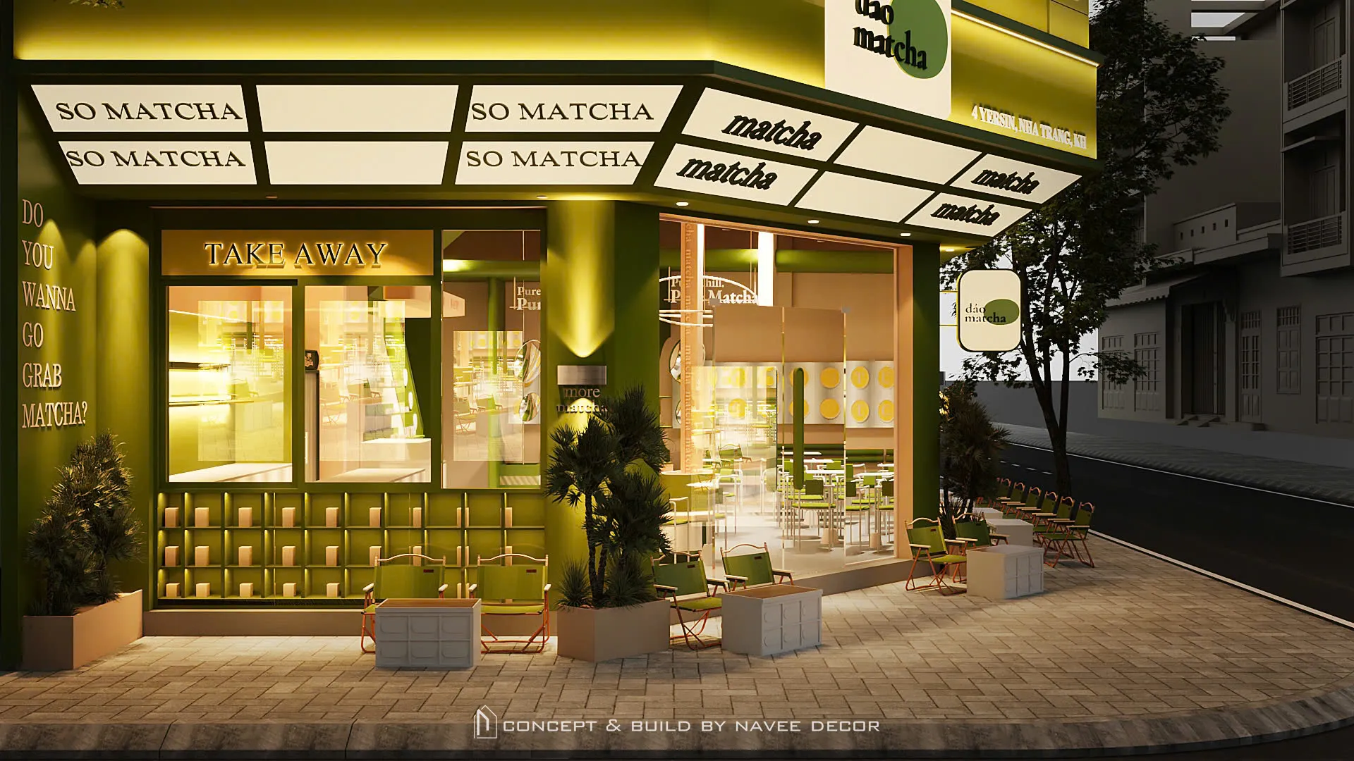 Tọa lạc tại vị trí góc phố với hai mặt tiền đắt giá, Đảo Matcha được định hình như một “điểm chạm thị giác” nổi bật giữa không gian đô thị. Giải pháp thi công nội thất tập trung vào nhận diện thương hiệu ngay từ kiến trúc, với tone xanh matcha chủ đạo kết hợp hệ ánh sáng vàng ấm – hiệu ứng thị giác mạnh mẽ cả ngày lẫn đêm.