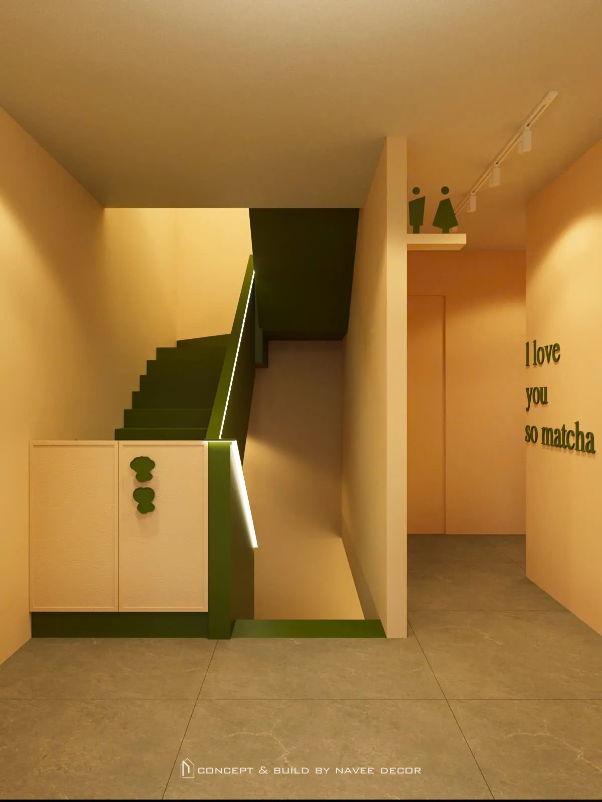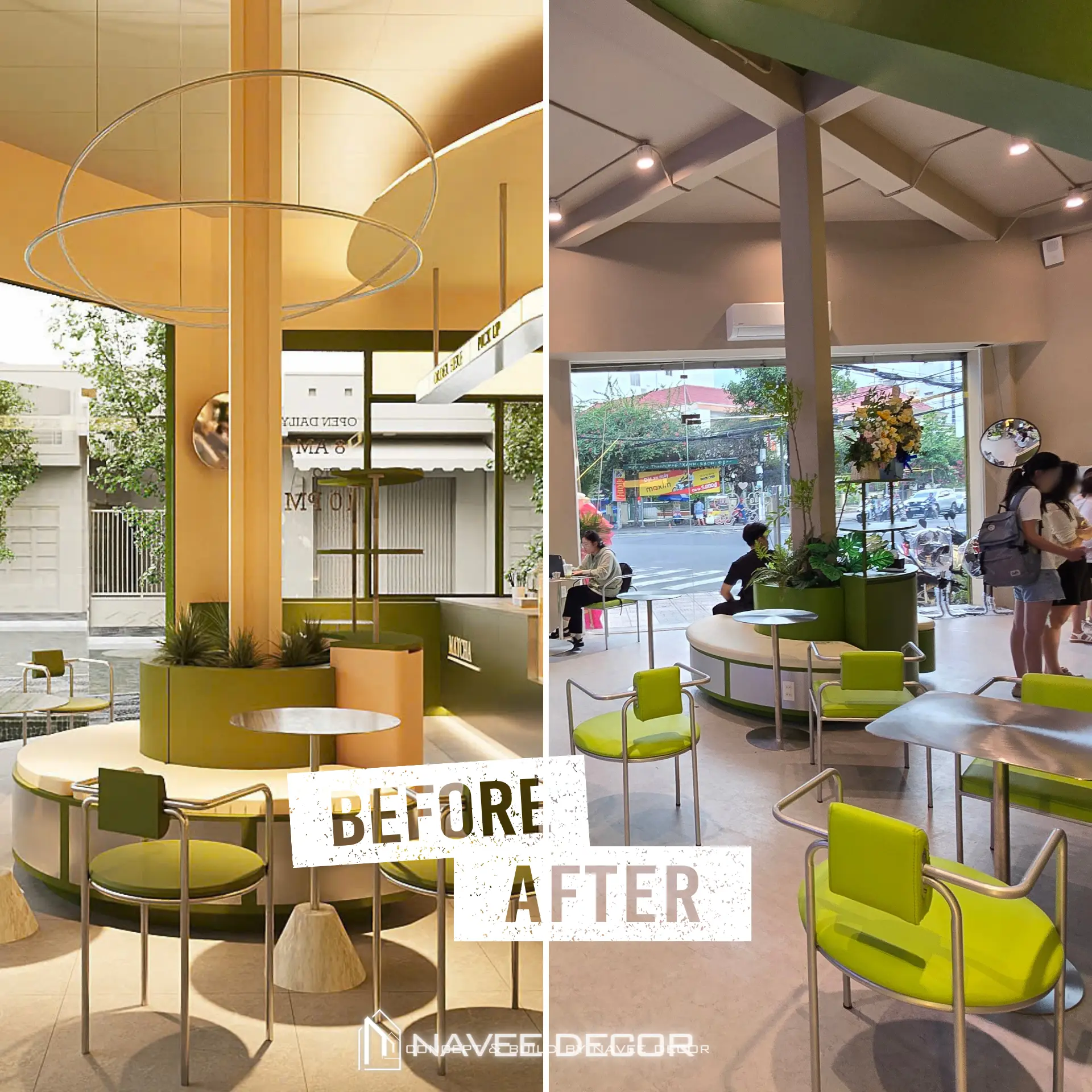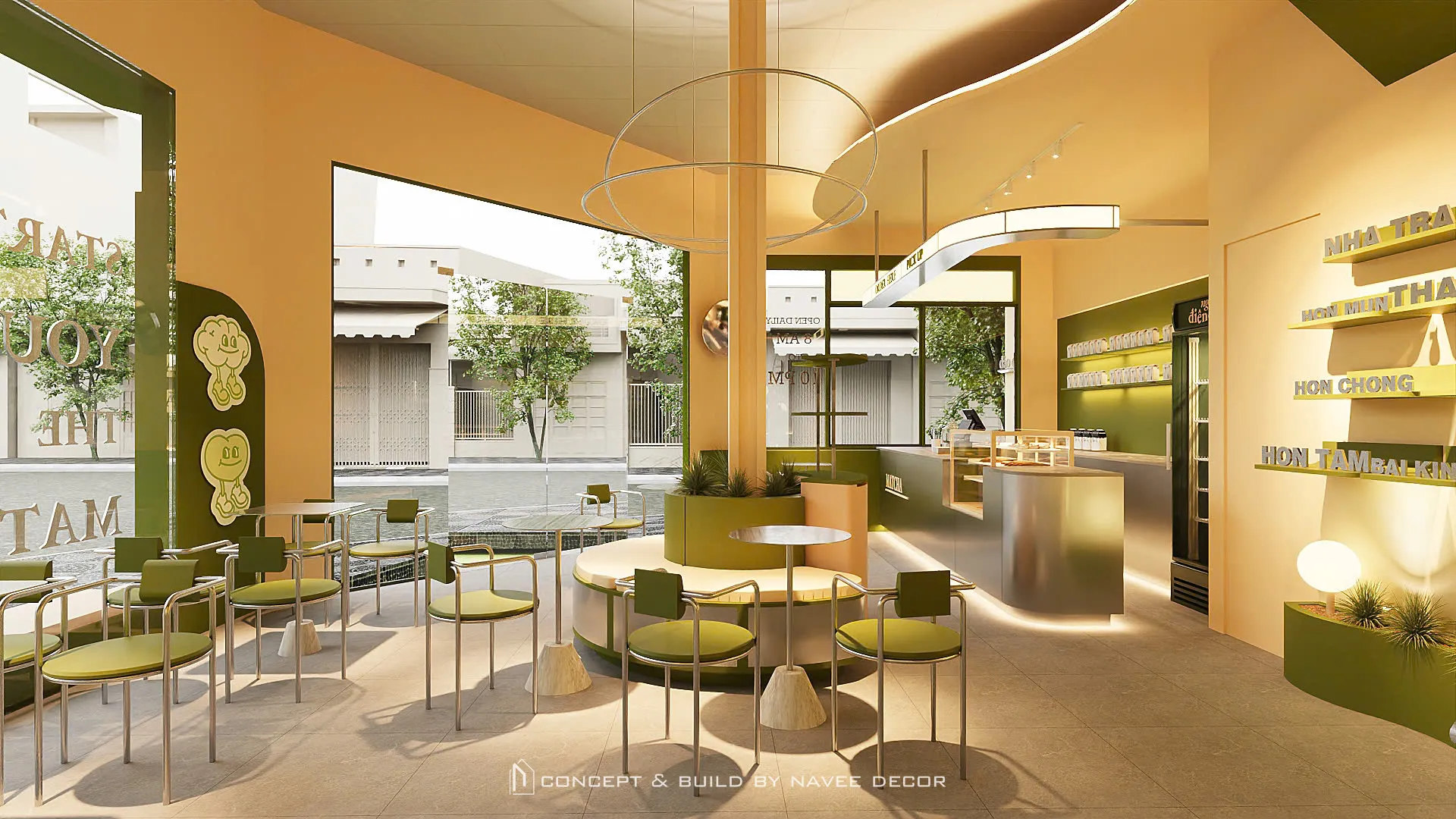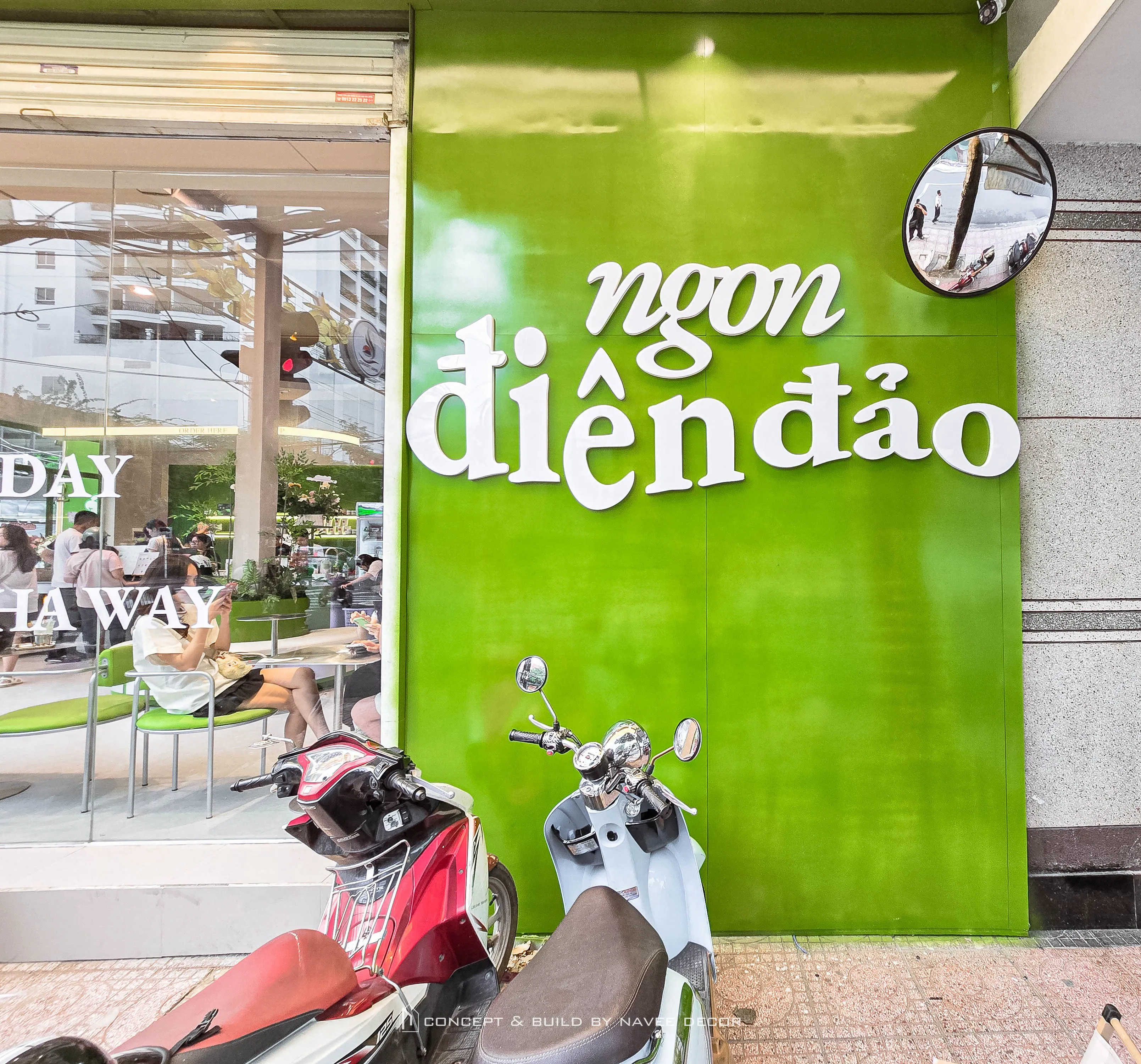 Tọa lạc tại vị trí góc phố với hai mặt tiền đắt giá, Đảo Matcha được định hình như một “điểm chạm thị giác” nổi bật giữa không gian đô thị. Giải pháp thi công nội thất tập trung vào nhận diện thương hiệu ngay từ kiến trúc, với tone xanh matcha chủ đạo kết hợp hệ ánh sáng vàng ấm – hiệu ứng thị giác mạnh mẽ cả ngày lẫn đêm.
