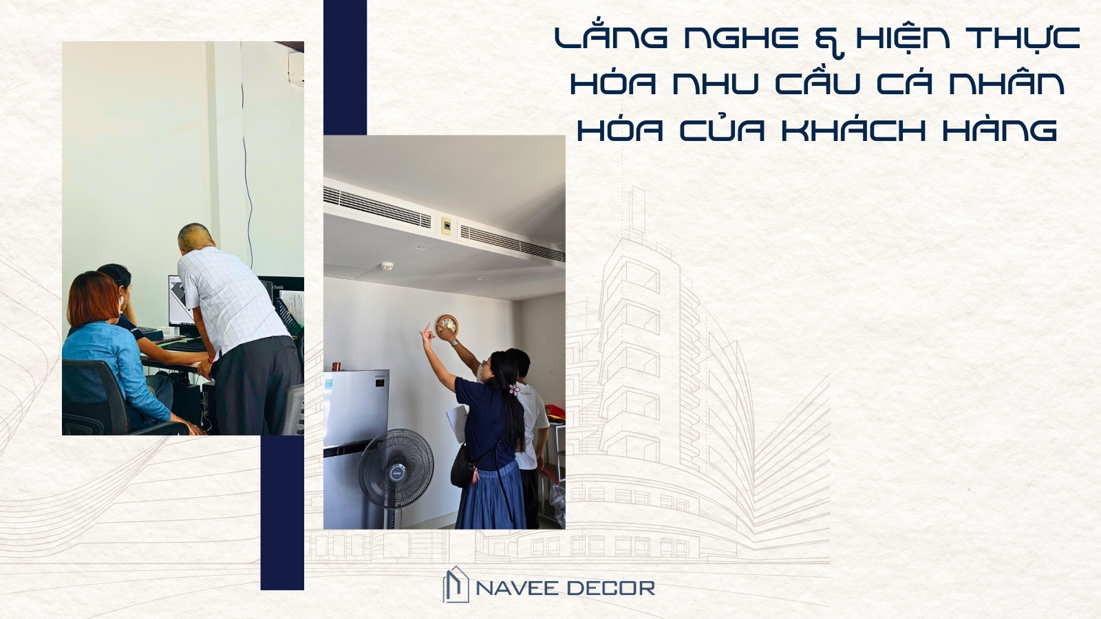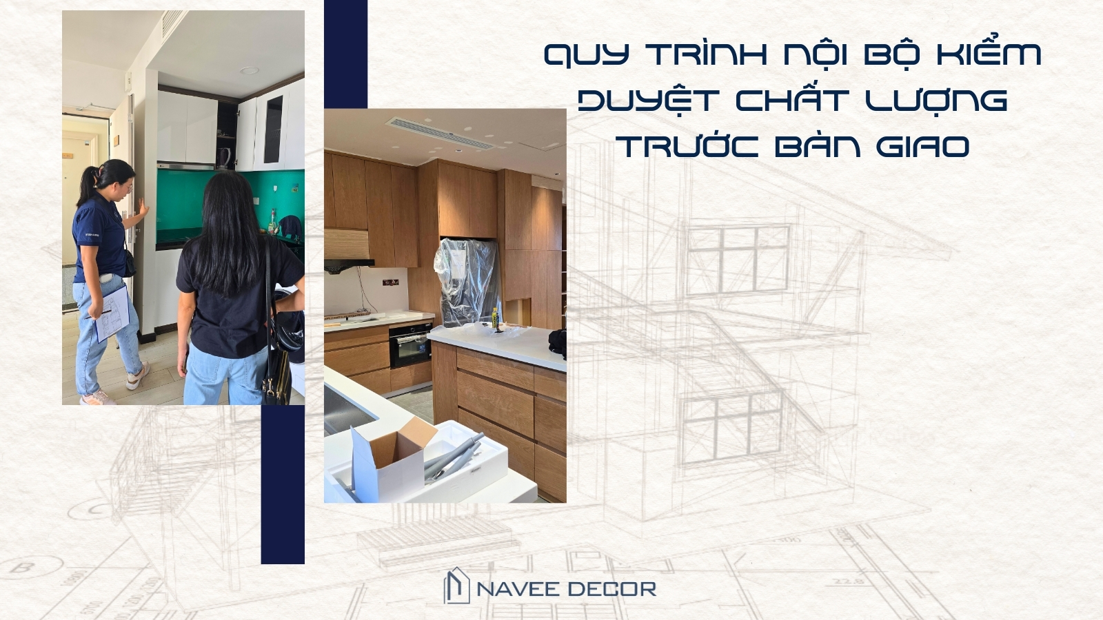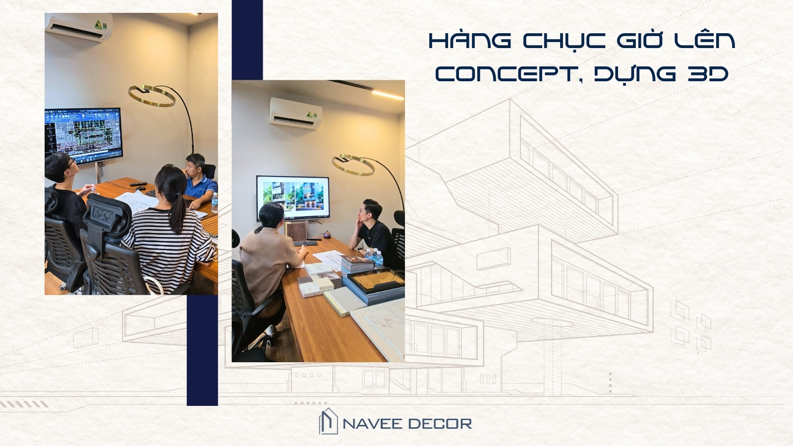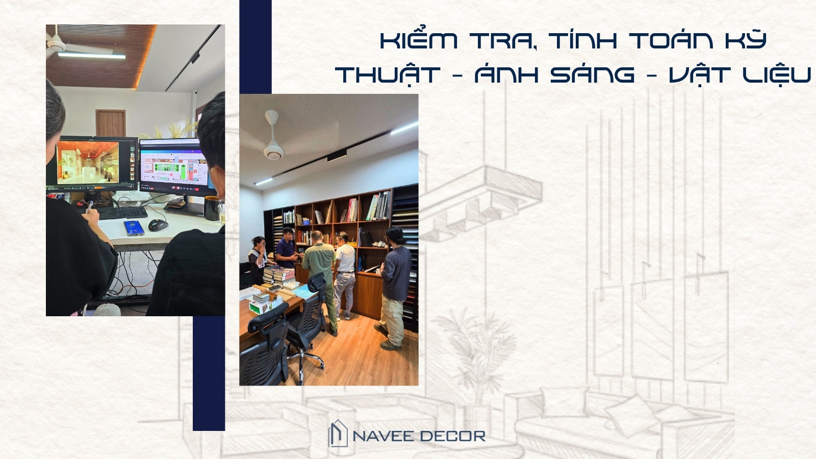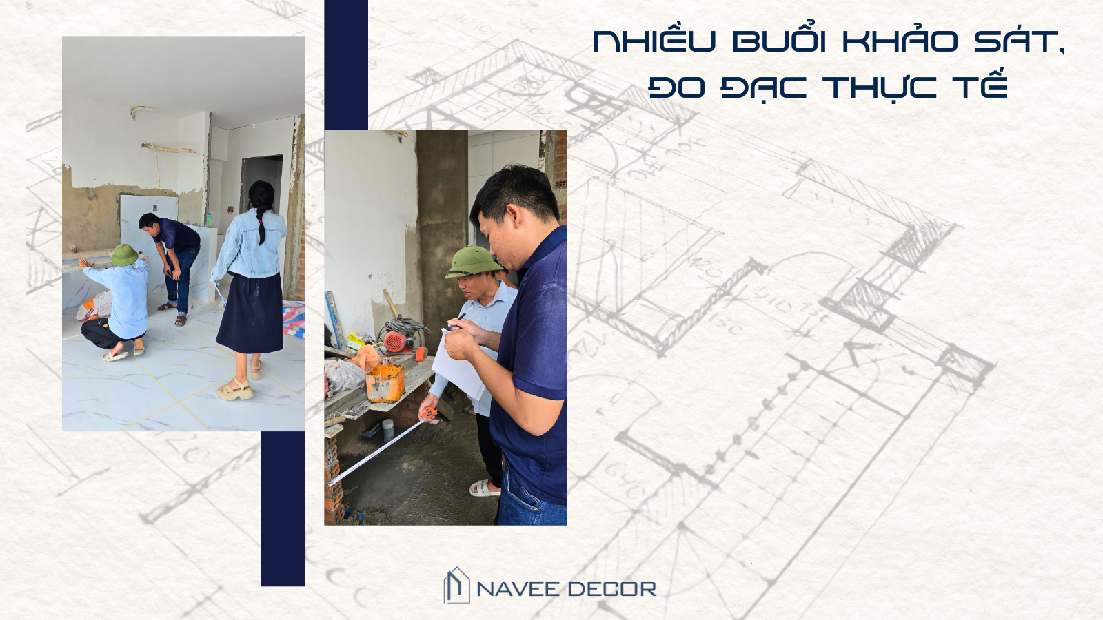 Mỗi bộ hồ sơ thiết kế tại NAVEE DECOR được hình thành từ nhiều bước làm việc thực tế, bao gồm khảo sát hiện trạng, đo đạc chi tiết và trao đổi trực tiếp với khách hàng. Từ đó, đội ngũ kiến trúc sư xây dựng concept không gian, dựng phối cảnh 3D và kiểm tra kỹ lưỡng các yếu tố kỹ thuật liên quan.