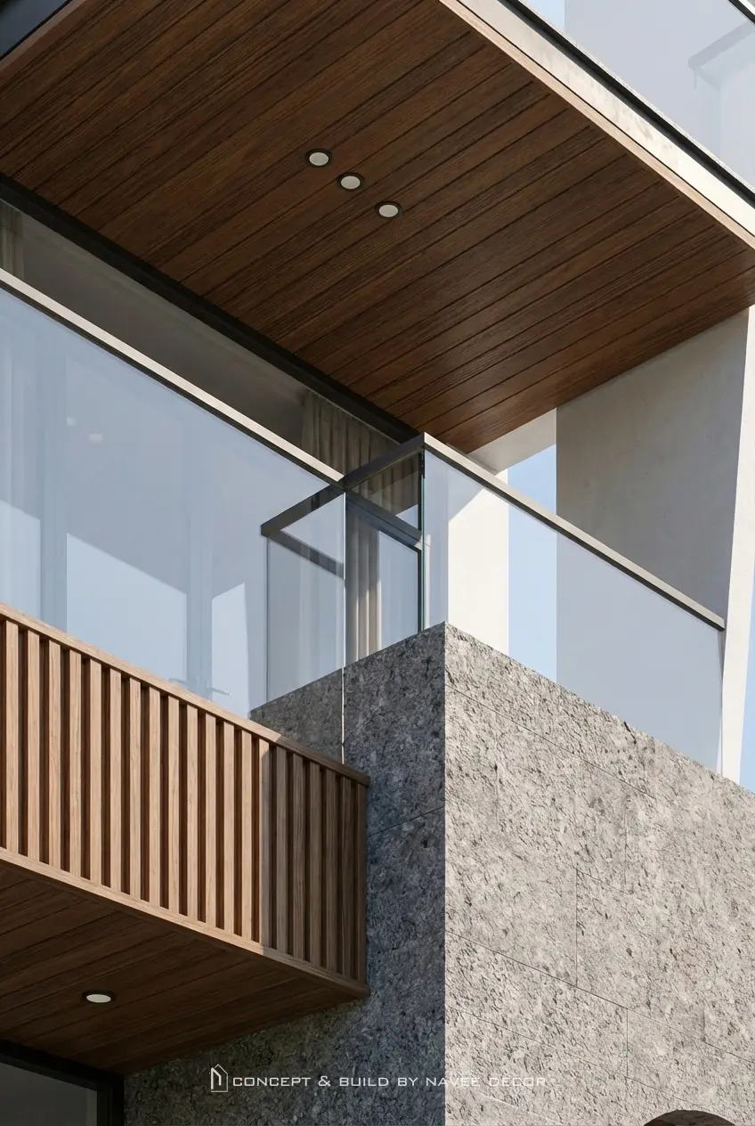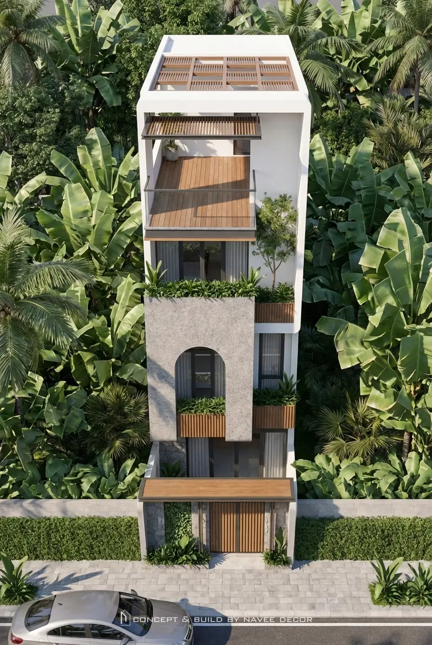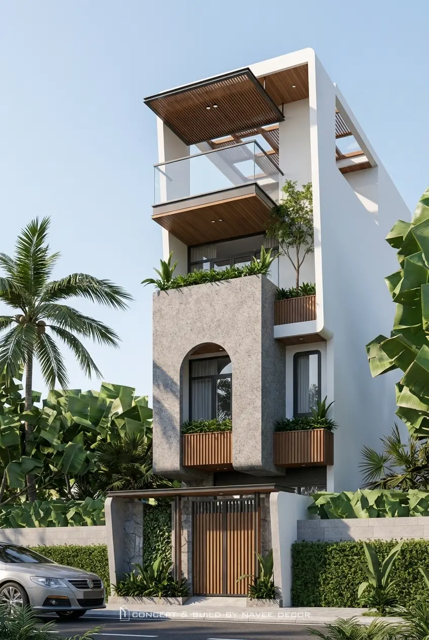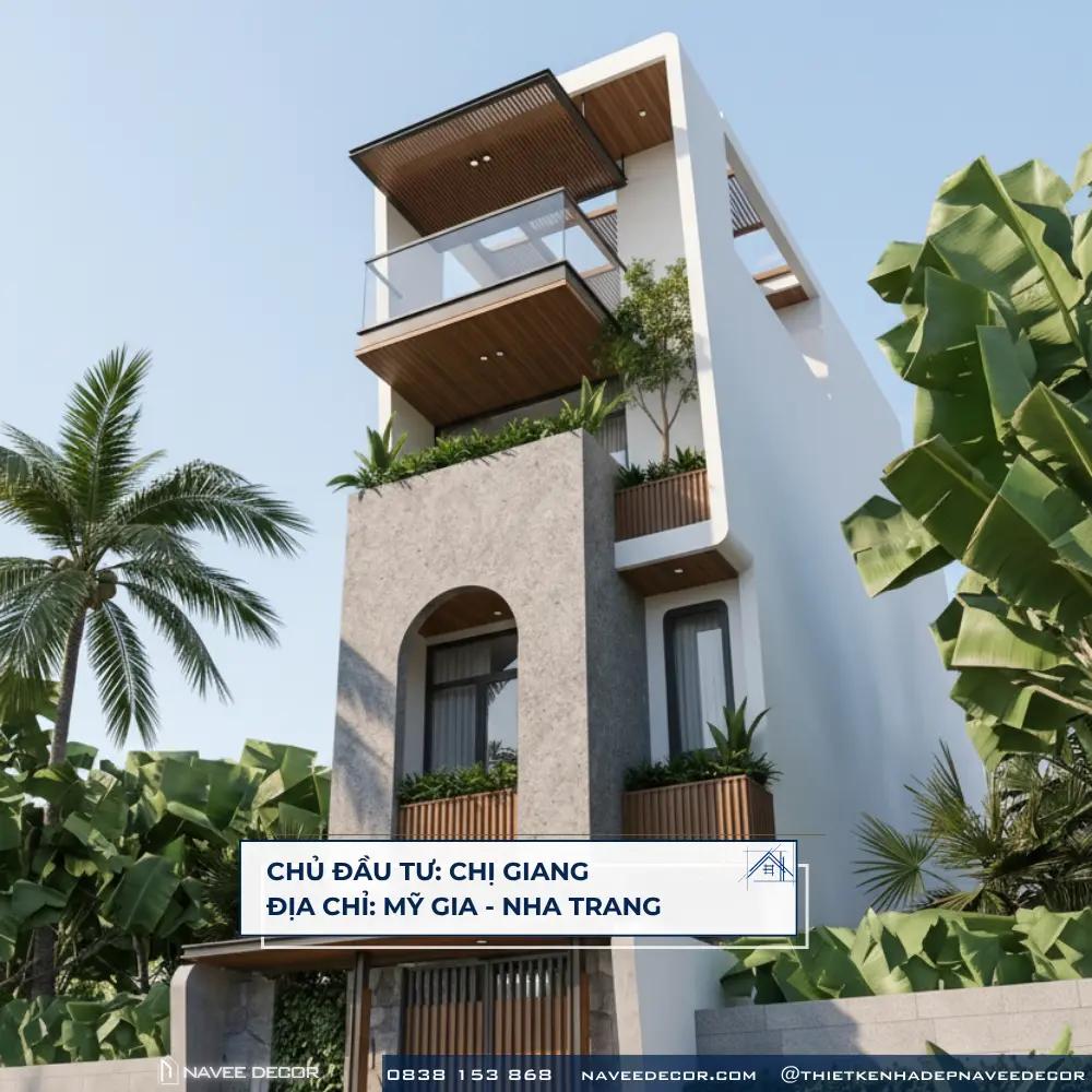 Điểm nhấn nổi bật ở hệ khối mặt tiền mạnh mẽ nhưng mềm mại, ban công kính và hệ lam che nắng giúp điều tiết ánh sáng – giảm bức xạ nhiệt. Cây xanh được bố trí xuyên suốt mặt đứng, đóng vai trò như lớp “lọc không khí” tự nhiên. Giải pháp này không chỉ mang tính thẩm mỹ mà còn tối ưu thông gió, đón sáng tự nhiên, đặc biệt phù hợp với khí hậu Nha Trang.