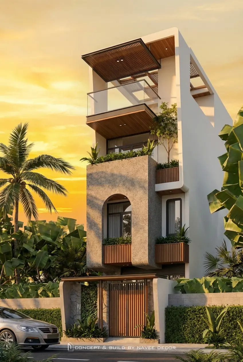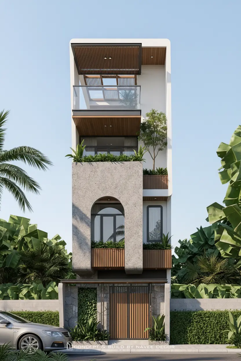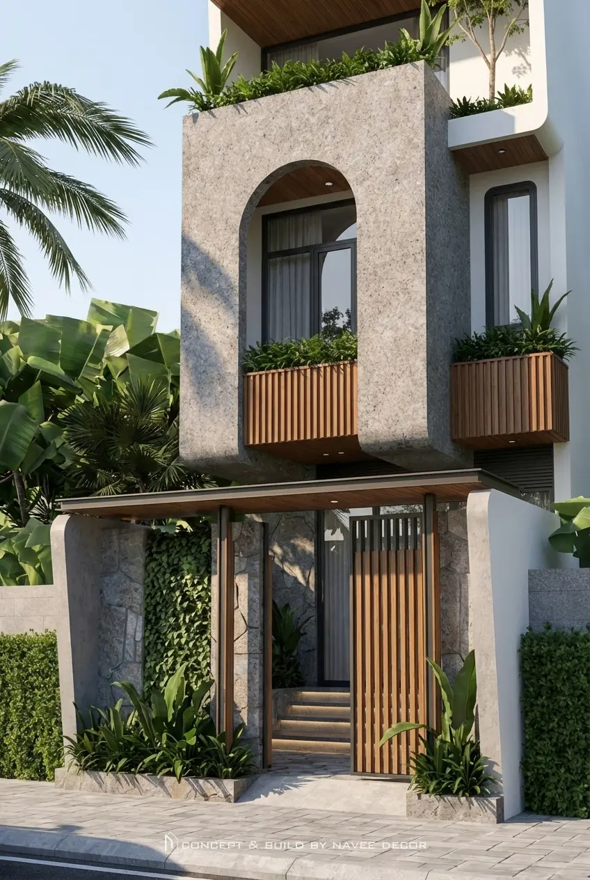 Điểm nhấn nổi bật ở hệ khối mặt tiền mạnh mẽ nhưng mềm mại, ban công kính và hệ lam che nắng giúp điều tiết ánh sáng – giảm bức xạ nhiệt. Cây xanh được bố trí xuyên suốt mặt đứng, đóng vai trò như lớp “lọc không khí” tự nhiên. Giải pháp này không chỉ mang tính thẩm mỹ mà còn tối ưu thông gió, đón sáng tự nhiên, đặc biệt phù hợp với khí hậu Nha Trang.