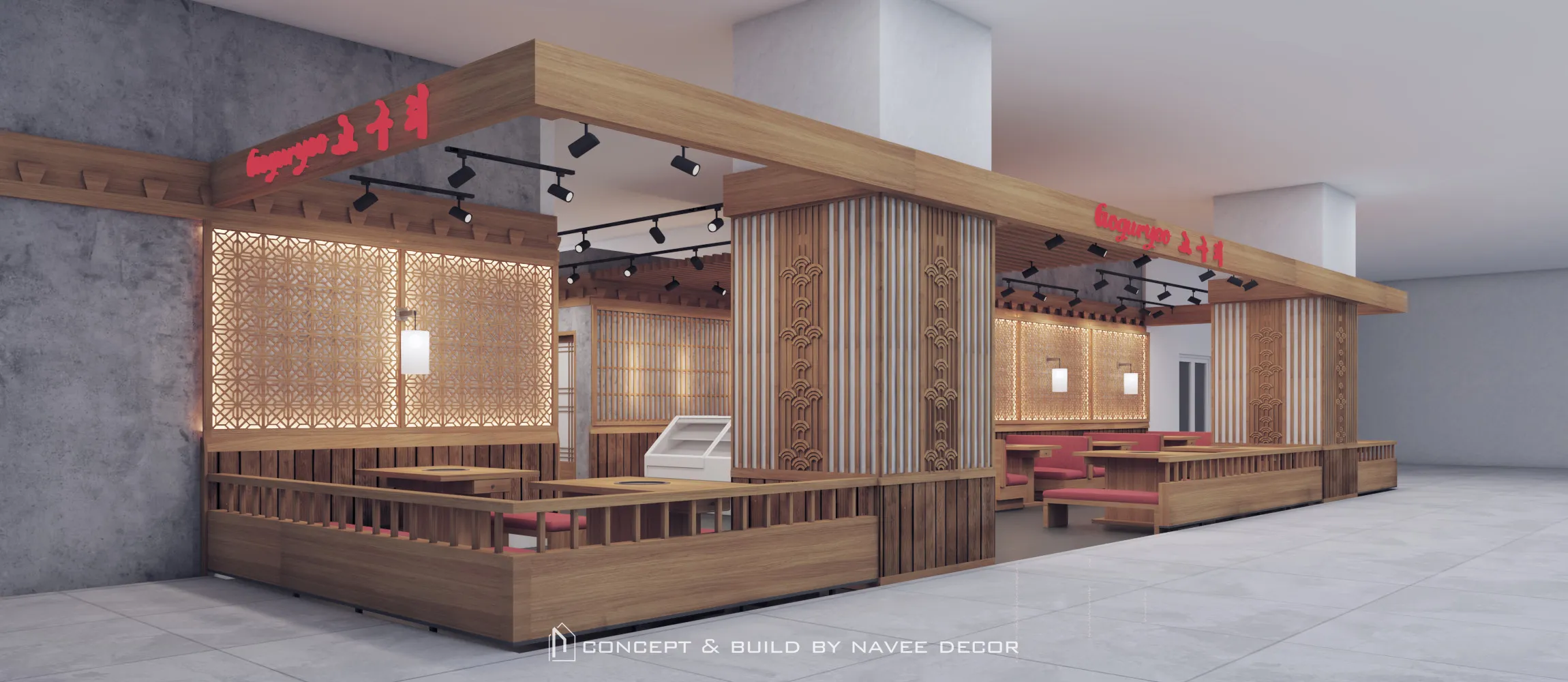 Hệ lam gỗ, vách lattice, họa tiết trang trí và khung kết cấu gỗ được sử dụng xuyên suốt, tạo nên bản sắc nhận diện rõ ràng cho thương hiệu. Gam màu gỗ tự nhiên kết hợp đỏ trầm không chỉ mang lại cảm giác ấm áp mà còn khéo léo gợi nhắc đến văn hóa ẩm thực đặc trưng của xứ sở kim chi.