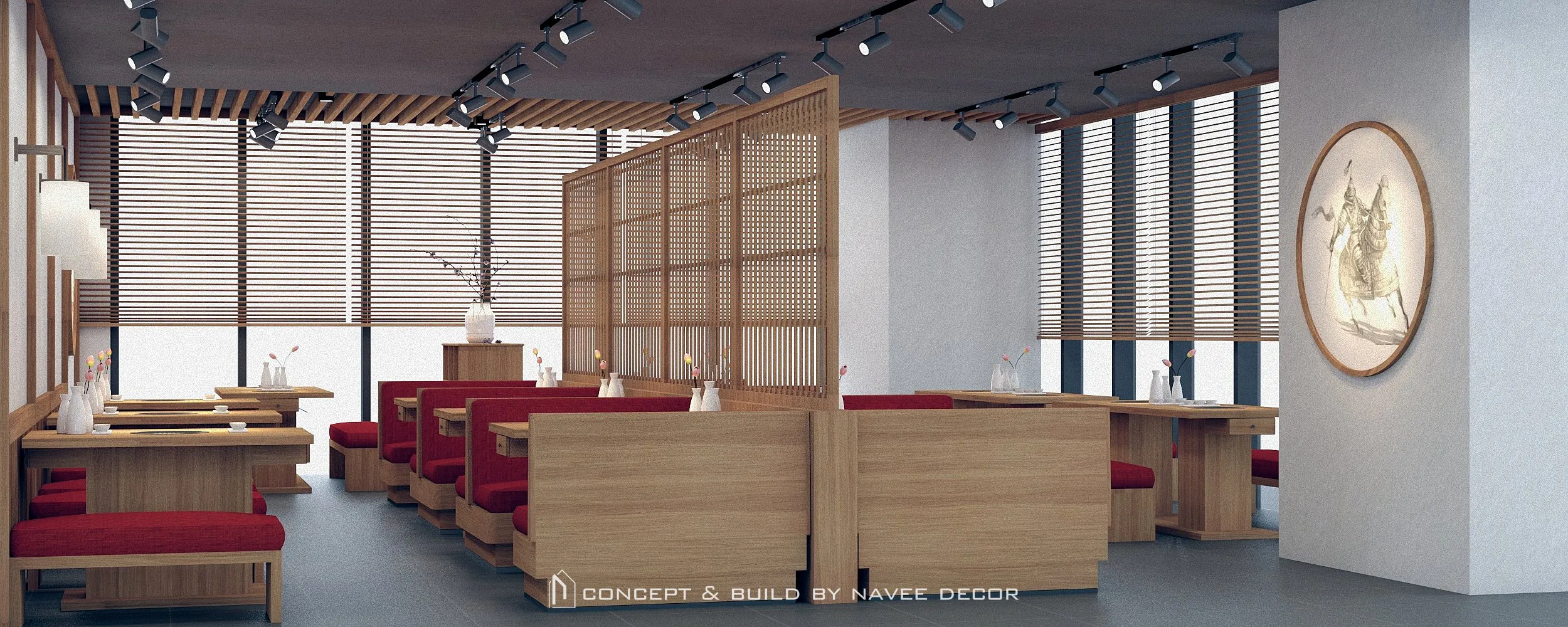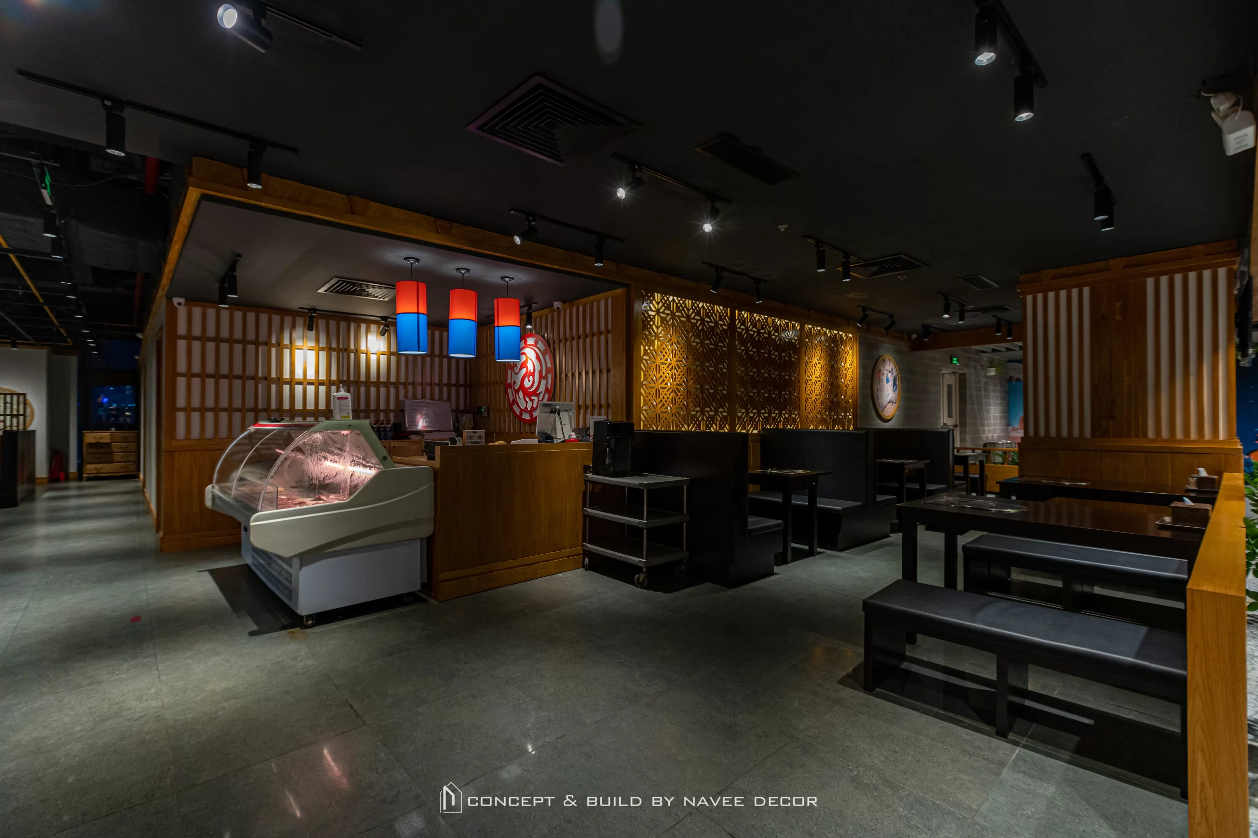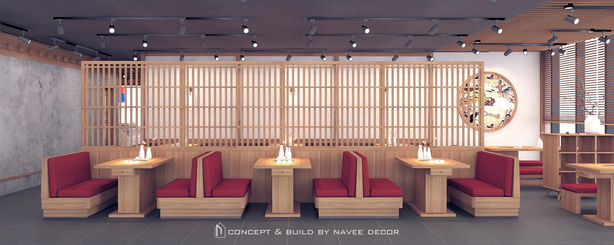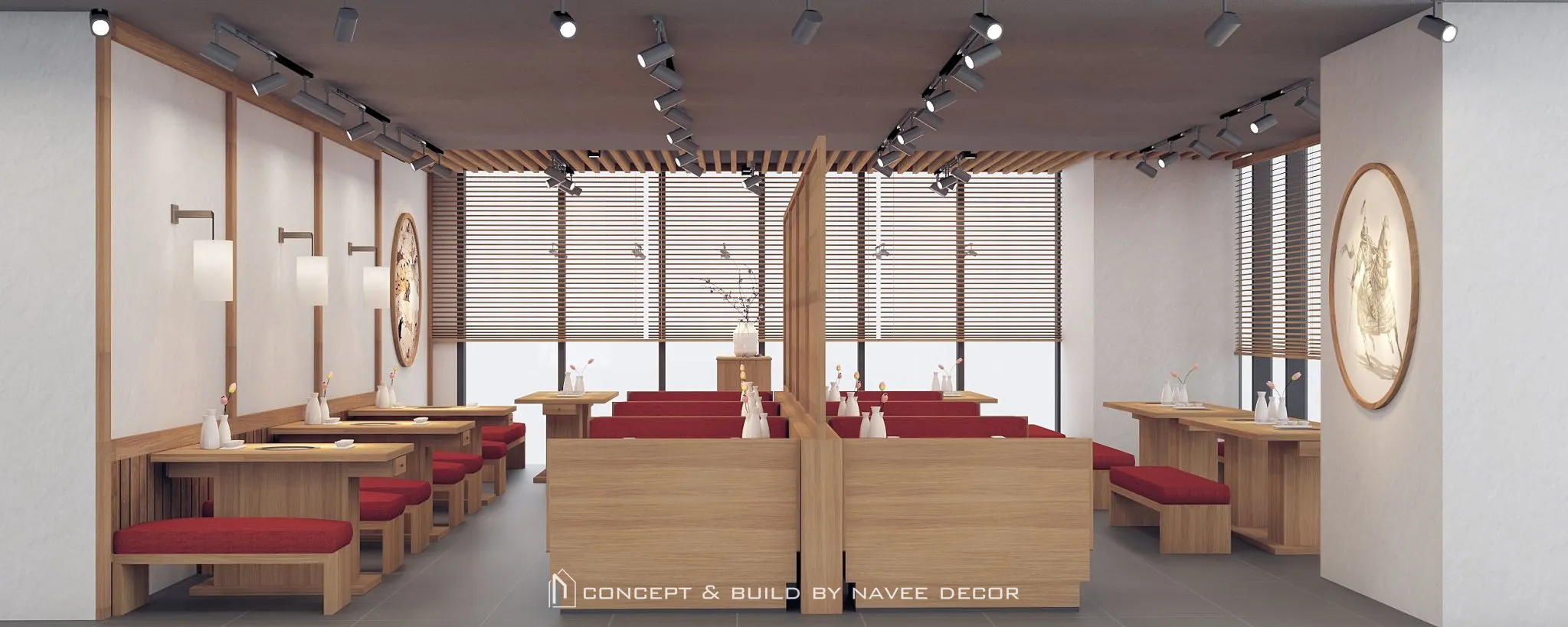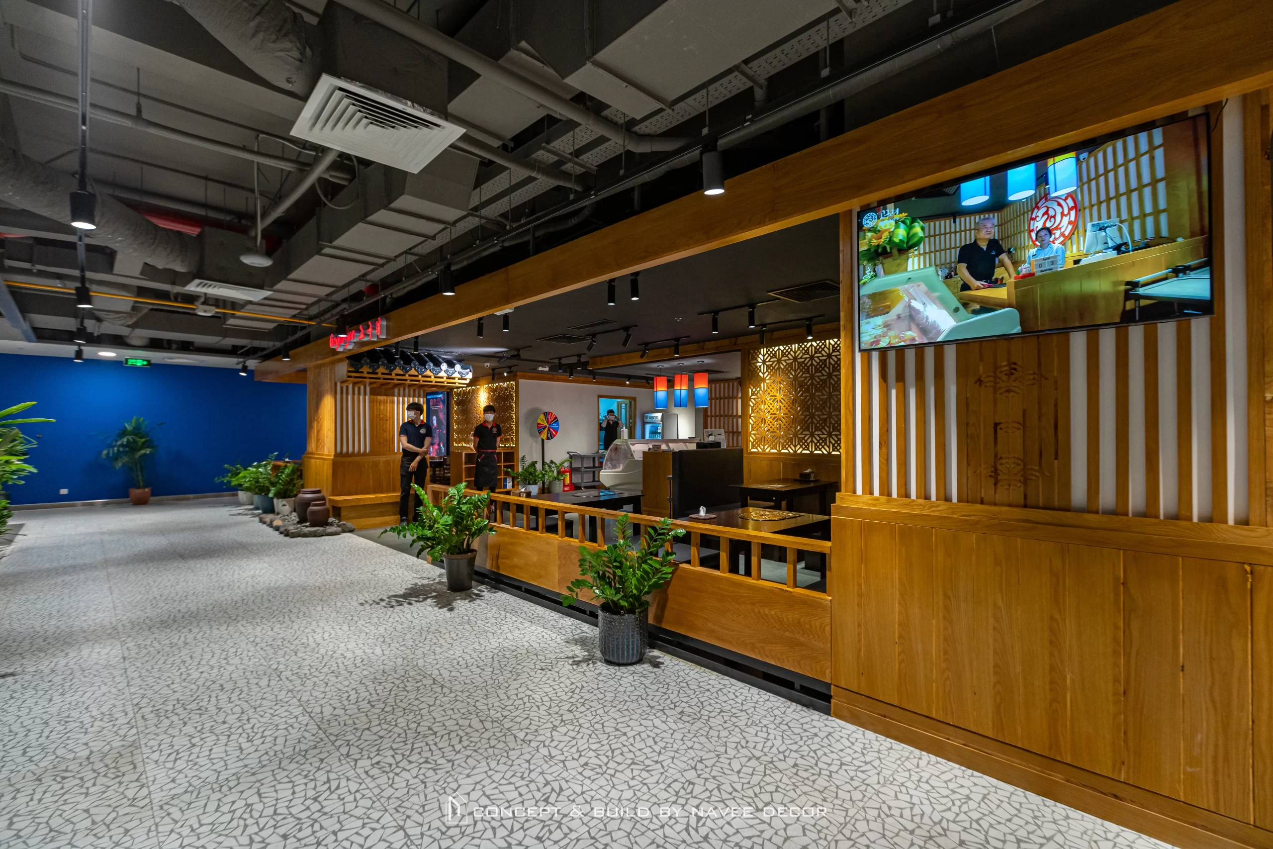 Cách bố trí không gian theo bố cục mở có kiểm soát, kết hợp các khu bàn ăn riêng tư bằng hệ vách ngăn gỗ truyền thống, vừa đảm bảo tính riêng tư cho thực khách, vừa giữ được sự thông thoáng và nhịp điệu không gian. Một điểm nhấn quan trọng của nhà hàng là khu vực mặt tiền và quầy phục vụ, nơi cấu trúc khung gỗ lớn kết hợp bảng hiệu đỏ nổi bật tạo nên dấu ấn thị giác mạnh mẽ và nổi bật trong không gian trung tâm thương mại.