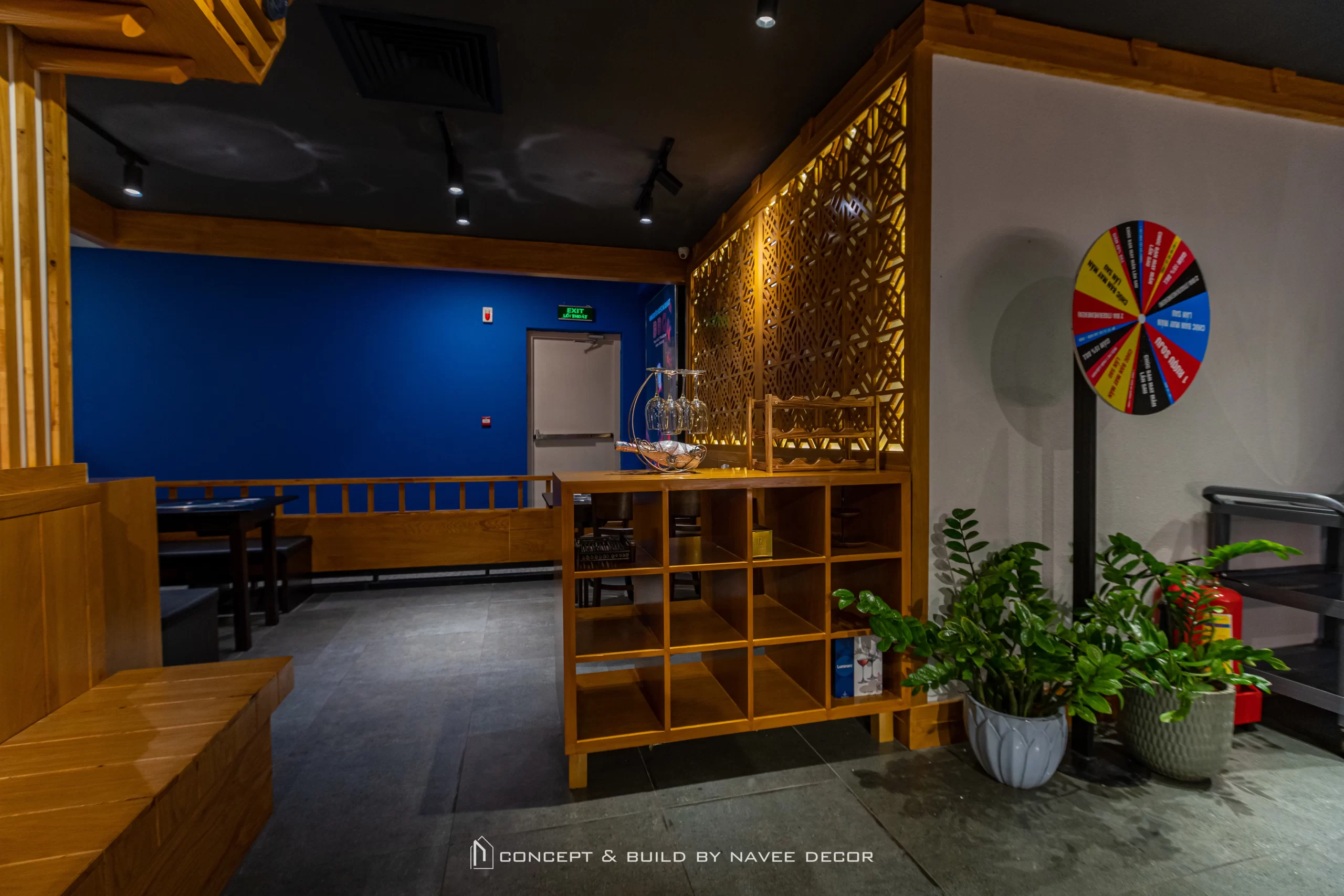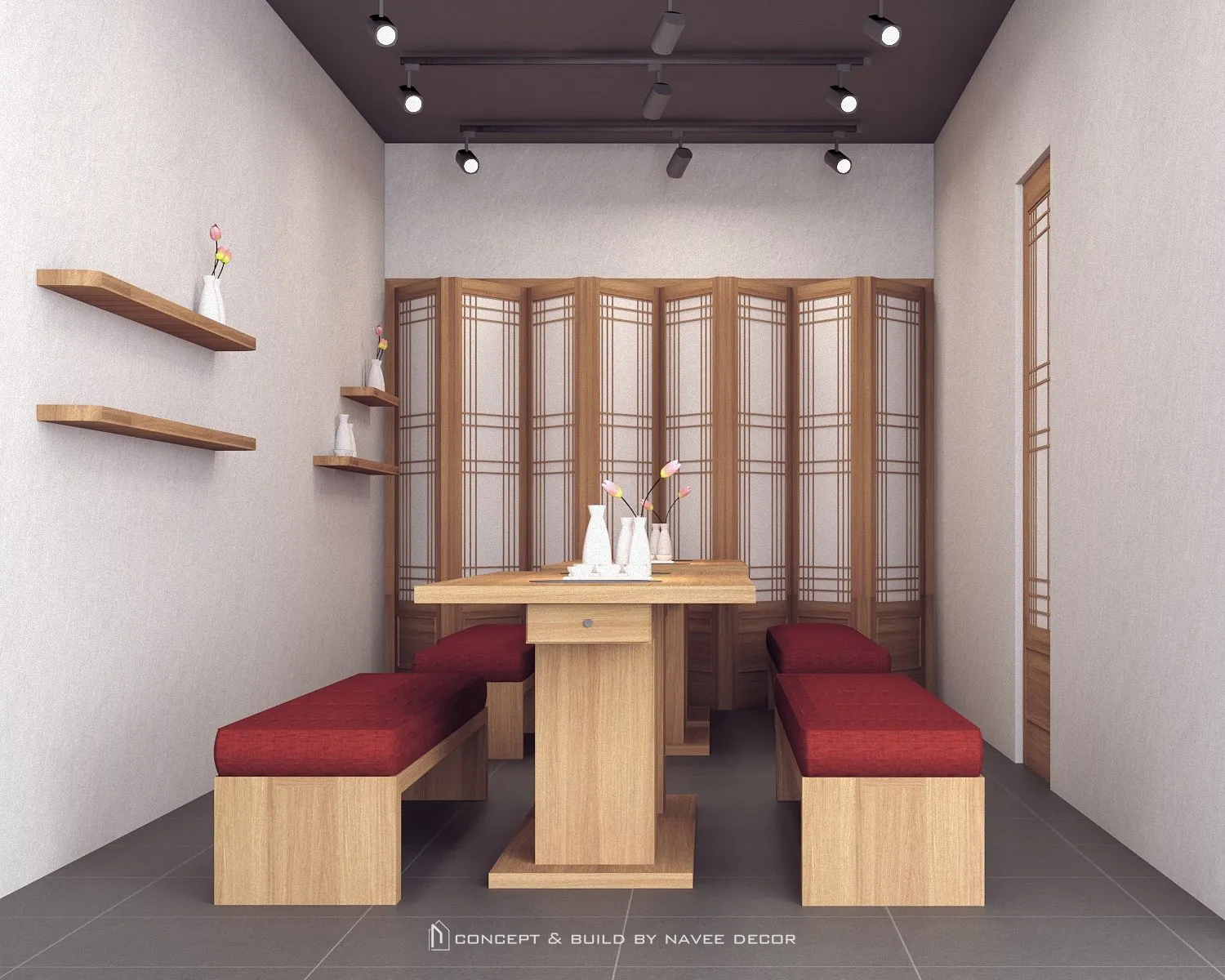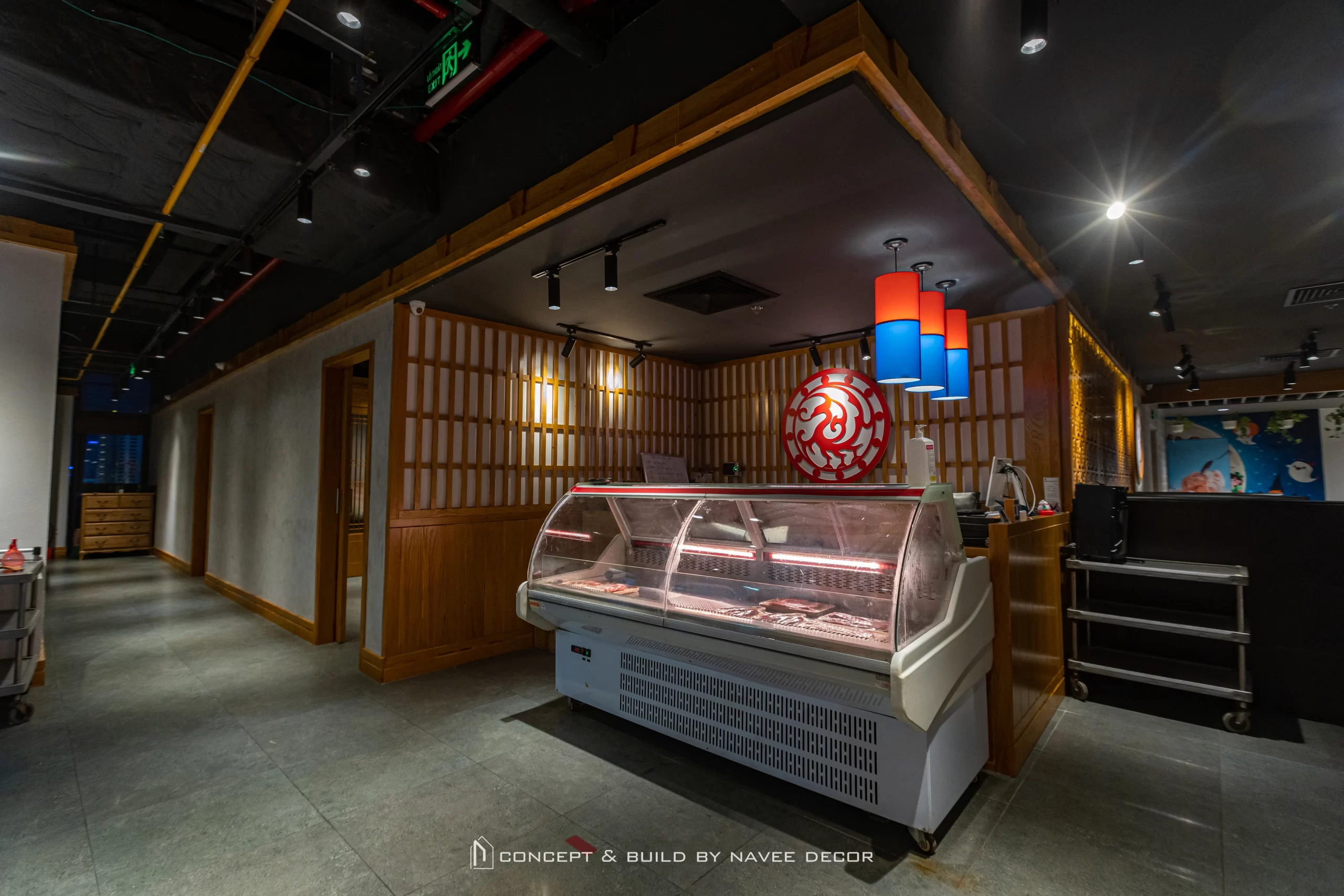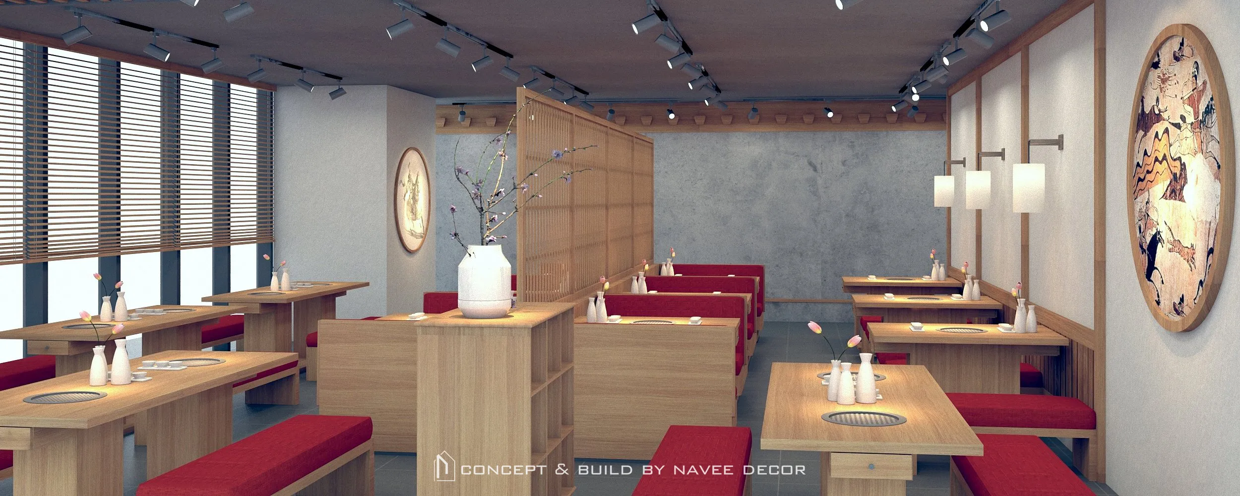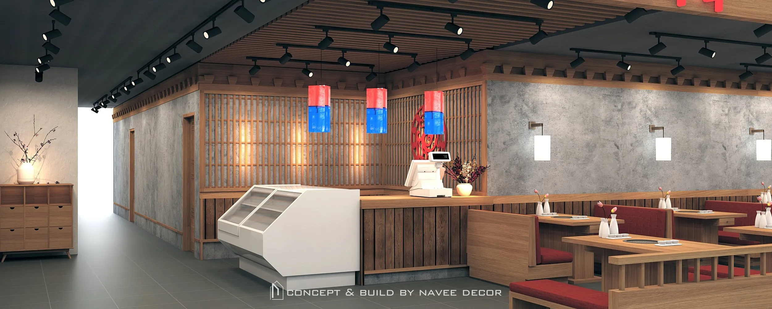 Cách bố trí không gian theo bố cục mở có kiểm soát, kết hợp các khu bàn ăn riêng tư bằng hệ vách ngăn gỗ truyền thống, vừa đảm bảo tính riêng tư cho thực khách, vừa giữ được sự thông thoáng và nhịp điệu không gian. Một điểm nhấn quan trọng của nhà hàng là khu vực mặt tiền và quầy phục vụ, nơi cấu trúc khung gỗ lớn kết hợp bảng hiệu đỏ nổi bật tạo nên dấu ấn thị giác mạnh mẽ và nổi bật trong không gian trung tâm thương mại.
