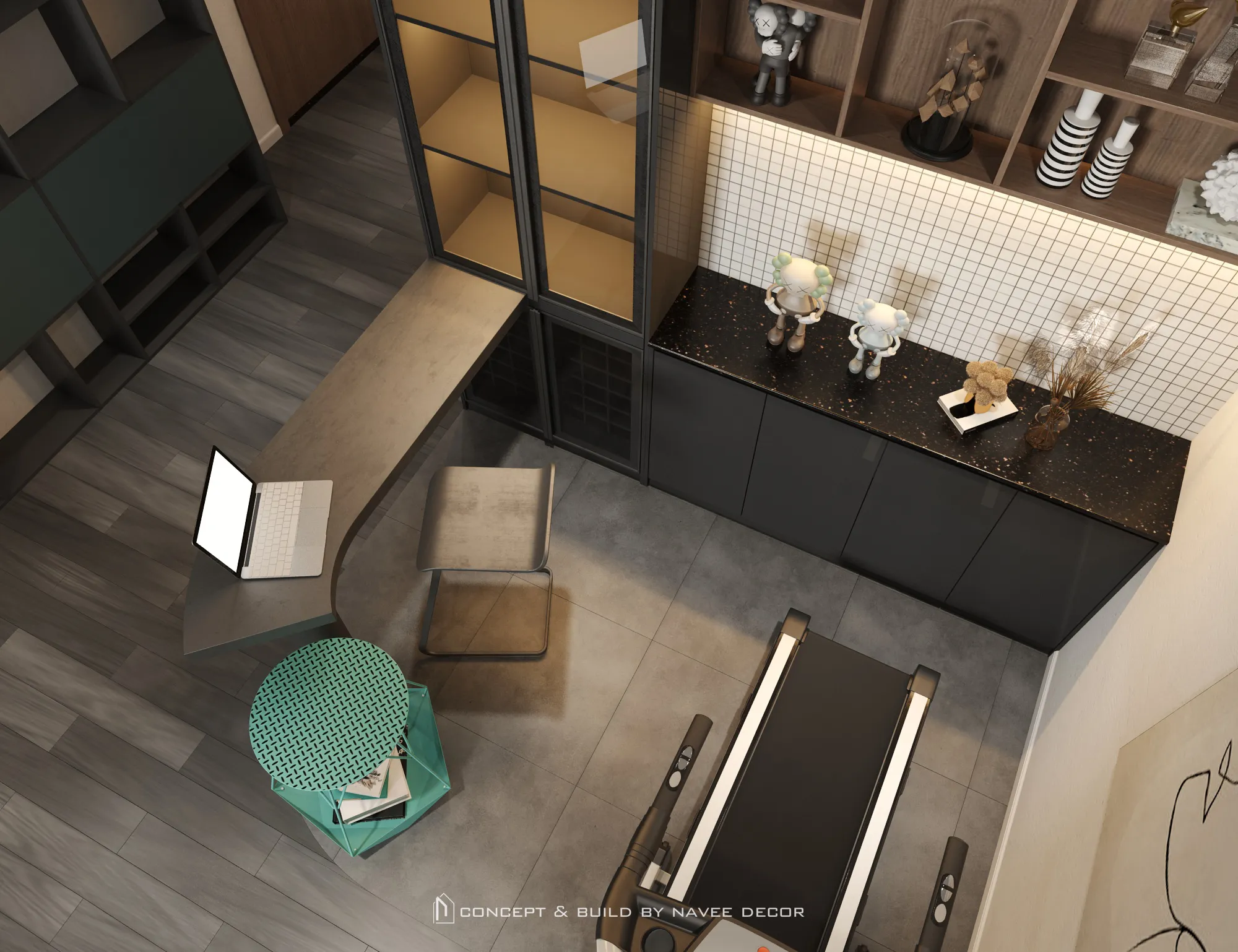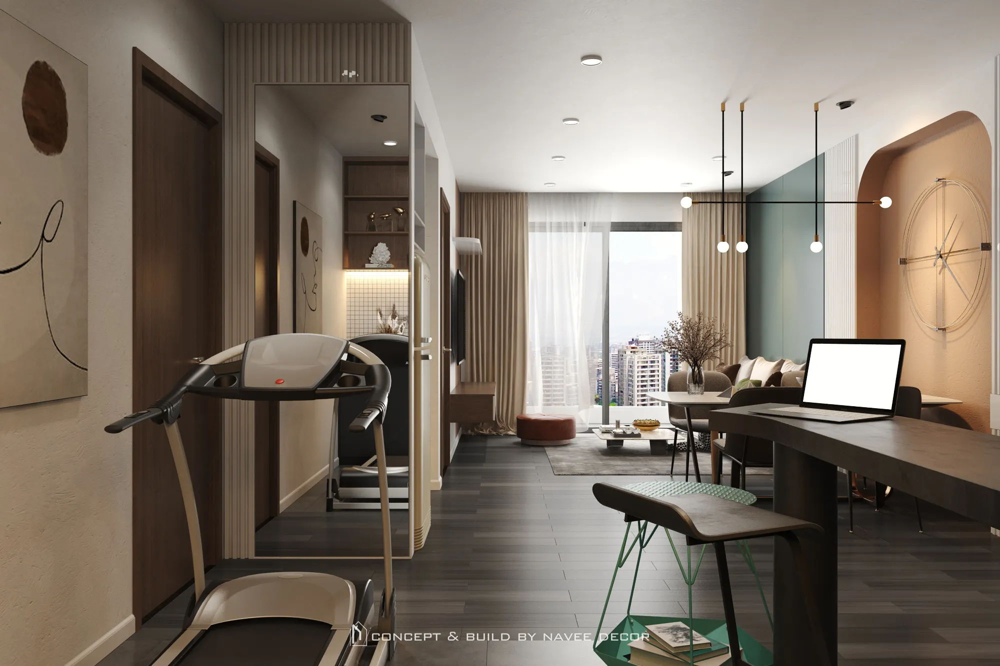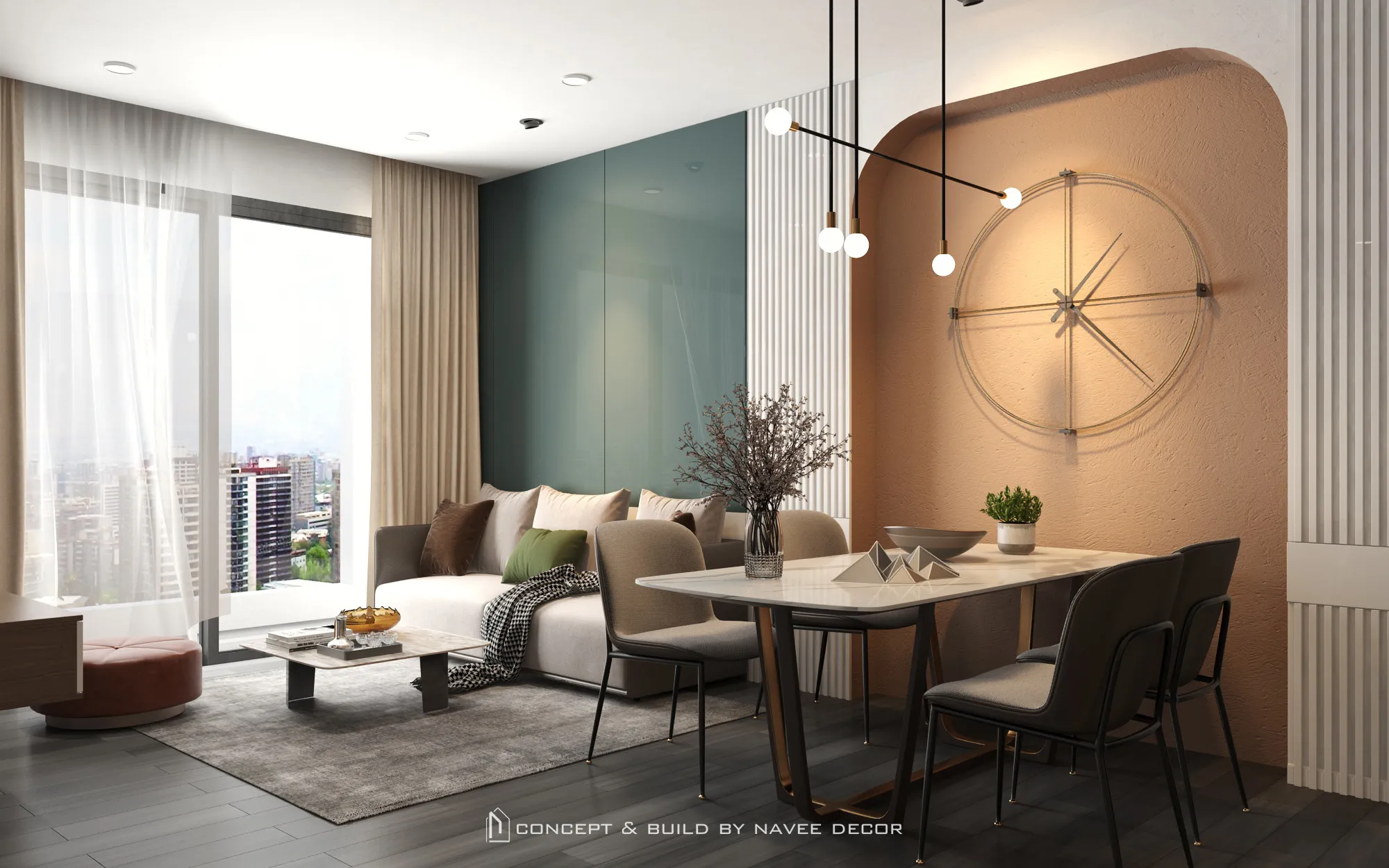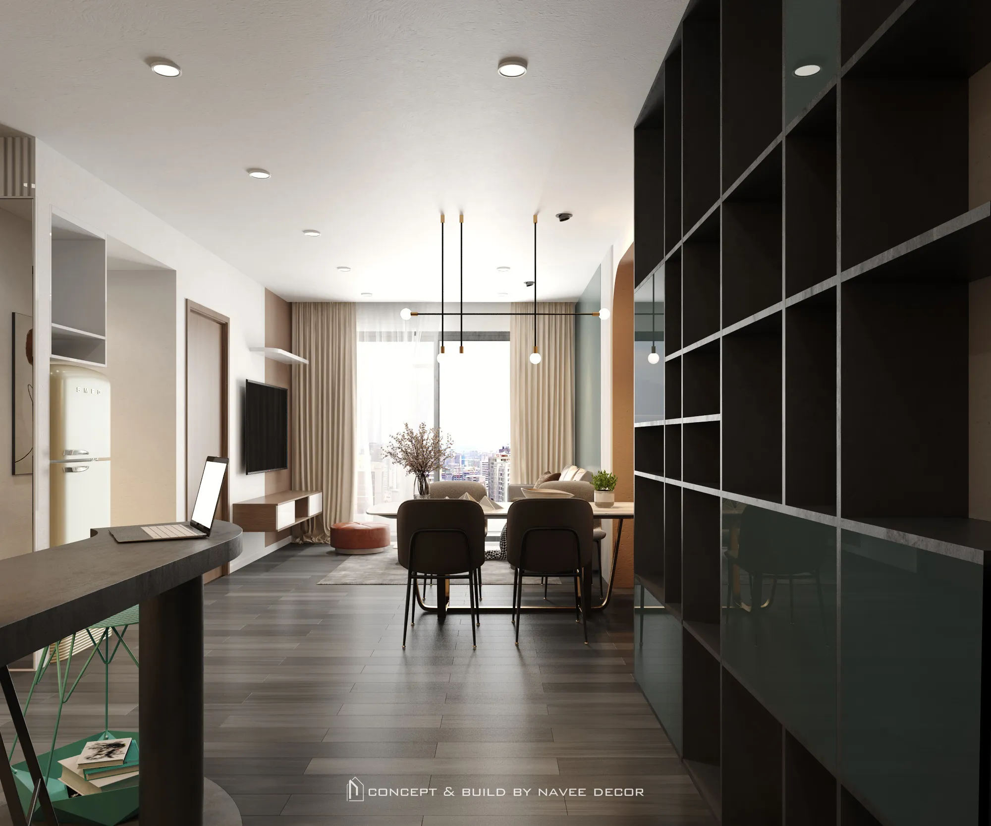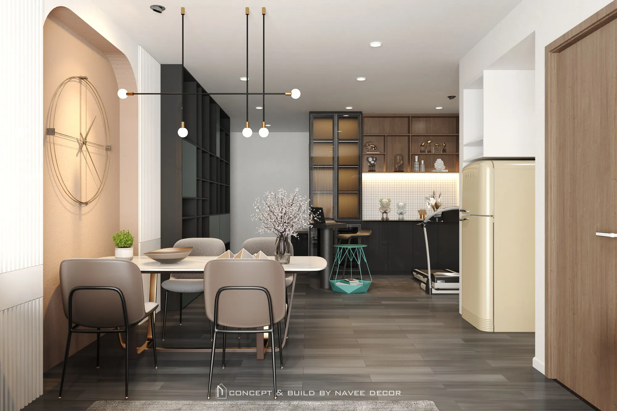 Tổng thể nội thất sử dụng bảng màu trung tính ấm kết hợp các điểm nhấn xanh olive và vật liệu gỗ, tạo nên cảm giác hiện đại, nhẹ nhàng nhưng vẫn giữ được chiều sâu thẩm mỹ. Các chi tiết kiến trúc bo cong, đặc biệt là vòm trang trí giúp làm mềm không gian và chiều sâu thị giác cho khu sinh hoạt chung.