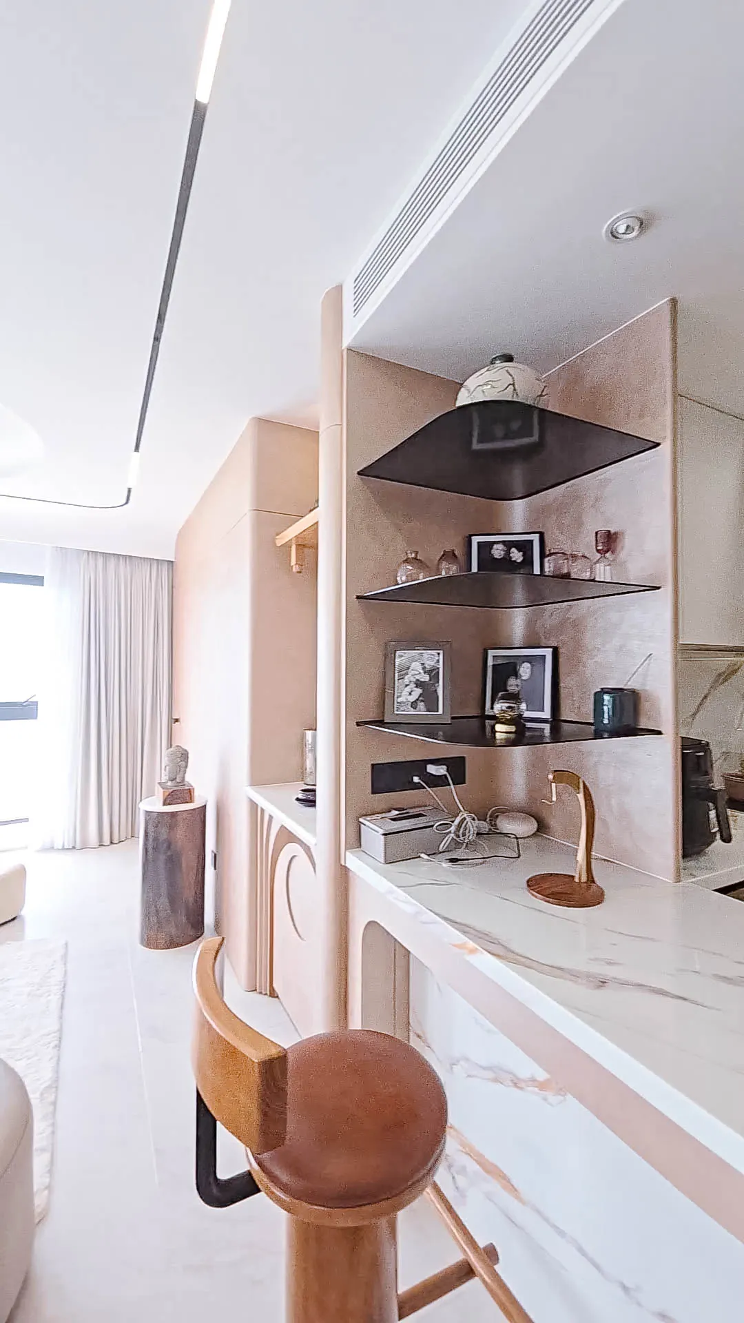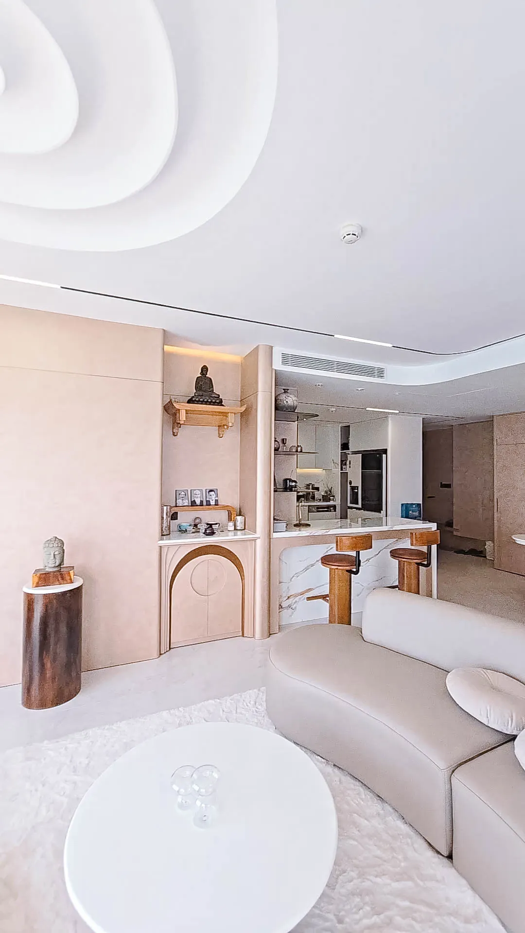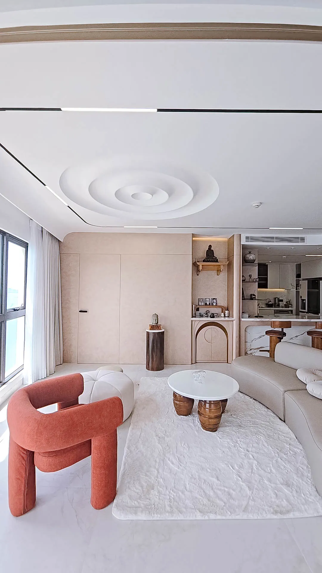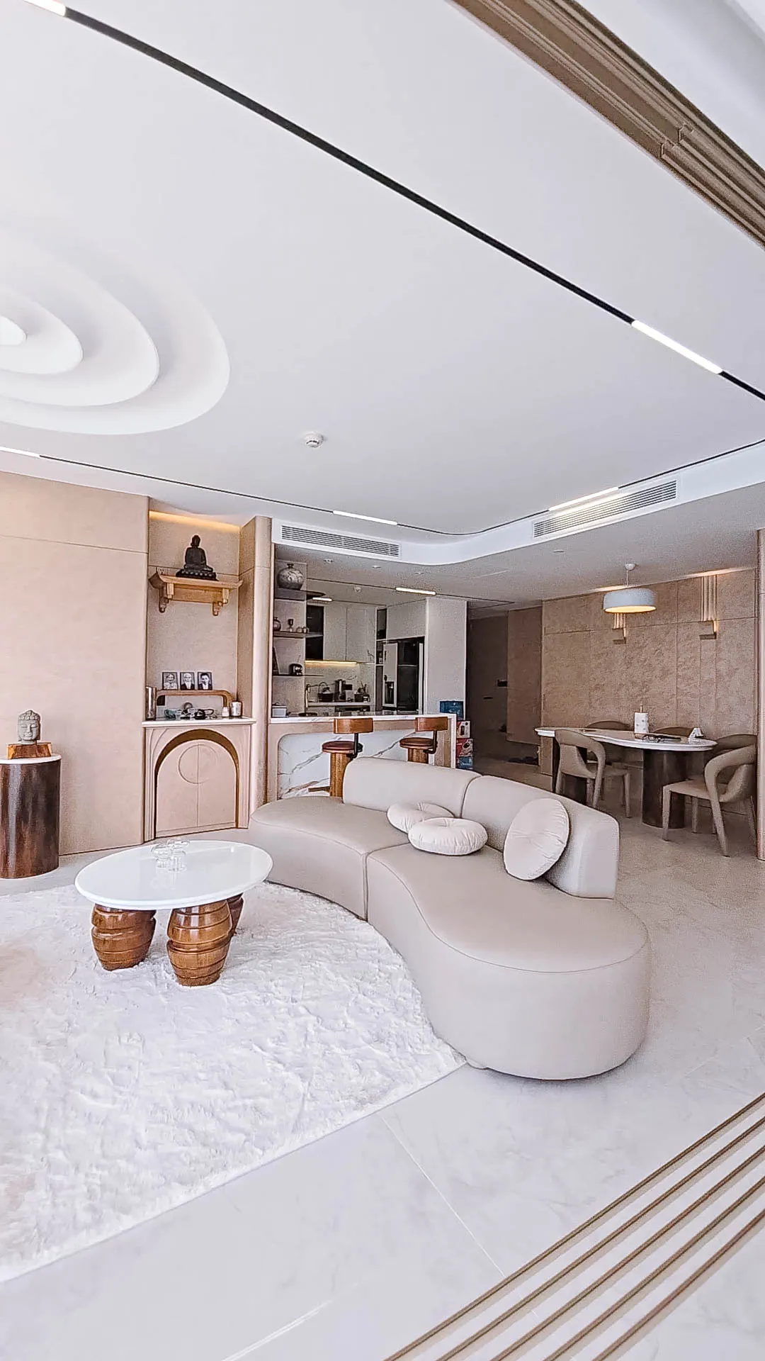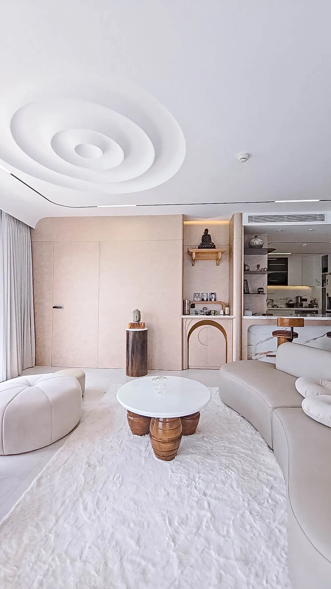 Căn hộ được định hướng theo phong cách Modern Minimal kết hợp hơi hướng nghỉ dưỡng, sử dụng bảng màu trung tính cùng các đường cong mềm mại, tạo nên một không gian sống nhẹ nhàng, tinh tế và giàu cảm xúc.