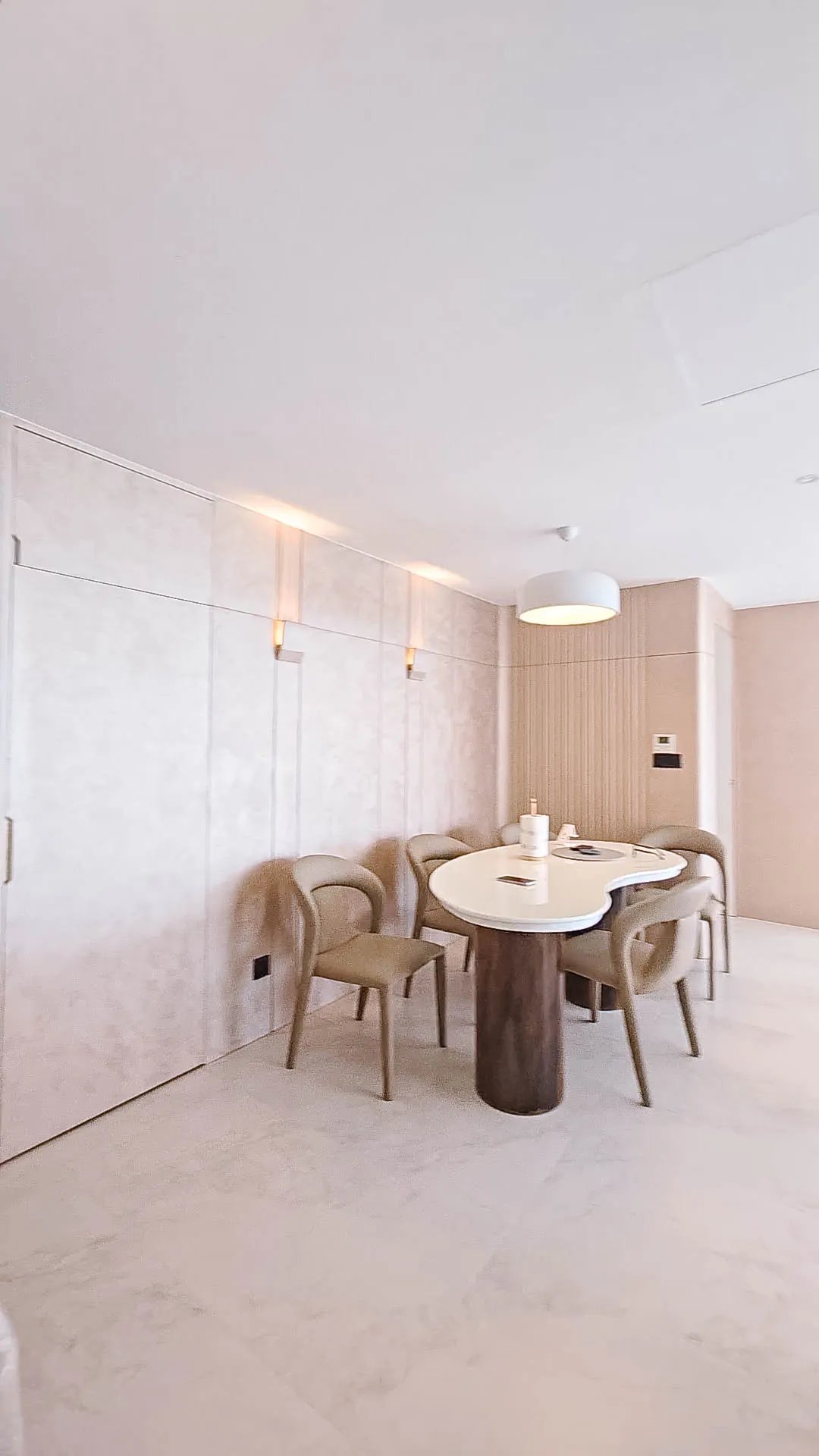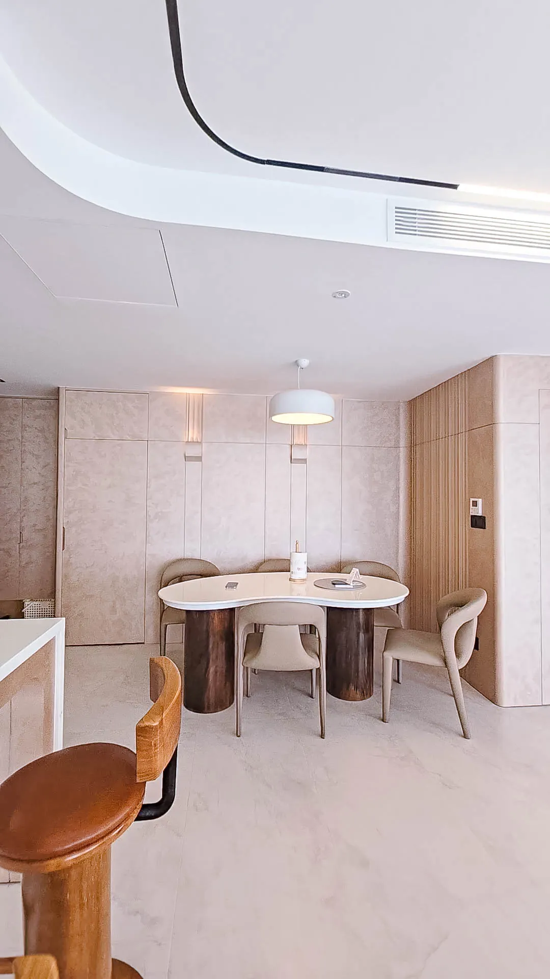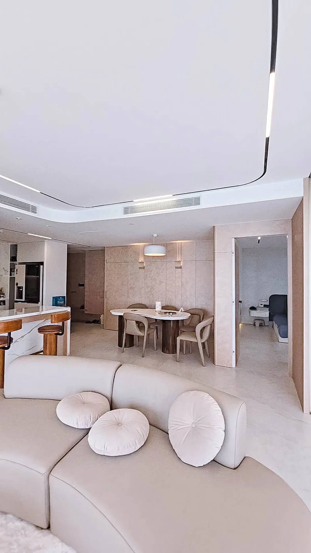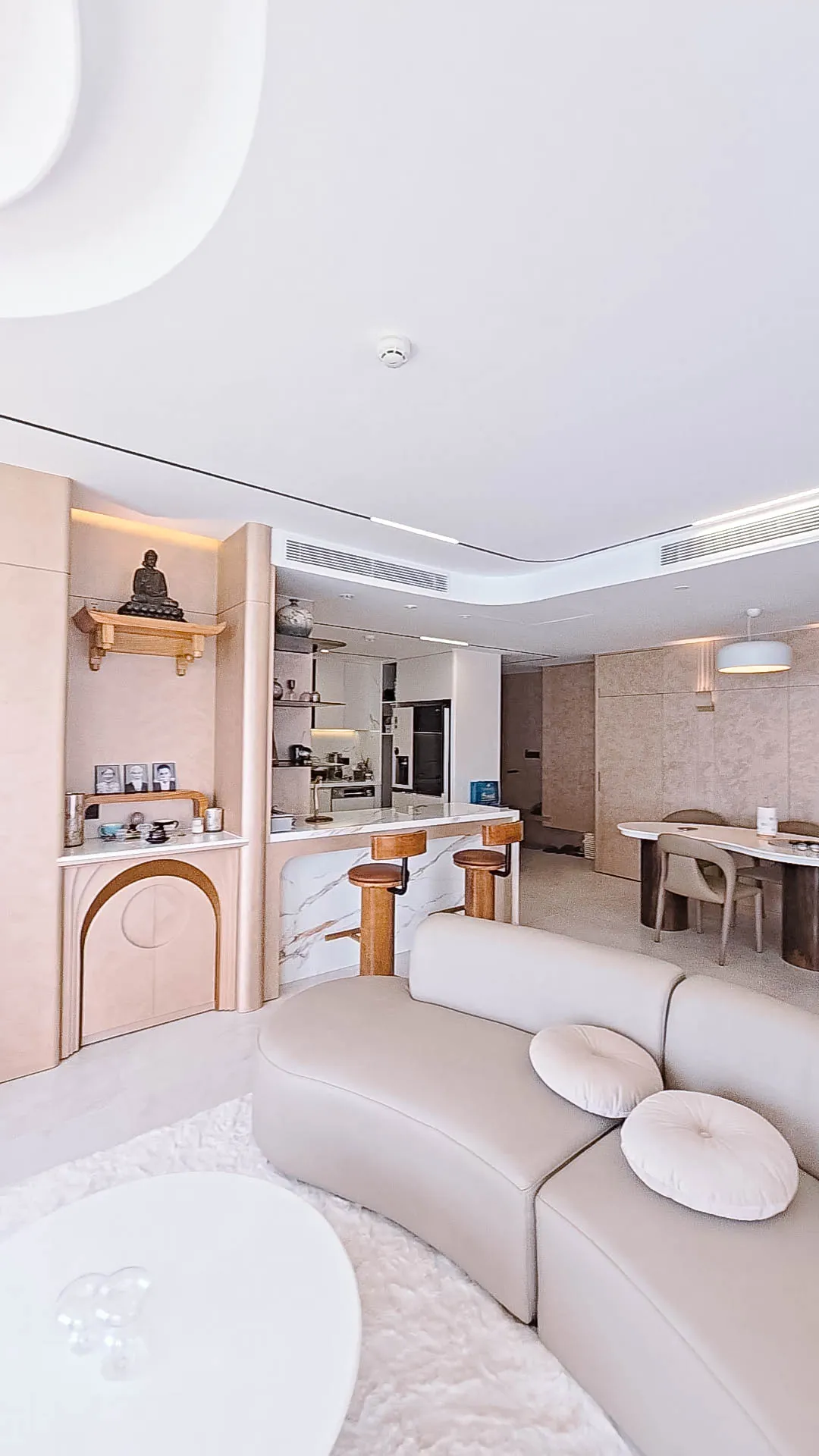 Căn hộ được định hướng theo phong cách Modern Minimal kết hợp hơi hướng nghỉ dưỡng, sử dụng bảng màu trung tính cùng các đường cong mềm mại, tạo nên một không gian sống nhẹ nhàng, tinh tế và giàu cảm xúc.