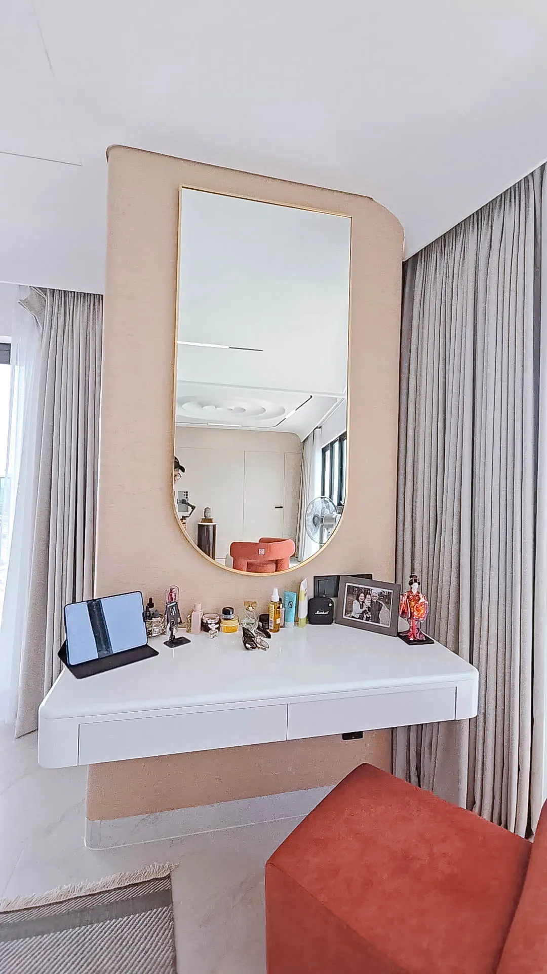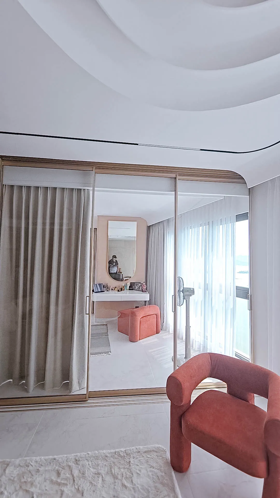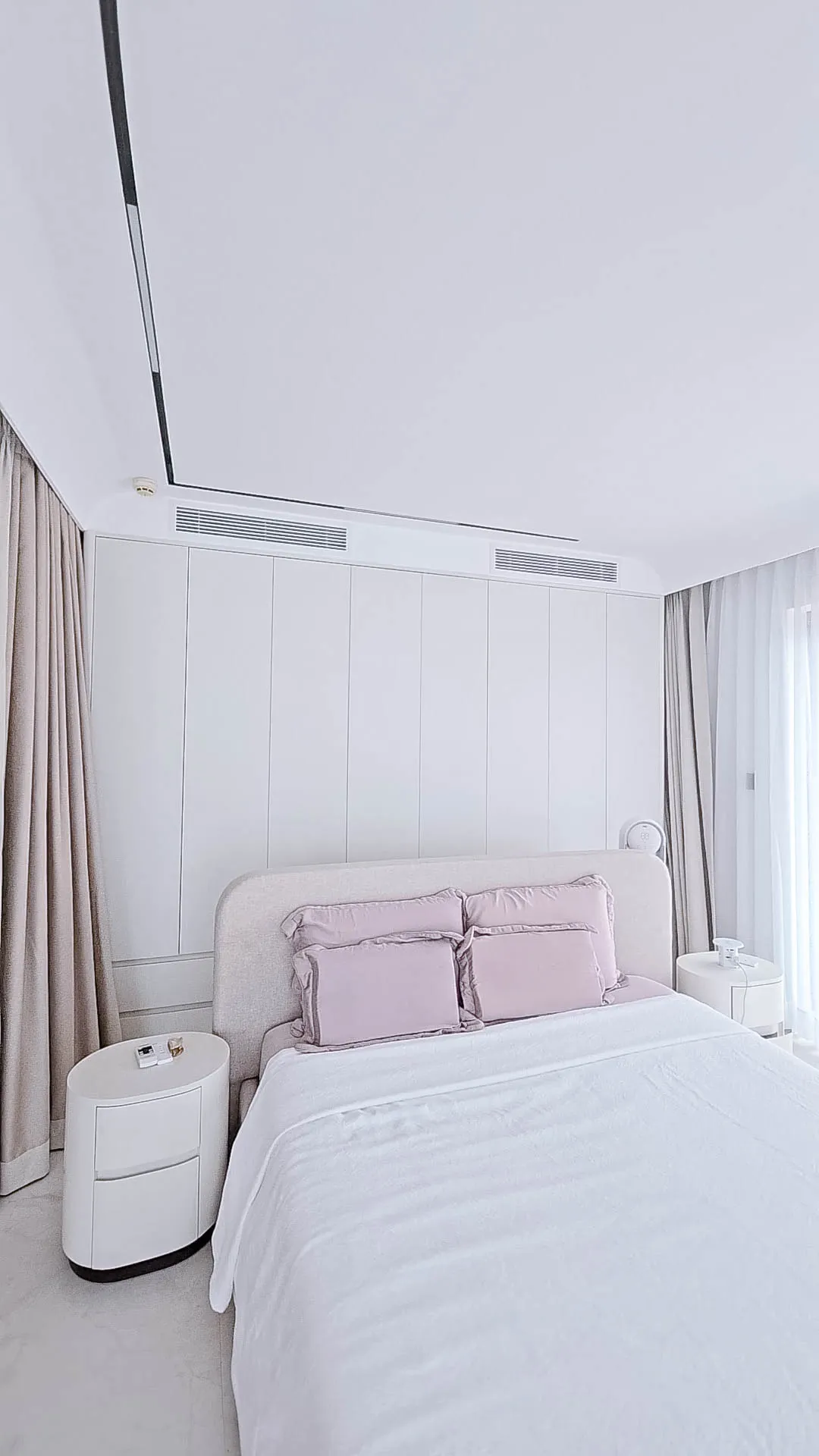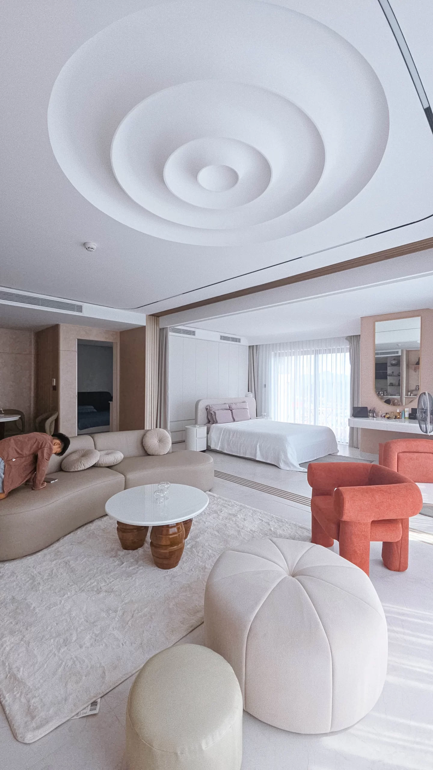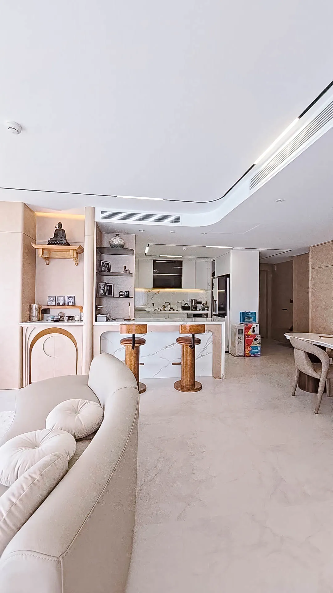 Căn hộ được định hướng theo phong cách Modern Minimal kết hợp hơi hướng nghỉ dưỡng, sử dụng bảng màu trung tính cùng các đường cong mềm mại, tạo nên một không gian sống nhẹ nhàng, tinh tế và giàu cảm xúc.
