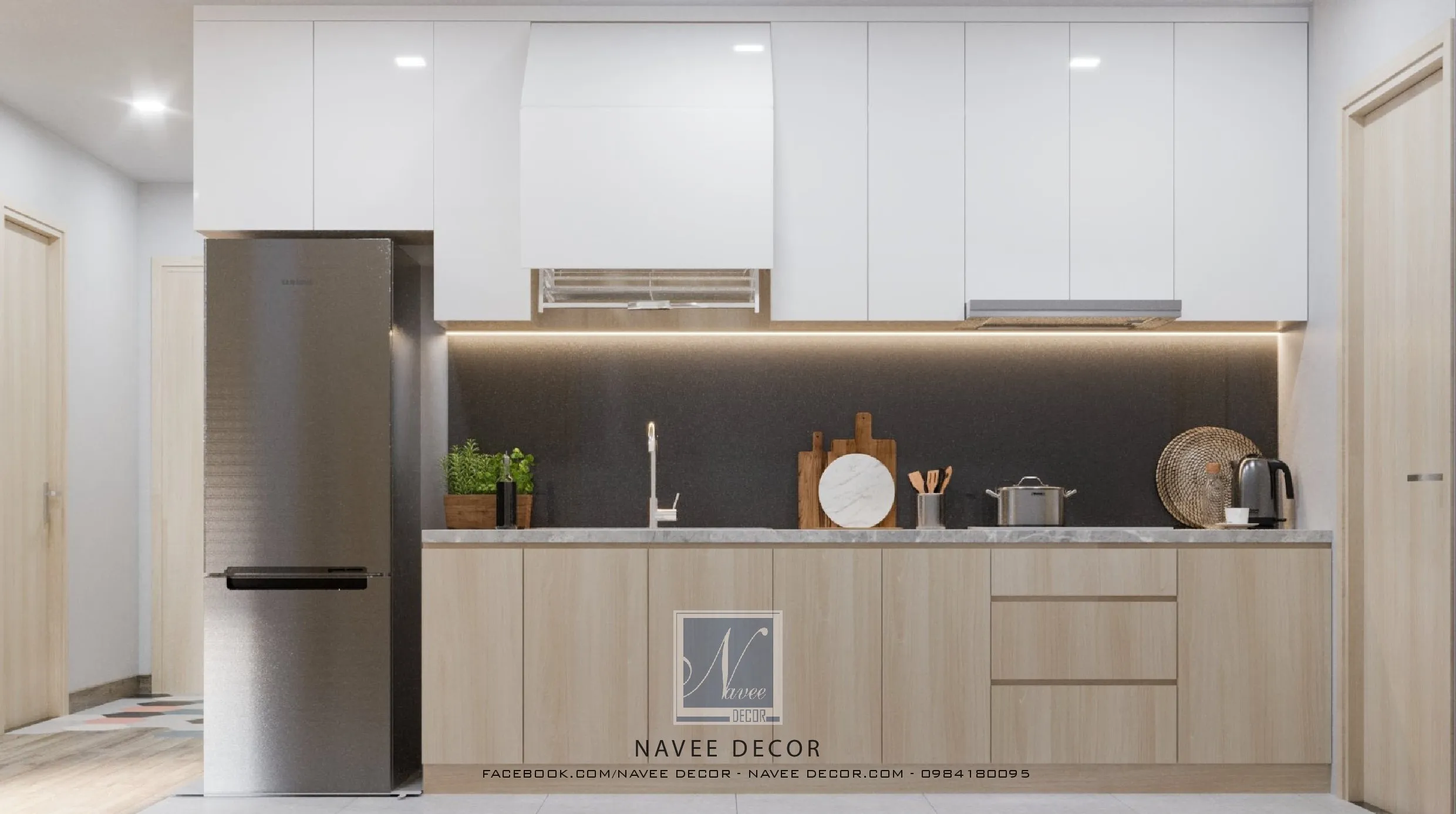 Tủ bếp hai tone màu (trắng - gỗ sồi) phá vỡ sự đơn điệu, mặt đá nhân tạo liền mạch, hậu kính xanh rêu tạo điểm nhấn dịu mắt, chống bám dầu mỡ hiệu quả.