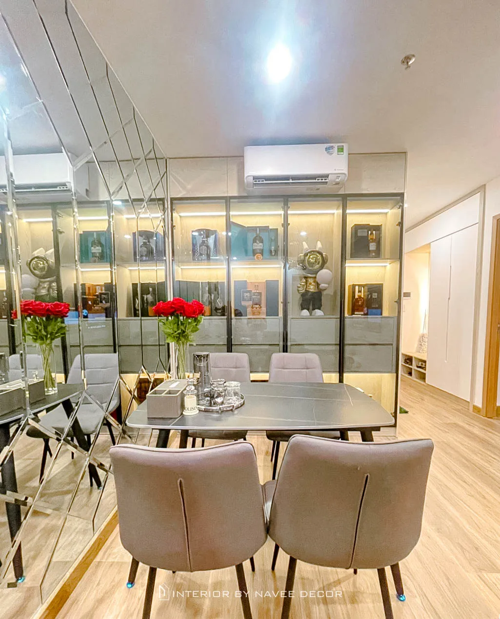 Hệ tủ kính trưng bày không phải tủ rượu thông thường mà còn là giải pháp lưu trữ và triển lãm những vật phẩm giá trị của gia chủ. Mỗi ngăn được tính toán chiều cao theo hiện vật (rượu, ly, đồ lưu niệm), kính phản quang mở rộng không gian.