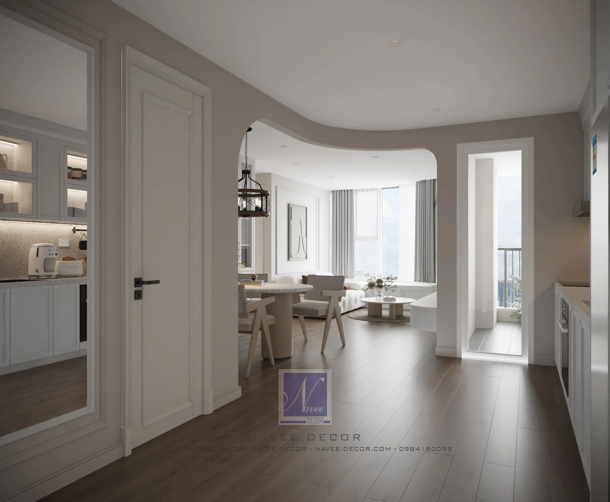 Không gian căn hộ được tổ chức theo bố cục mở giữa phòng khách – bếp – khu ăn nhằm tối ưu diện tích và tăng khả năng kết nối trong sinh hoạt hằng ngày. Gam màu trắng – be – gỗ ấm được sử dụng xuyên suốt, kết hợp cùng vật liệu hoàn thiện thanh lịch như gỗ công nghiệp, đá nhân tạo và hệ tủ âm tường, mang lại tổng thể hài hòa, hiện đại nhưng vẫn giữ được cảm giác ấm cúng.