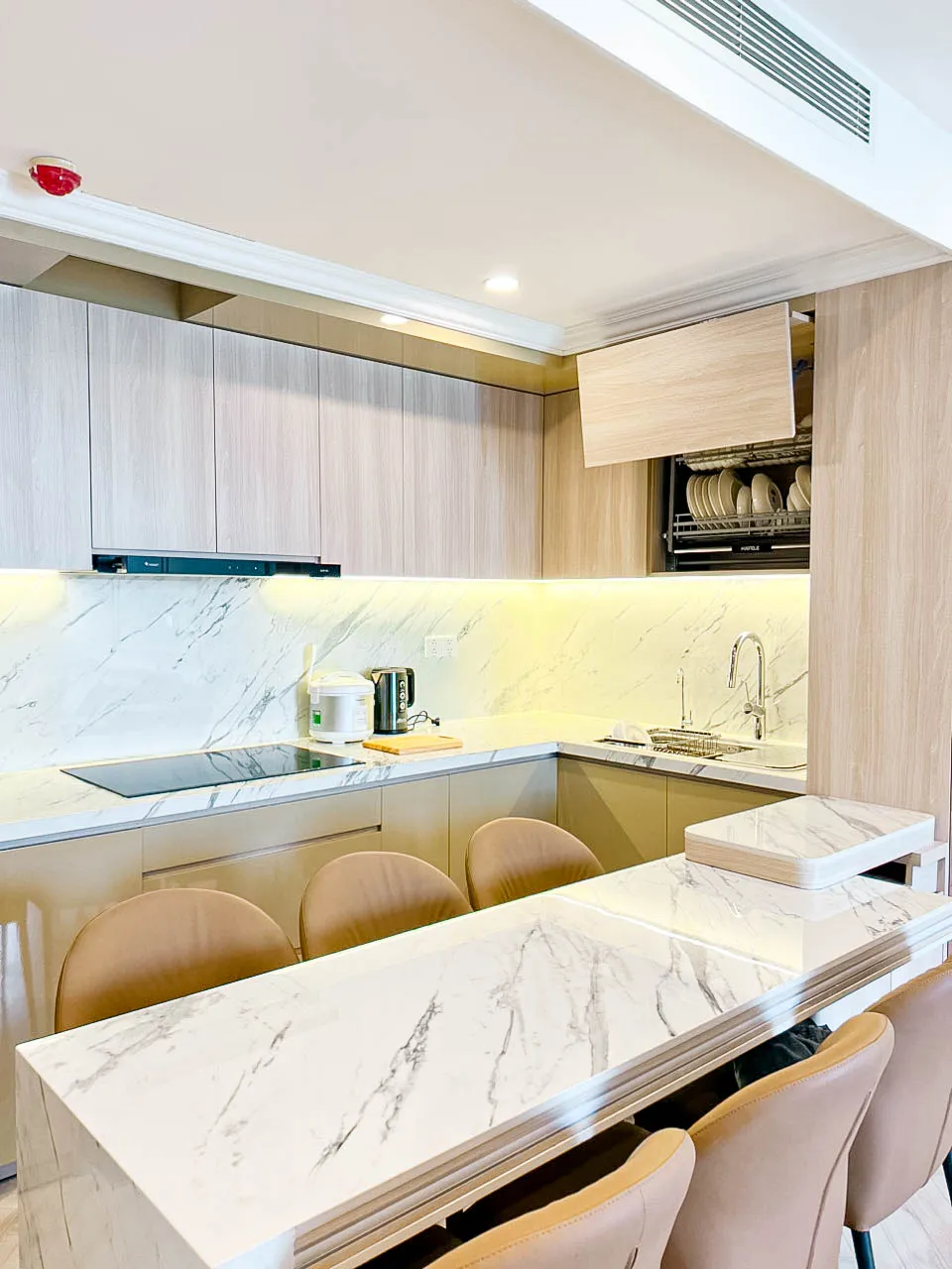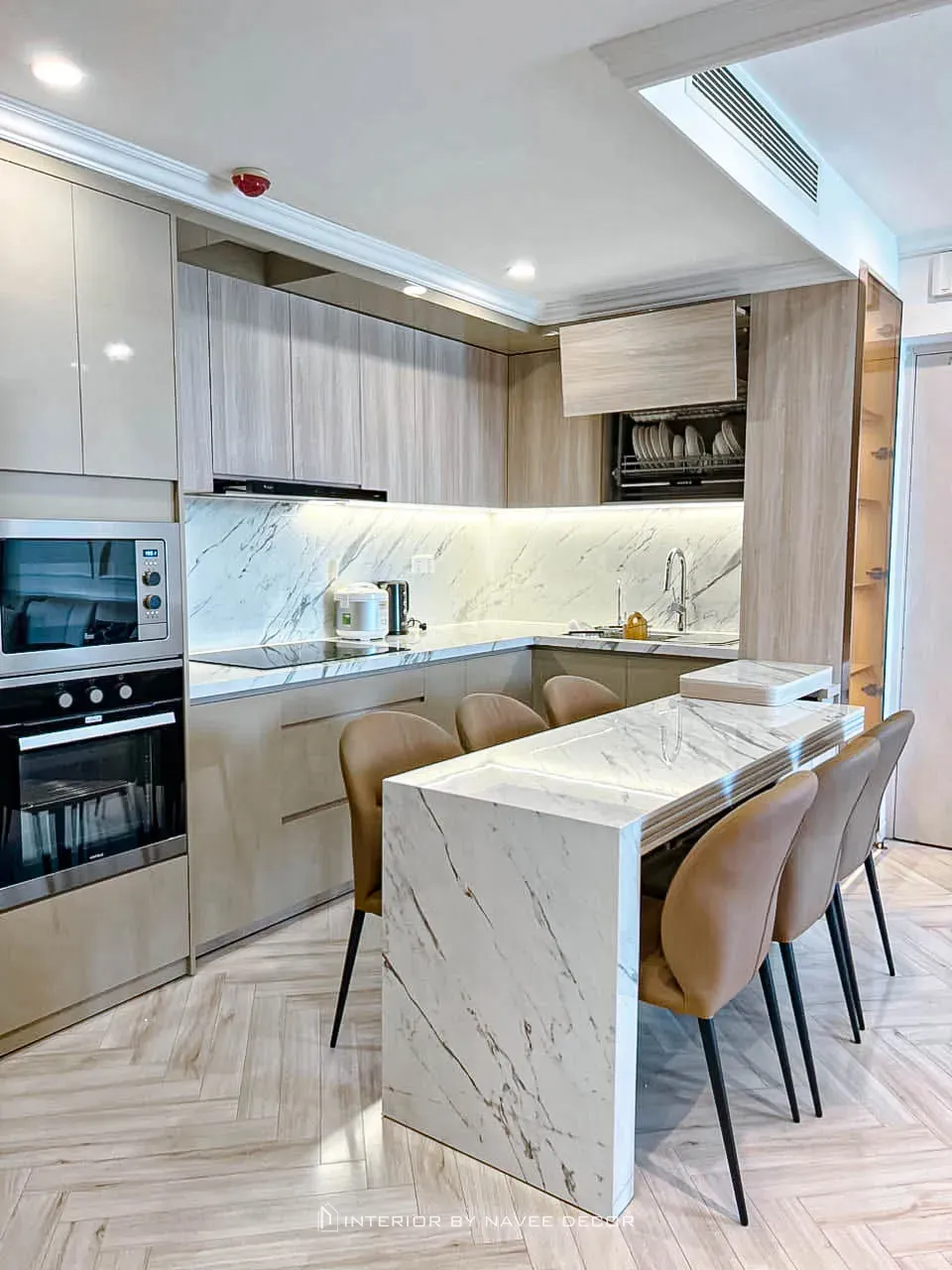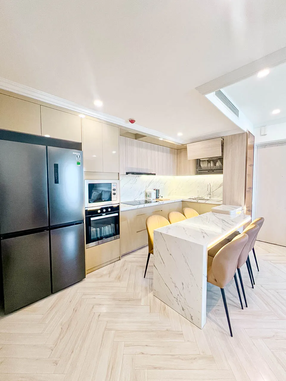 - Vật liệu đá vân marble kết hợp hệ tủ gỗ sáng màu sạch sẽ, thanh lịch.