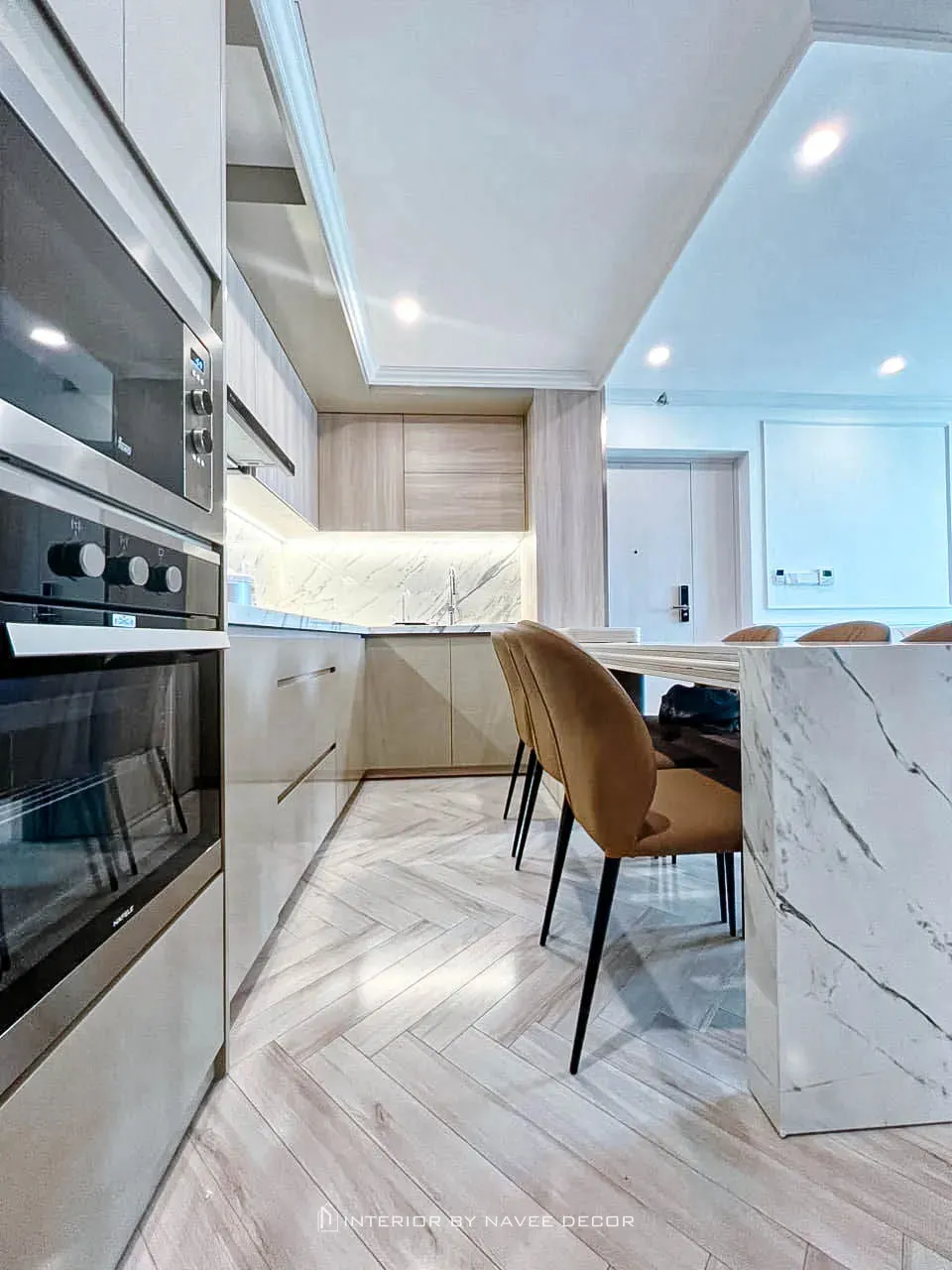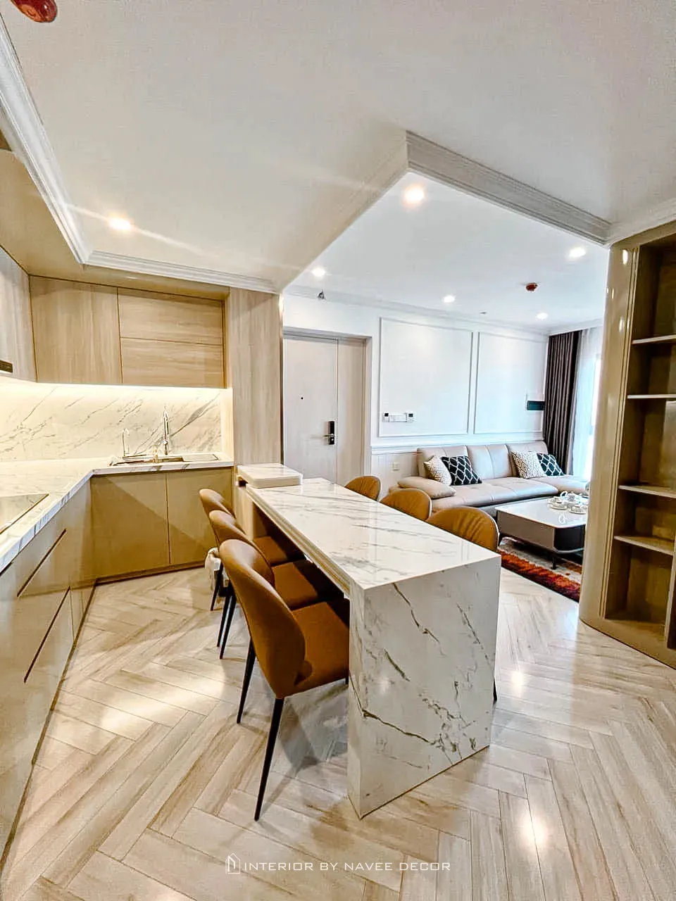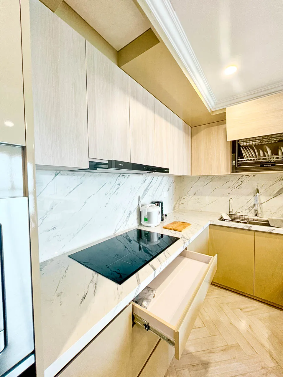 - Vật liệu đá vân marble kết hợp hệ tủ gỗ sáng màu sạch sẽ, thanh lịch.