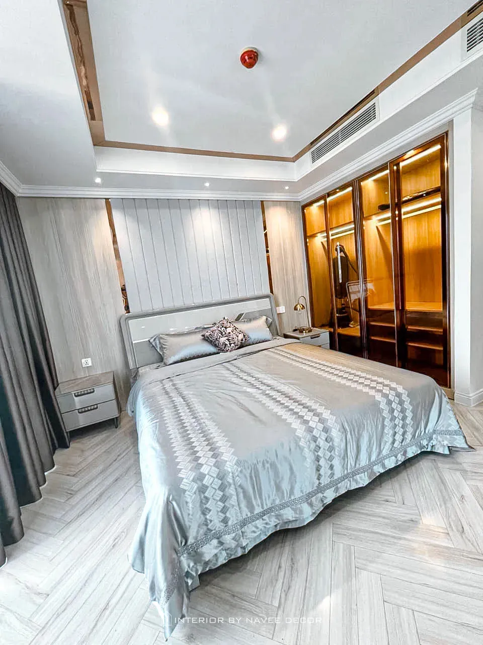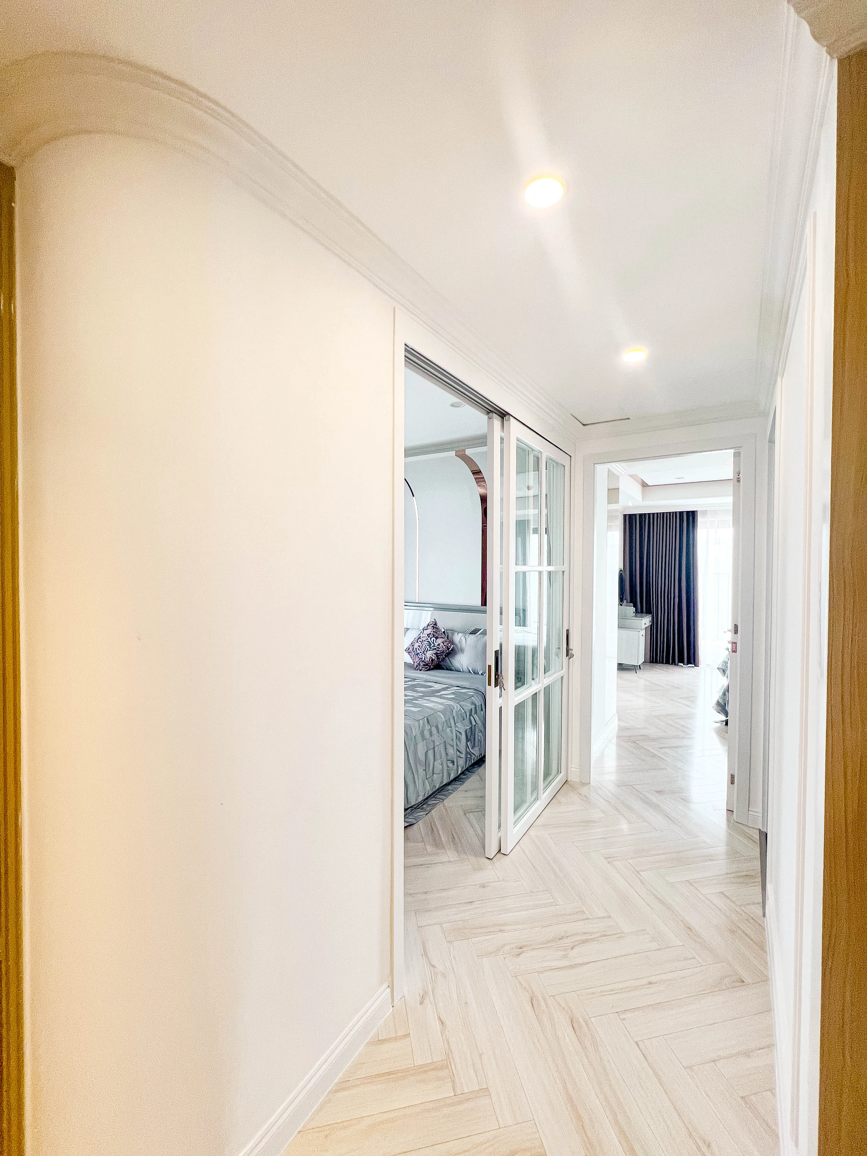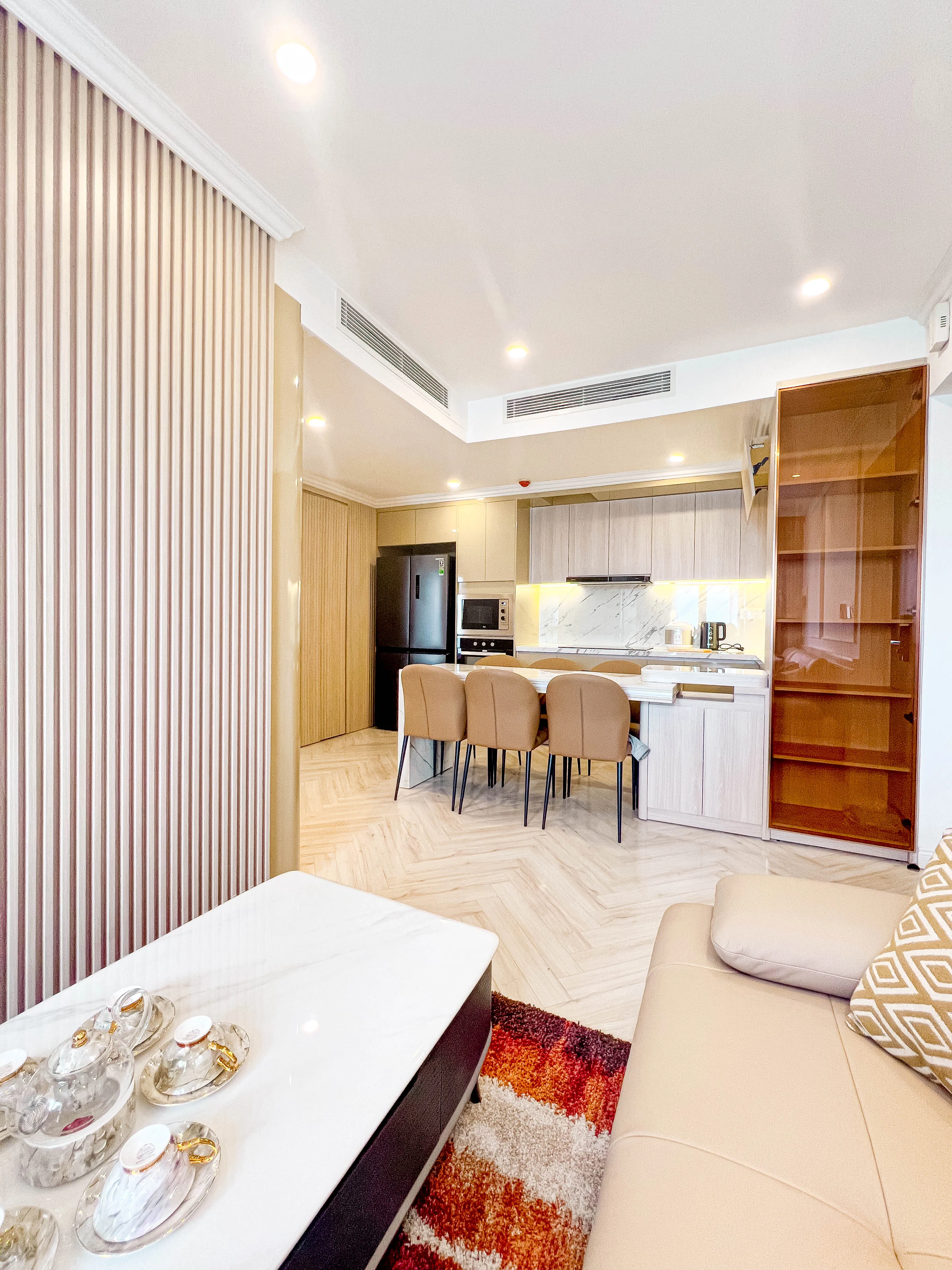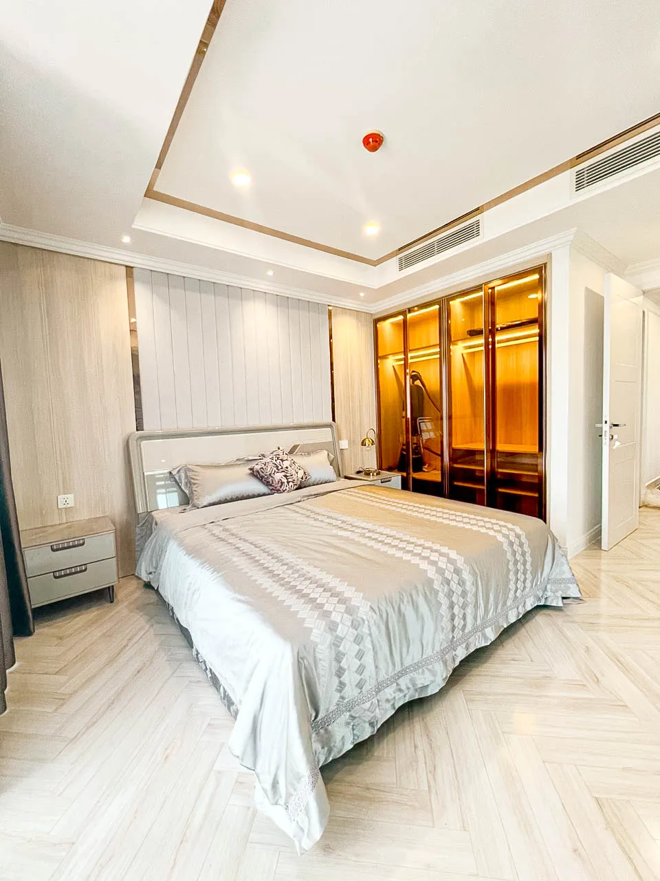 - Hệ tủ kính kết hợp đèn LED mang lại trải nghiệm như khách sạn cao cấp.
