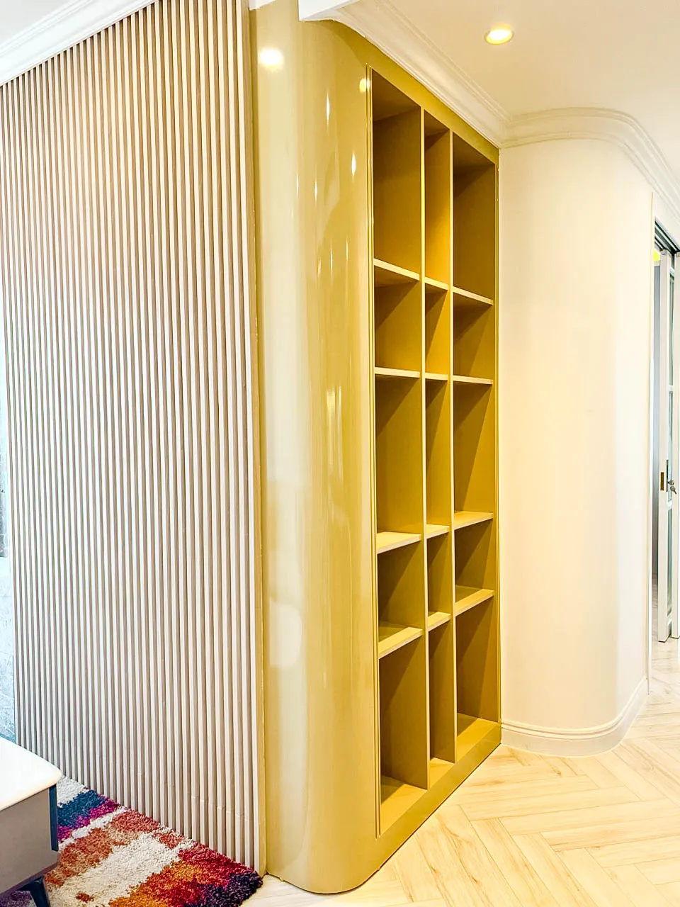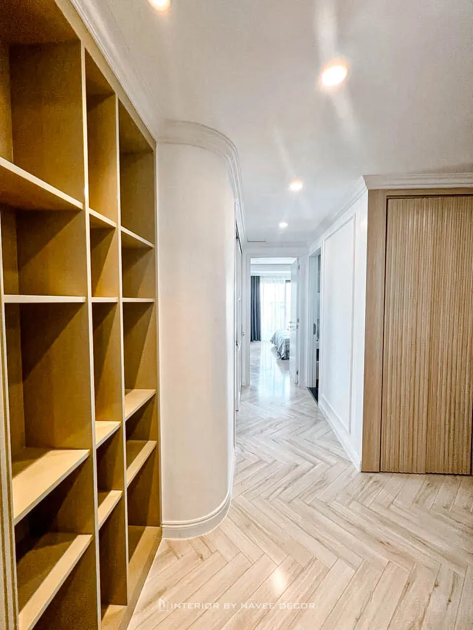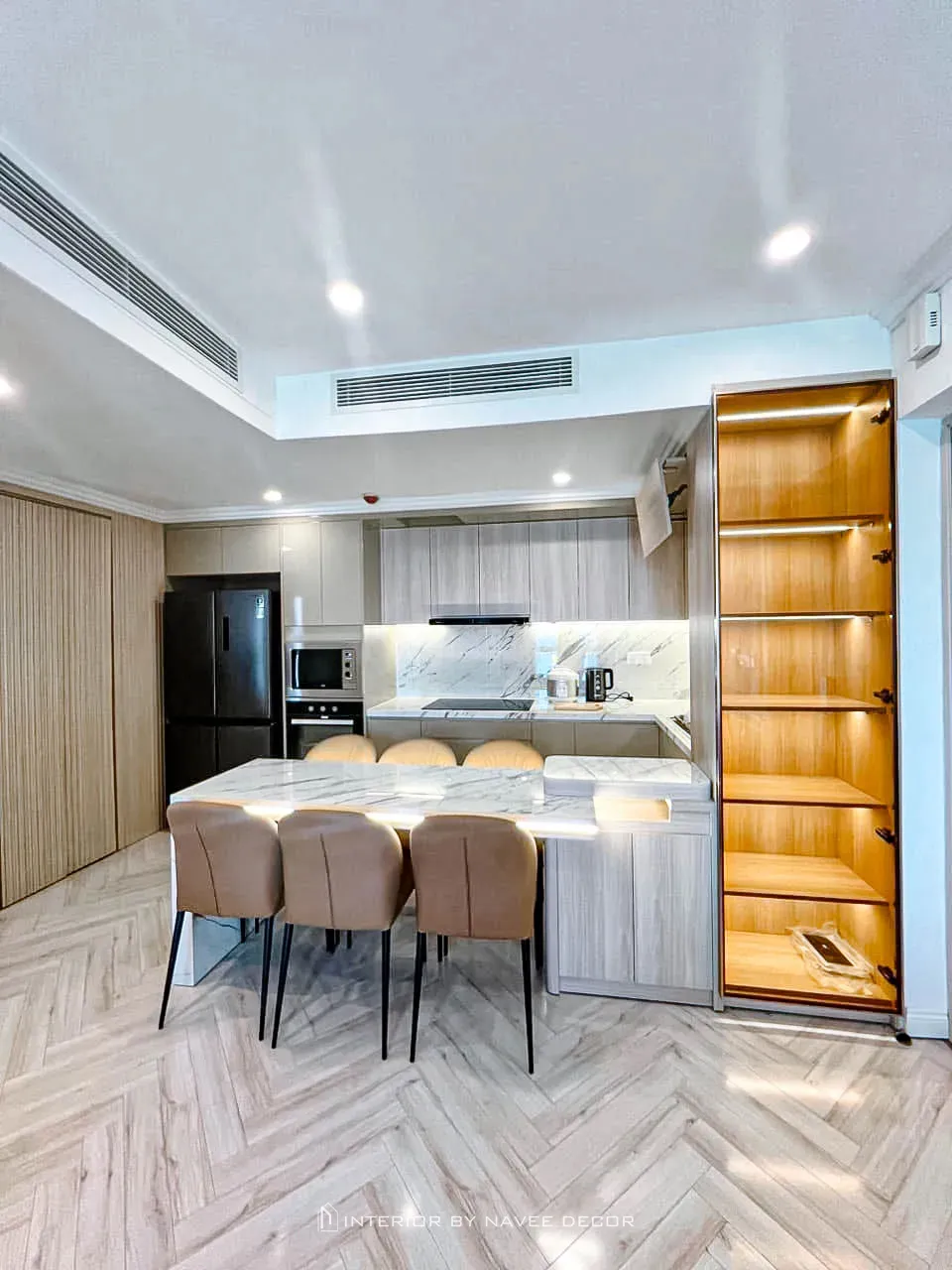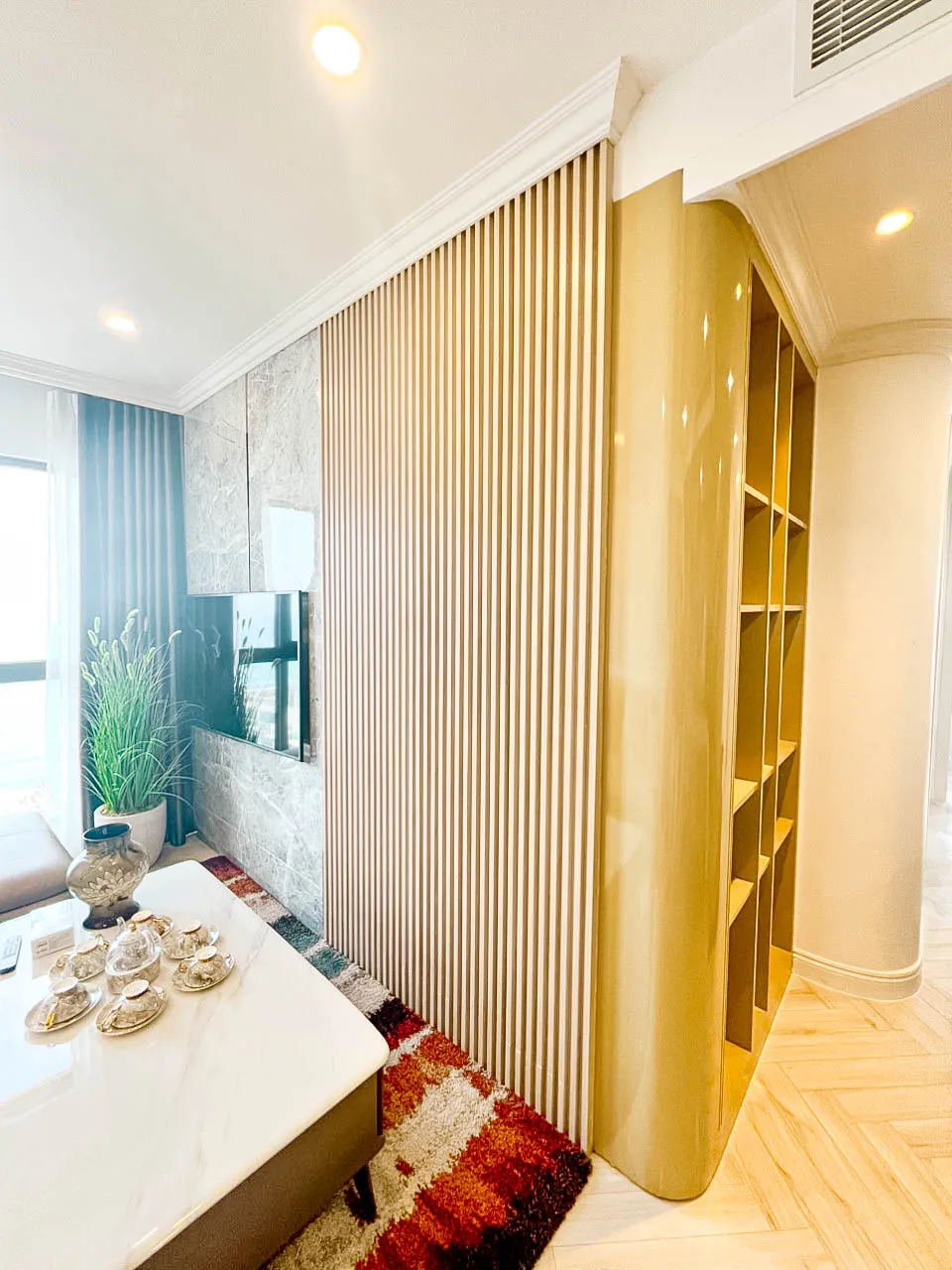 - Hệ tủ âm tường, tủ trang trí và kệ mở được bố trí khoa học.