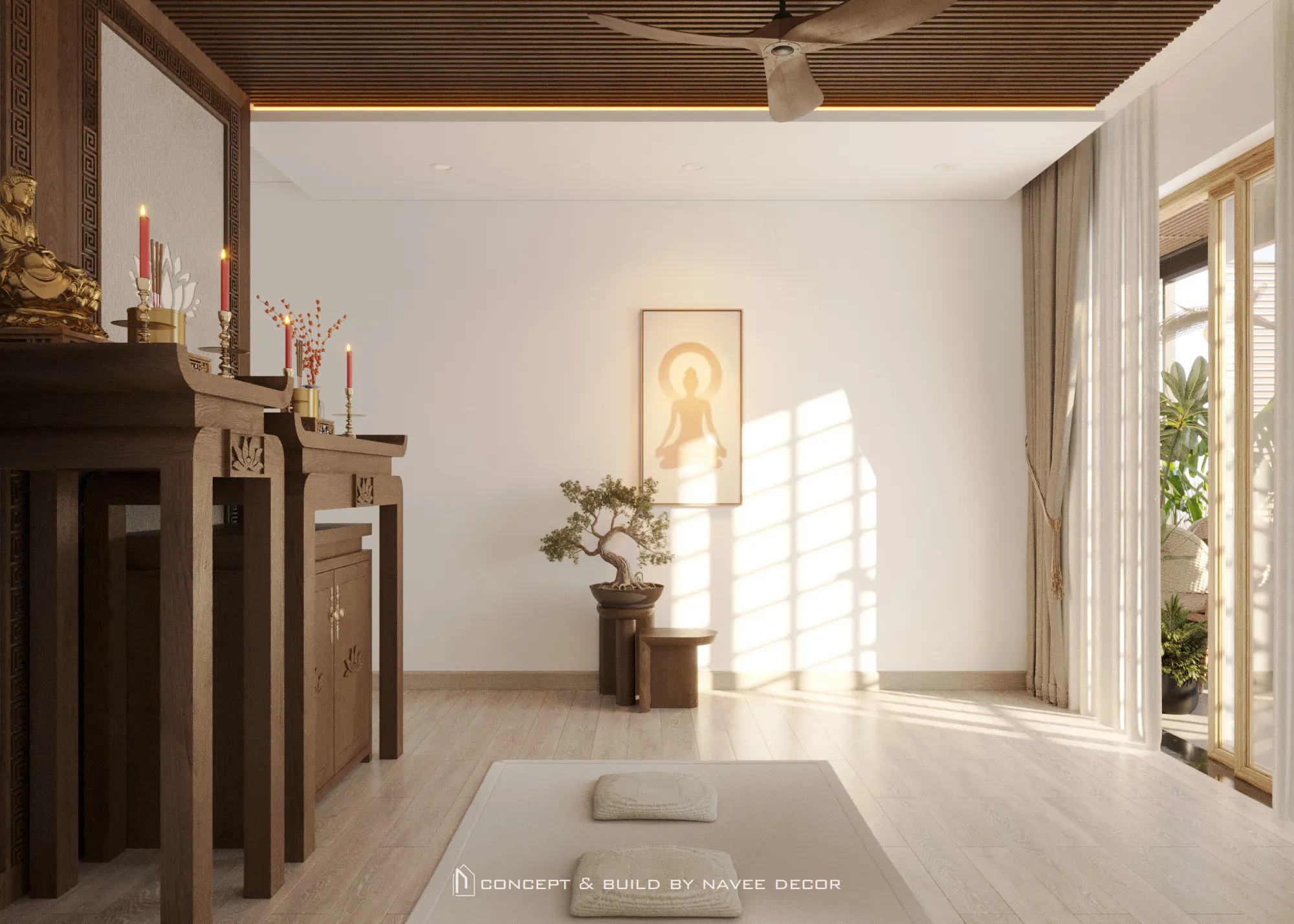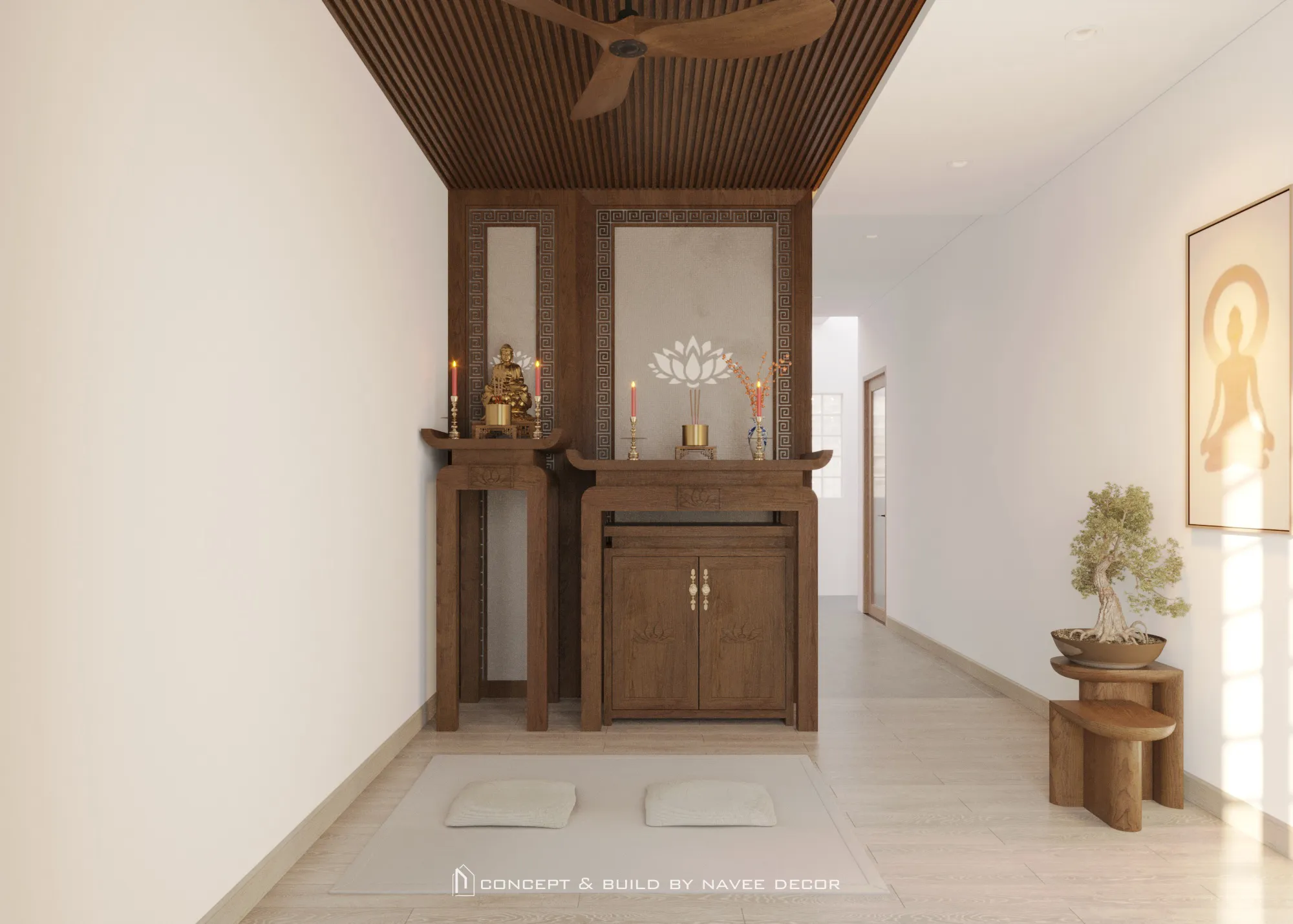 • Góc thiền nhỏ mang hương gỗ mộc và mùi nhang trầm thoang thoảng.