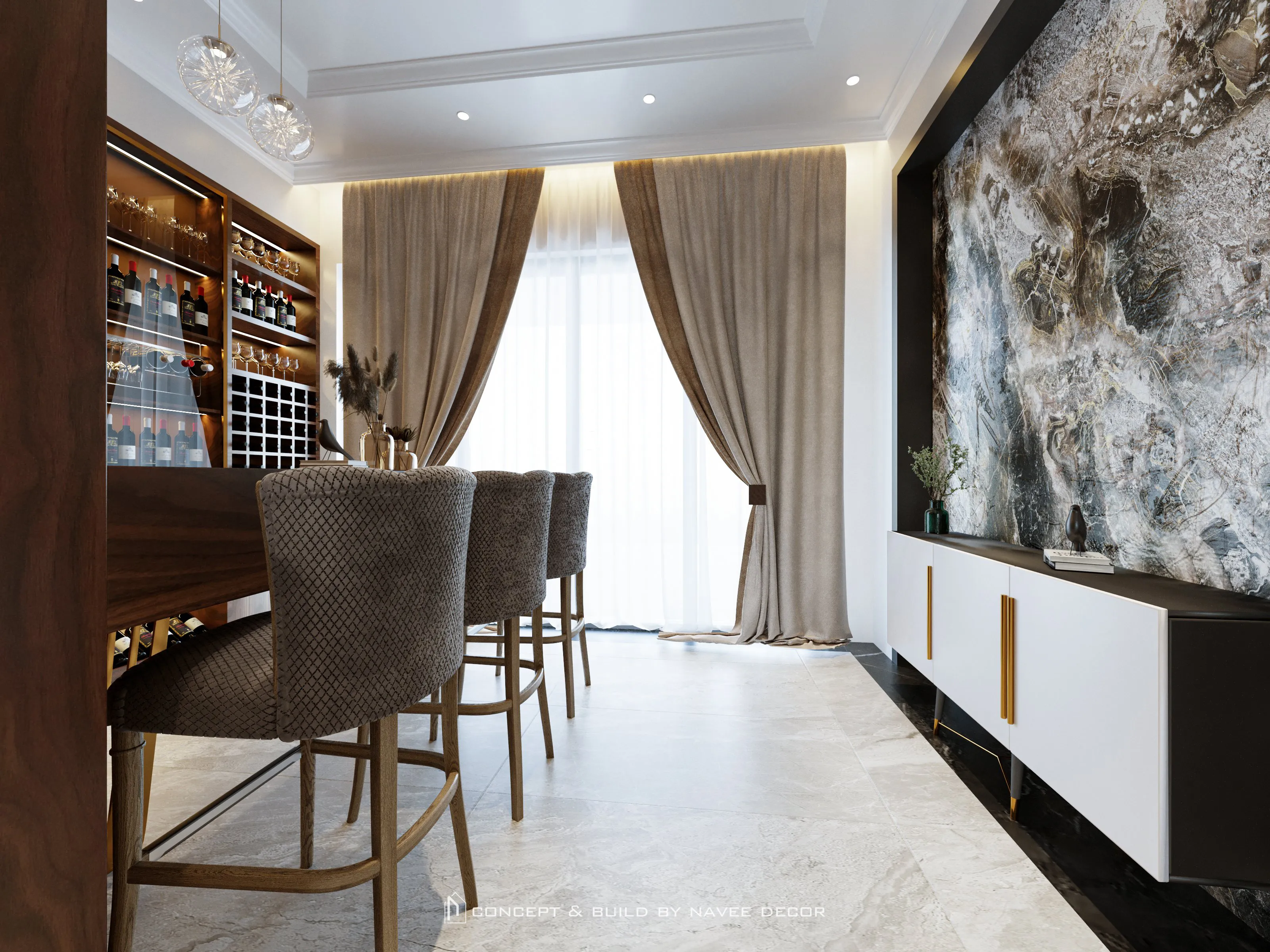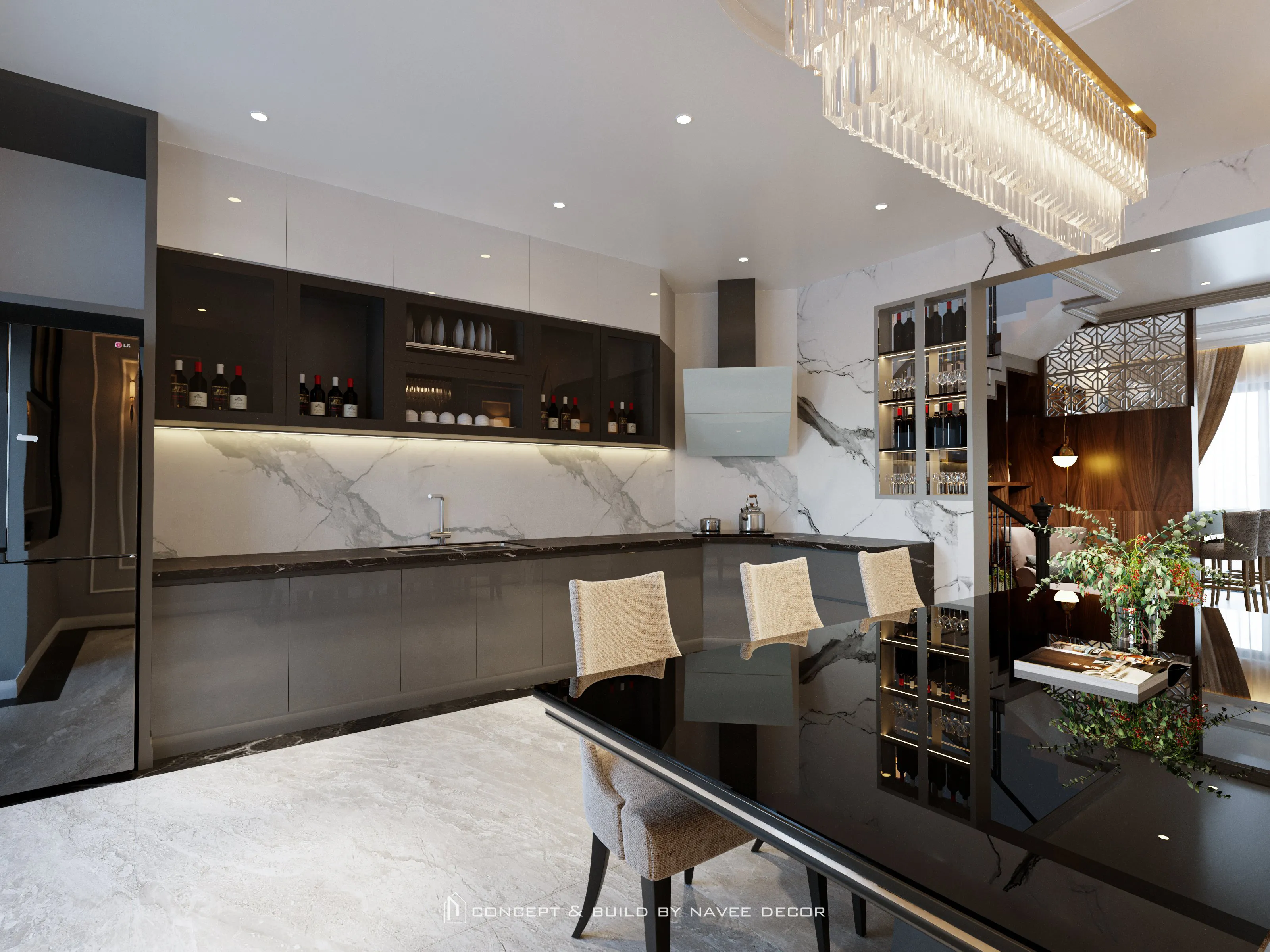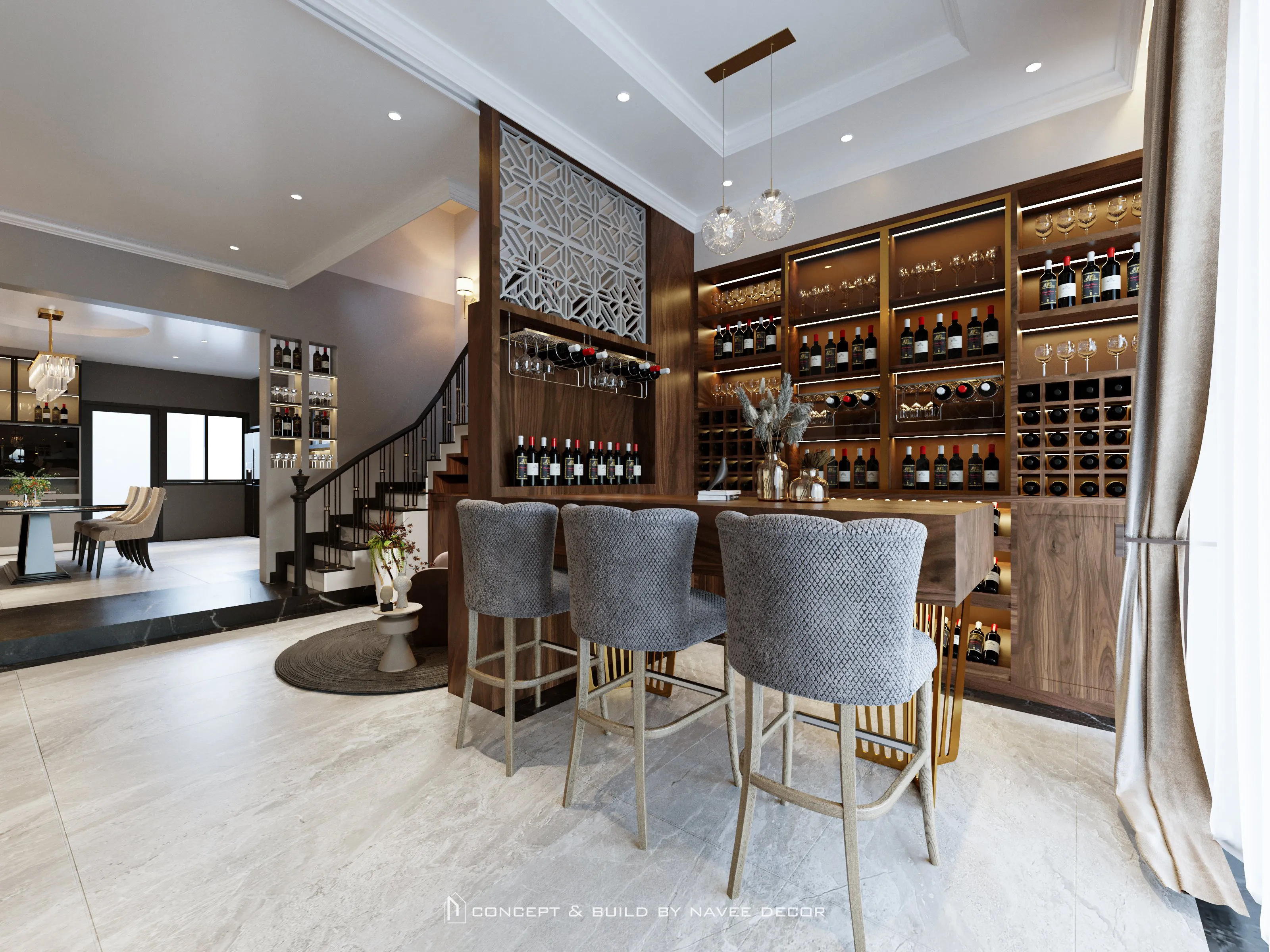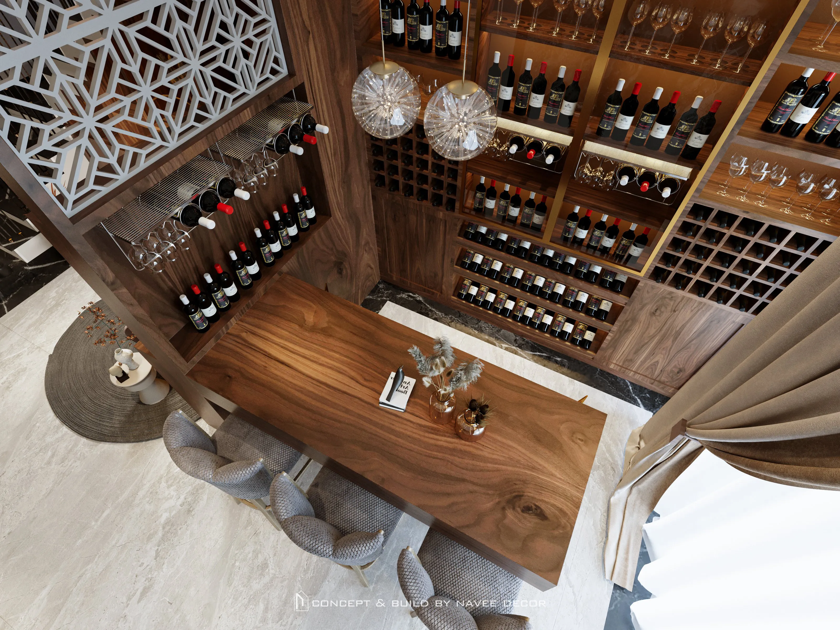 - Khu vực bar rượu “signature” của ngôi nhà – hệ tủ rượu gỗ tự nhiên thể hiện đẳng cấp và cá tính gia chủ.