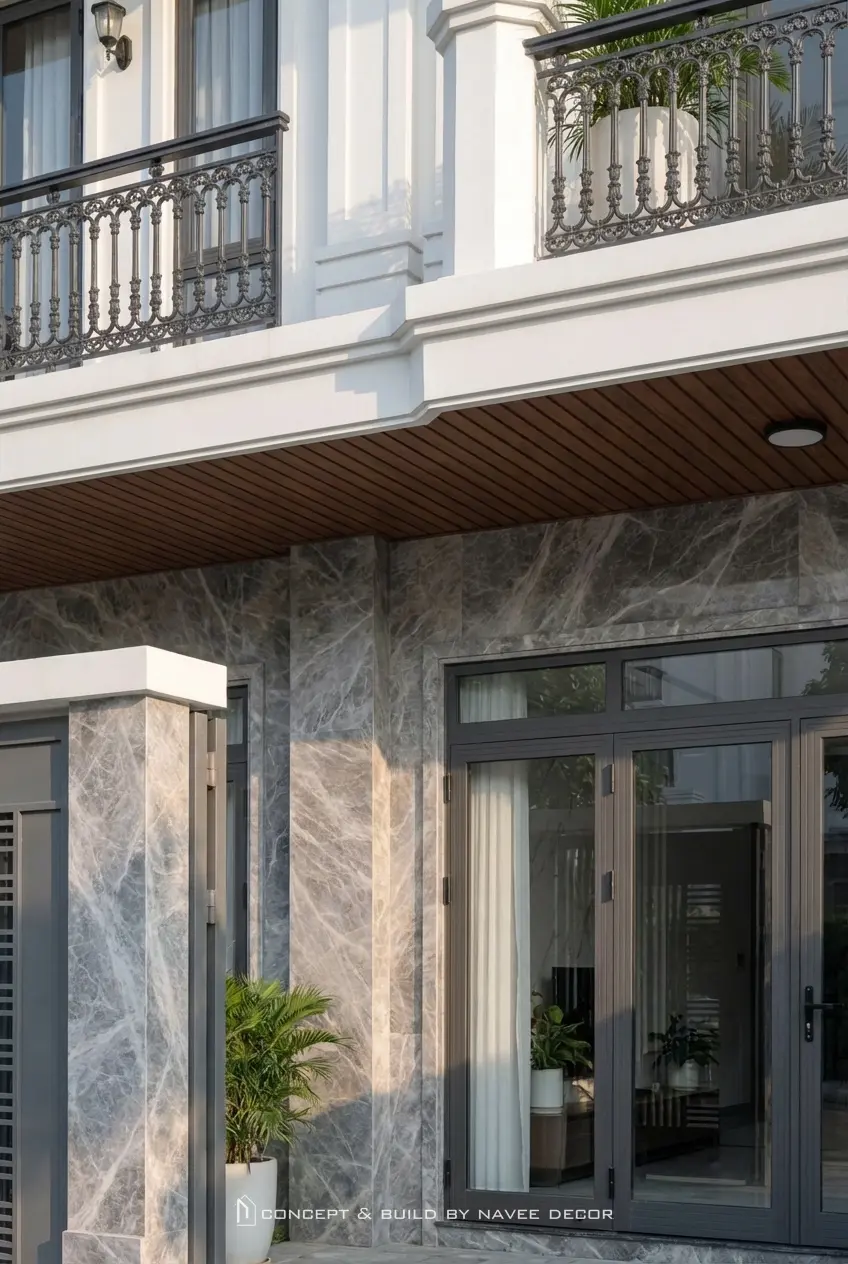 - Mảng đá ốp tầng trệt tăng độ bền và tính thẩm mỹ.