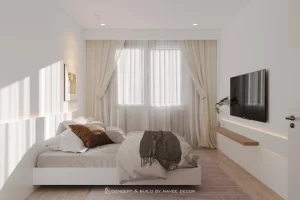 Ở dự án này, Navee Decor ưu tiên mở rộng tầm nhìn, tận dụng tối đa ánh nắng tự nhiên thông qua hệ cửa sổ lớn, rèm mỏng và bố cục không gian mở. Ánh sáng không chỉ làm sáng căn hộ, mà còn “chuyển động” theo từng thời điểm trong ngày, mang lại cảm giác sống chậm, an yên và tràn đầy năng lượng.