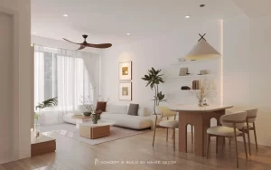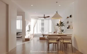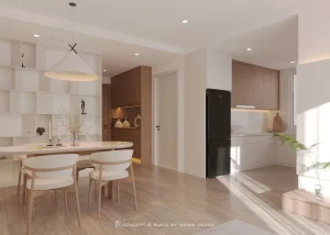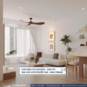 Lấy cảm hứng từ tinh thần Minimalism x Japandi pha trộn tinh thần Á Đông nhẹ nhàng, căn hộ VCN Phước Hải là sự giao thoa hài hòa giữa nét tối giản hiện đại và hơi thở ấm áp của vật liệu tự nhiên. Gam màu trắng, be, gỗ sáng được xử lý khéo léo, tạo nên một tổng thể thanh thoát, thư giãn nhưng vẫn đủ đầy cảm xúc.