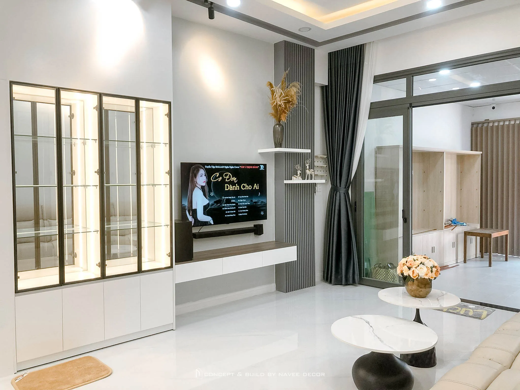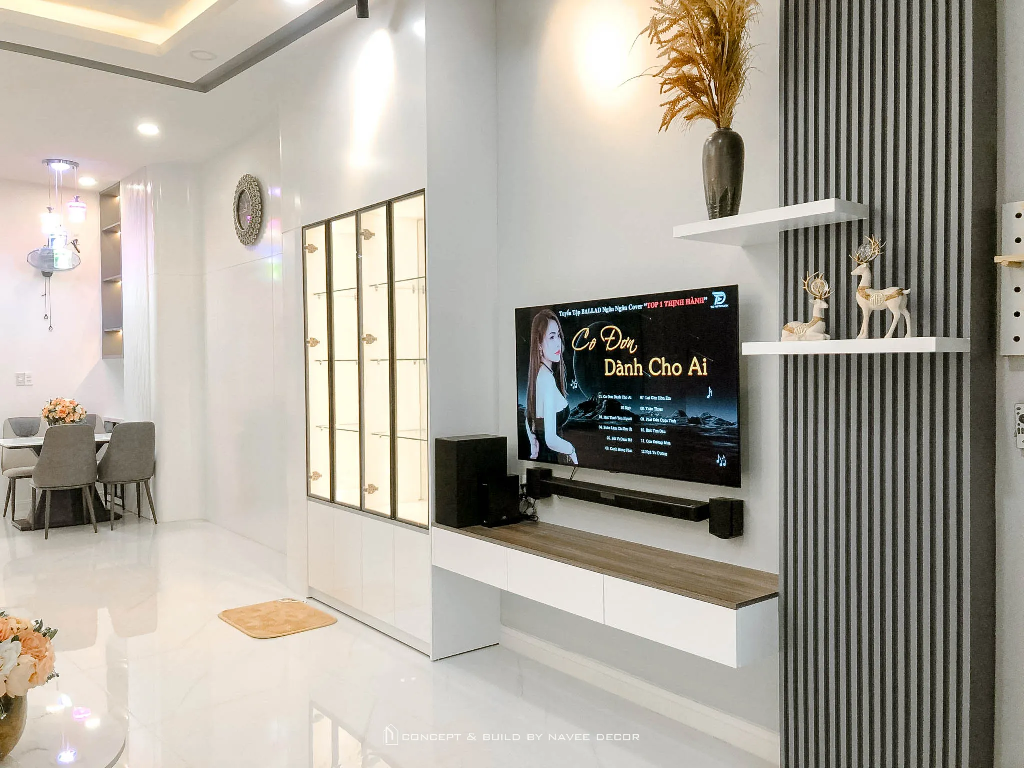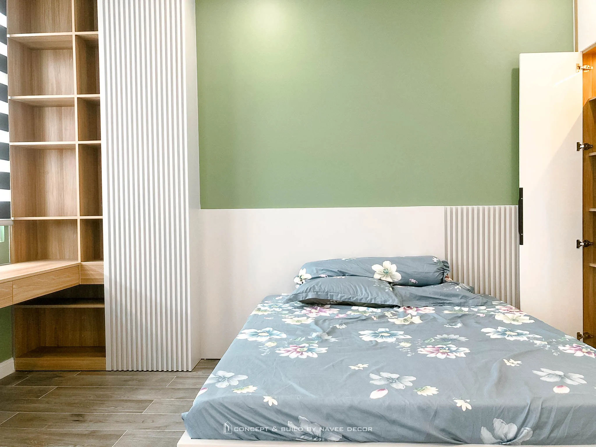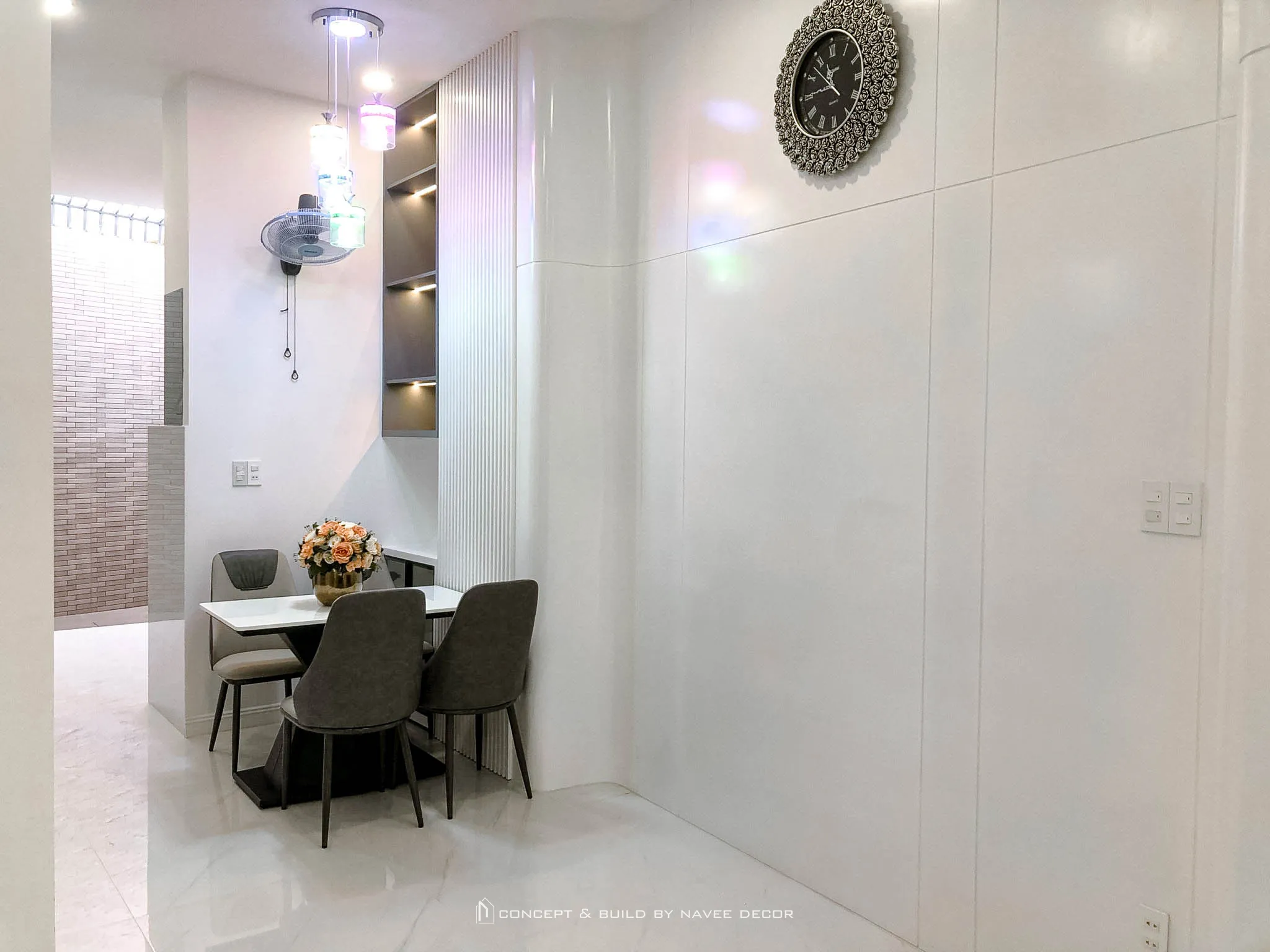 Đặc trưng của nhà phố là diện tích chiều ngang hạn chế. Vì vậy, Navee đã triển khai giải pháp không gian liên thông phòng, tối giản chi tiết nhưng vẫn đảm bảo đầy đủ công năng, sử dụng nội thất “đo ni đóng giày” theo kích thước thực tế.