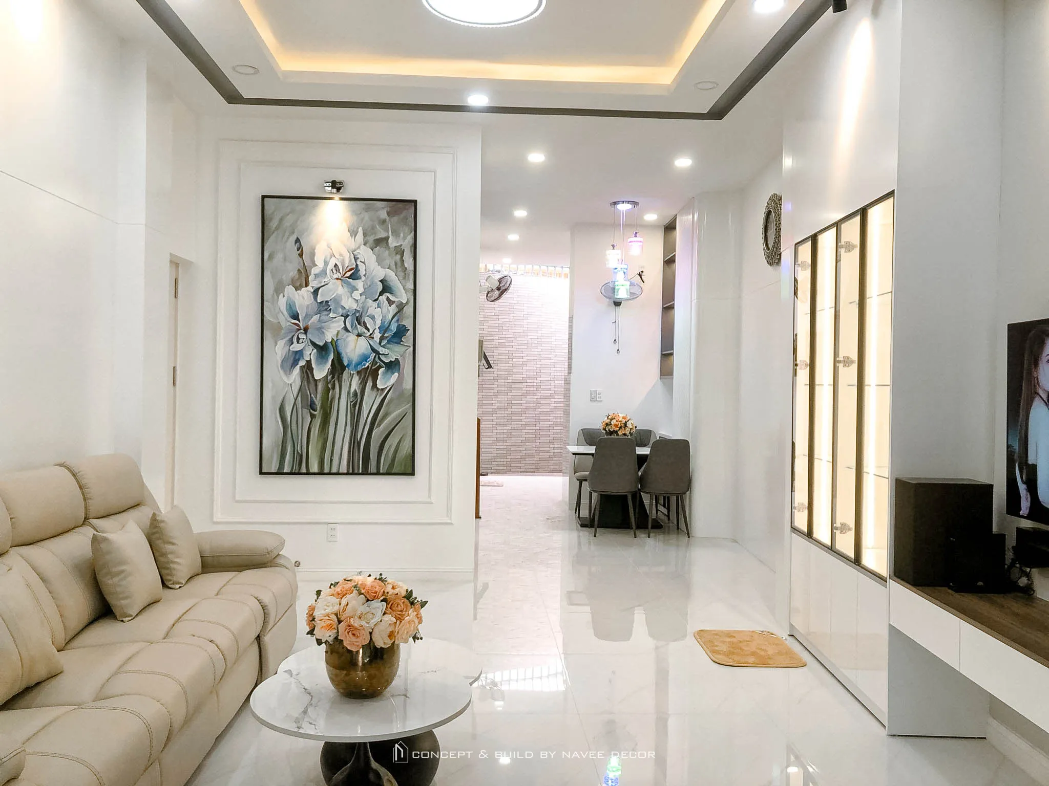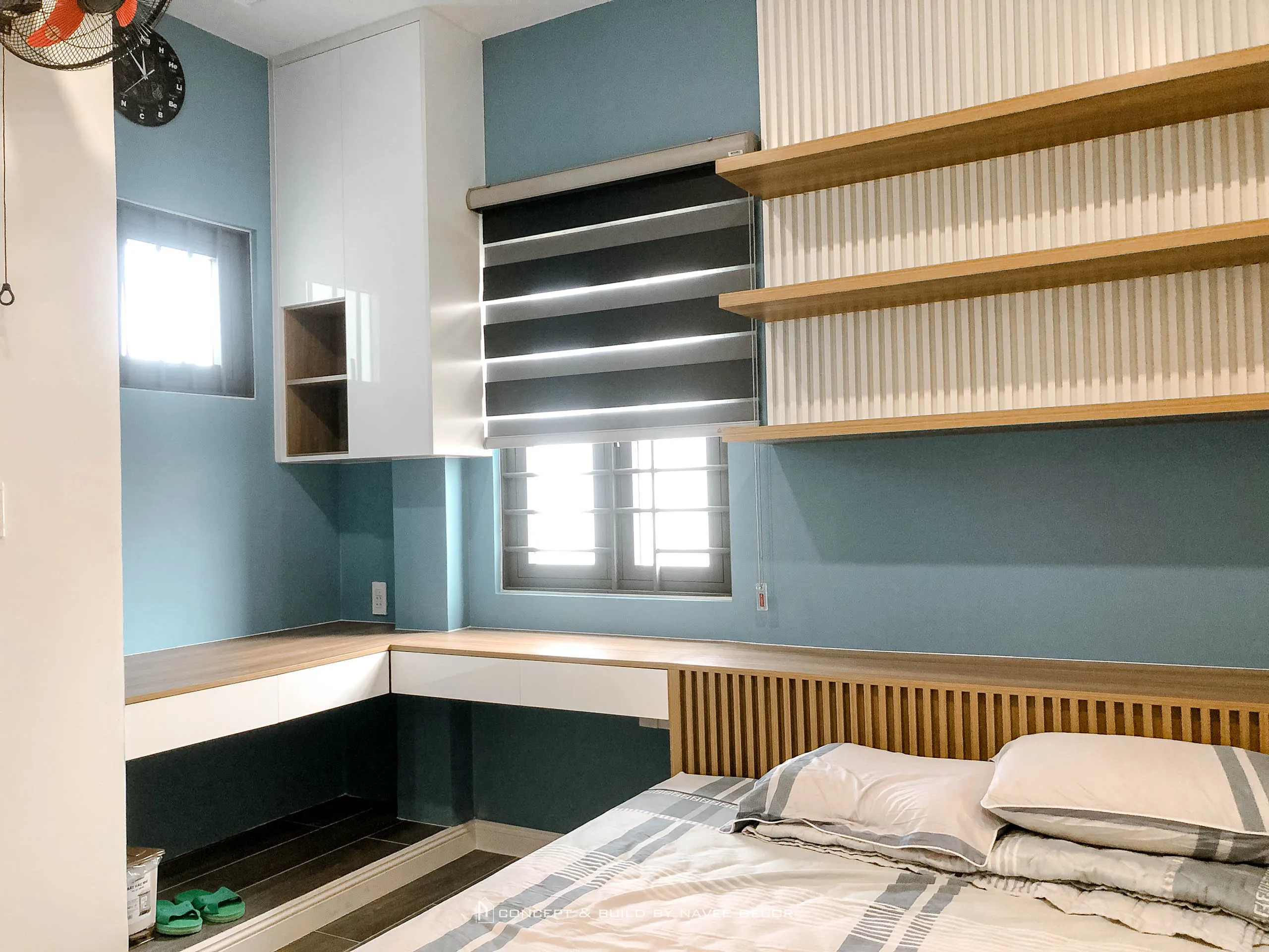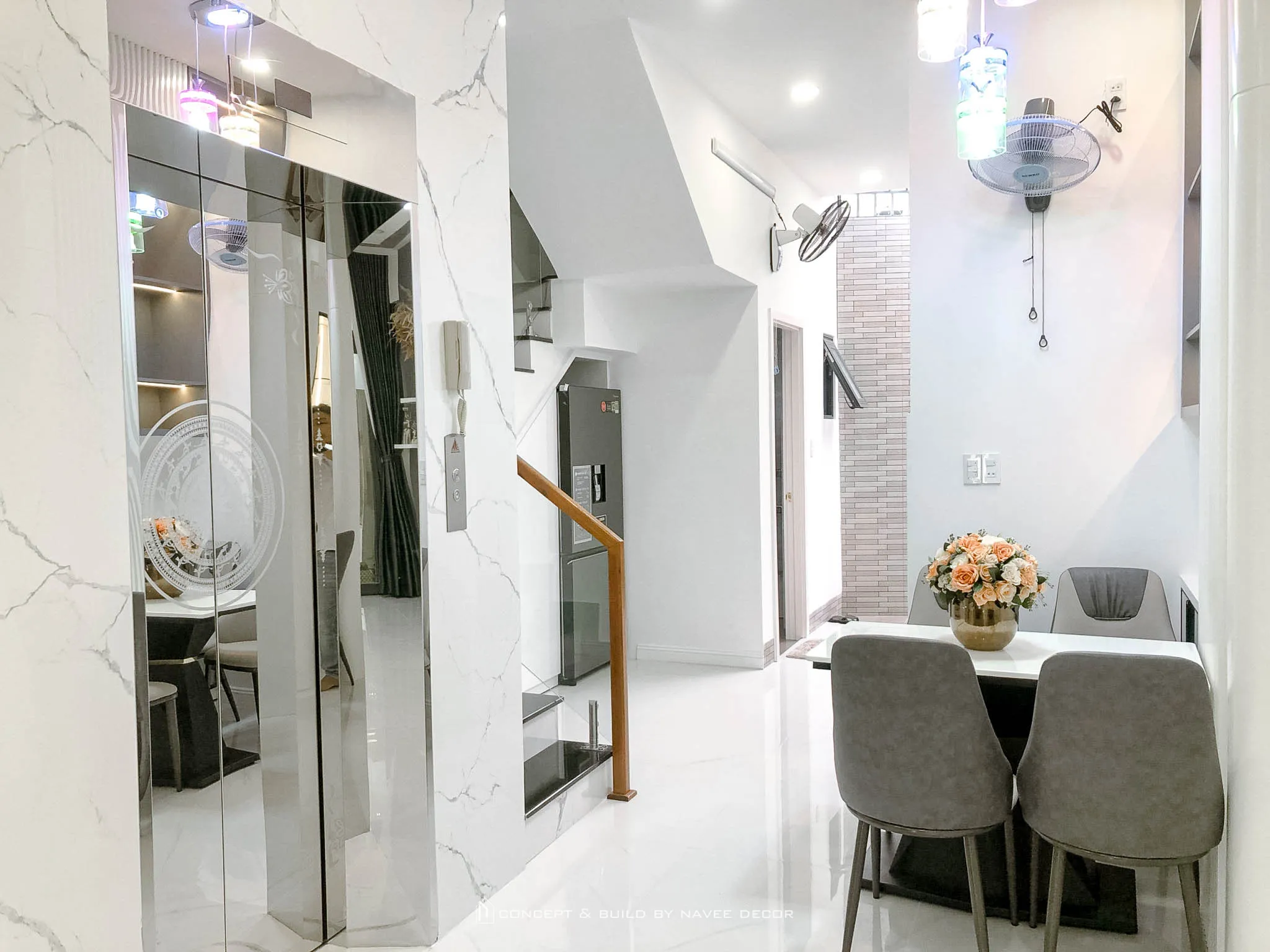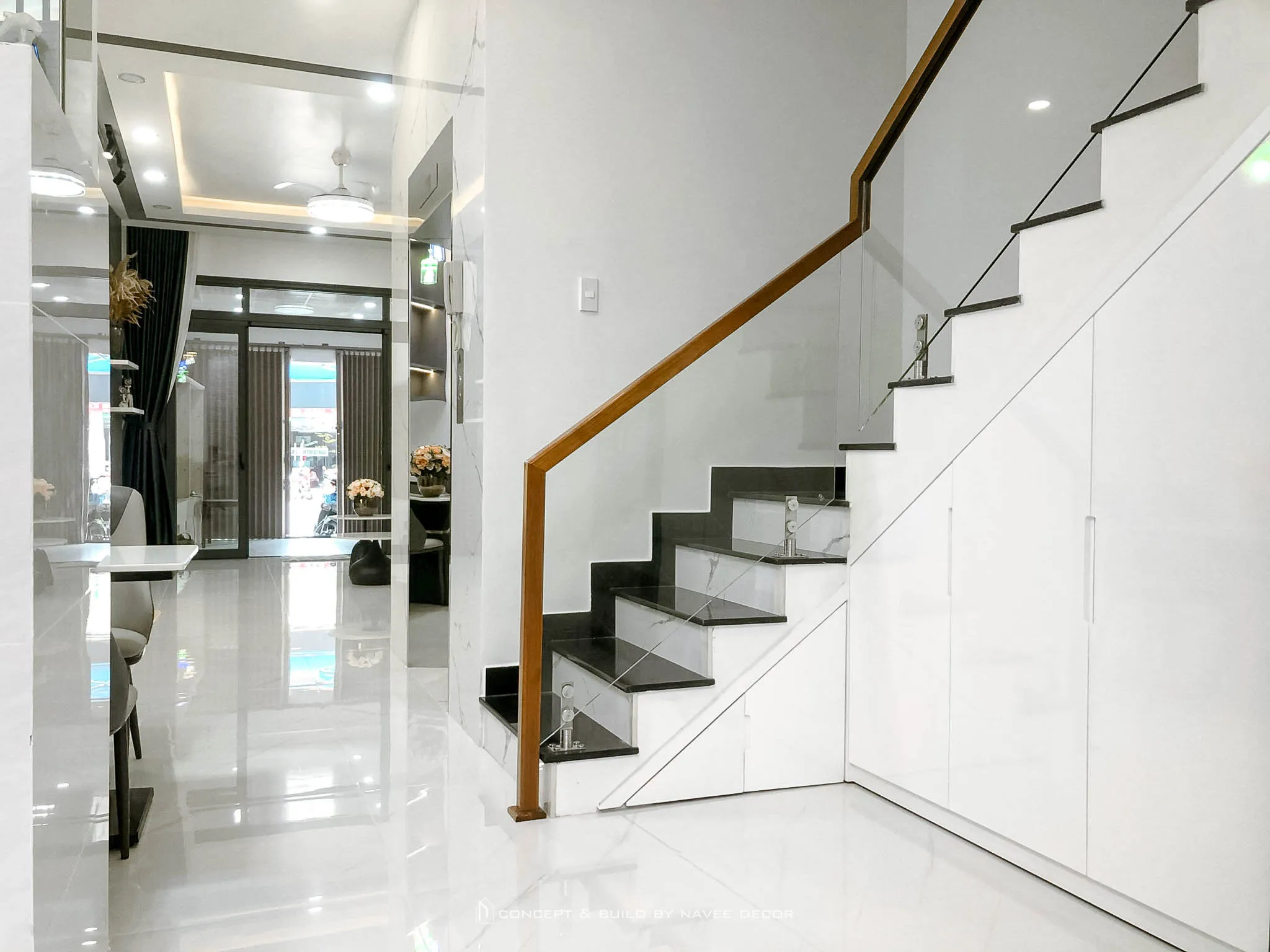 Đặc trưng của nhà phố là diện tích chiều ngang hạn chế. Vì vậy, Navee đã triển khai giải pháp không gian liên thông phòng, tối giản chi tiết nhưng vẫn đảm bảo đầy đủ công năng, sử dụng nội thất “đo ni đóng giày” theo kích thước thực tế.