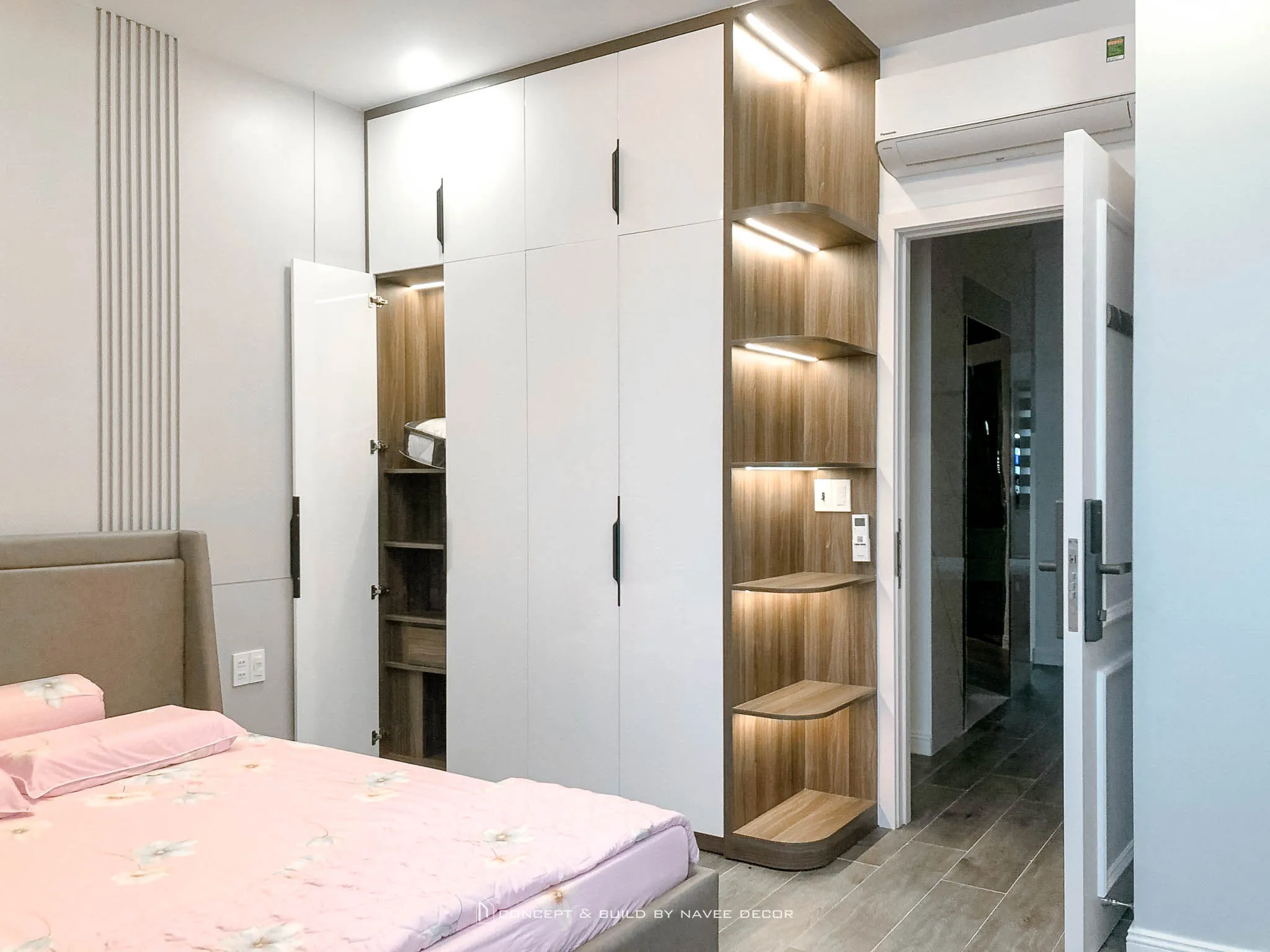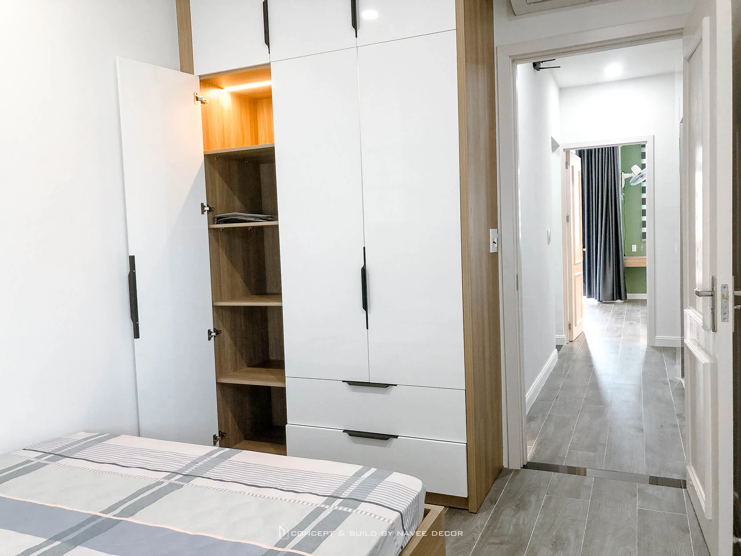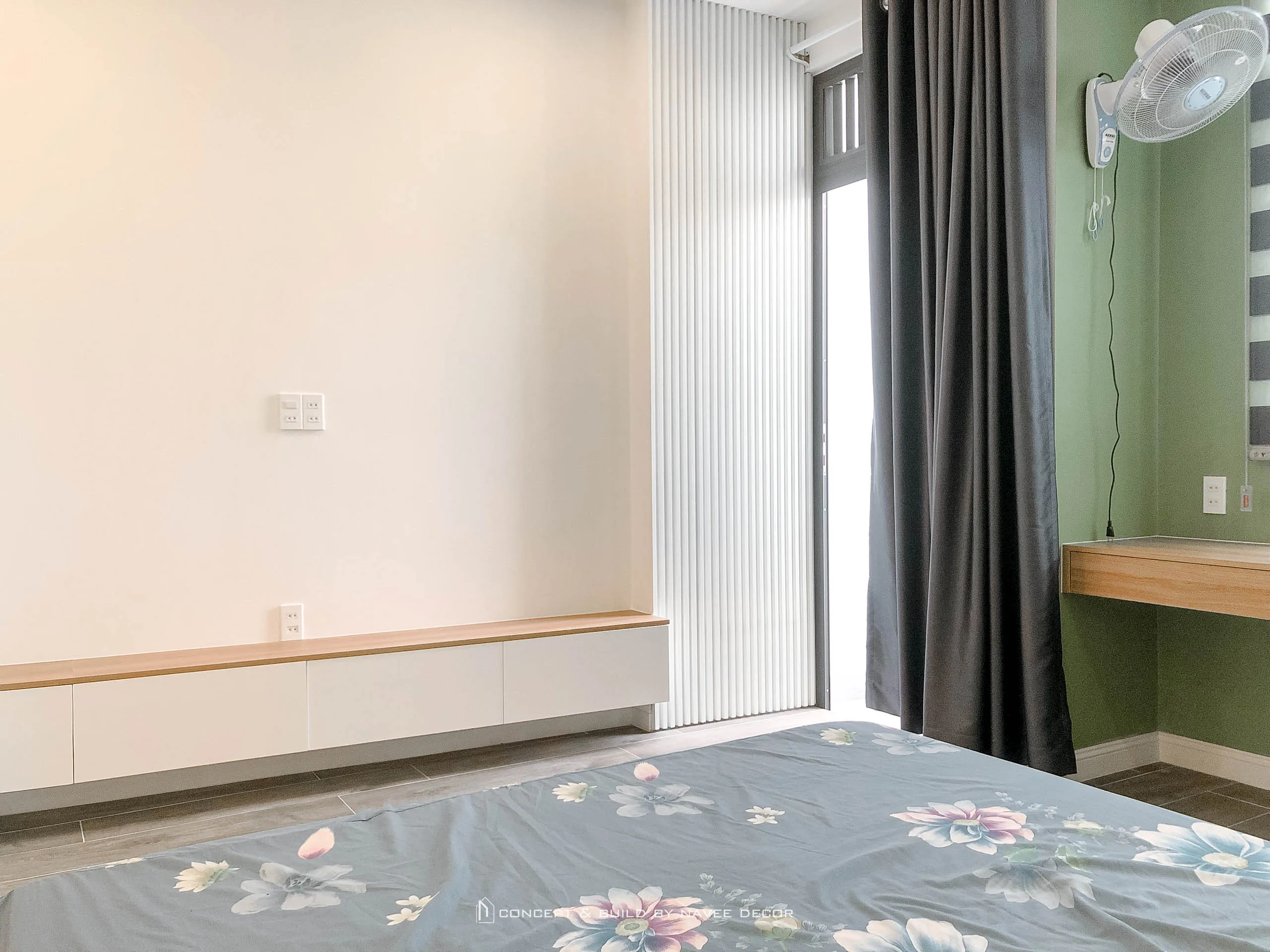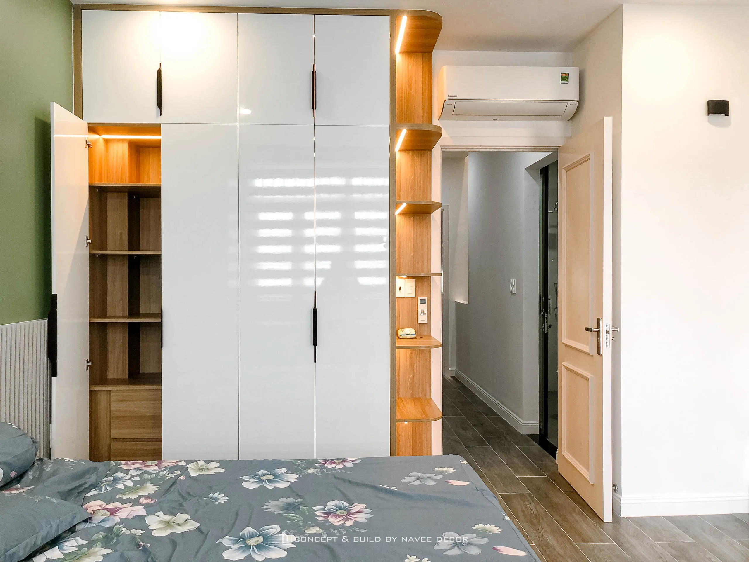 Đặc trưng của nhà phố là diện tích chiều ngang hạn chế. Vì vậy, Navee đã triển khai giải pháp không gian liên thông phòng, tối giản chi tiết nhưng vẫn đảm bảo đầy đủ công năng, sử dụng nội thất “đo ni đóng giày” theo kích thước thực tế.