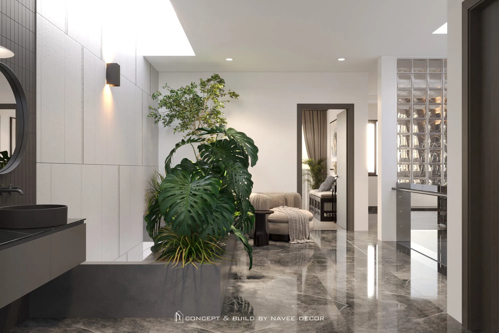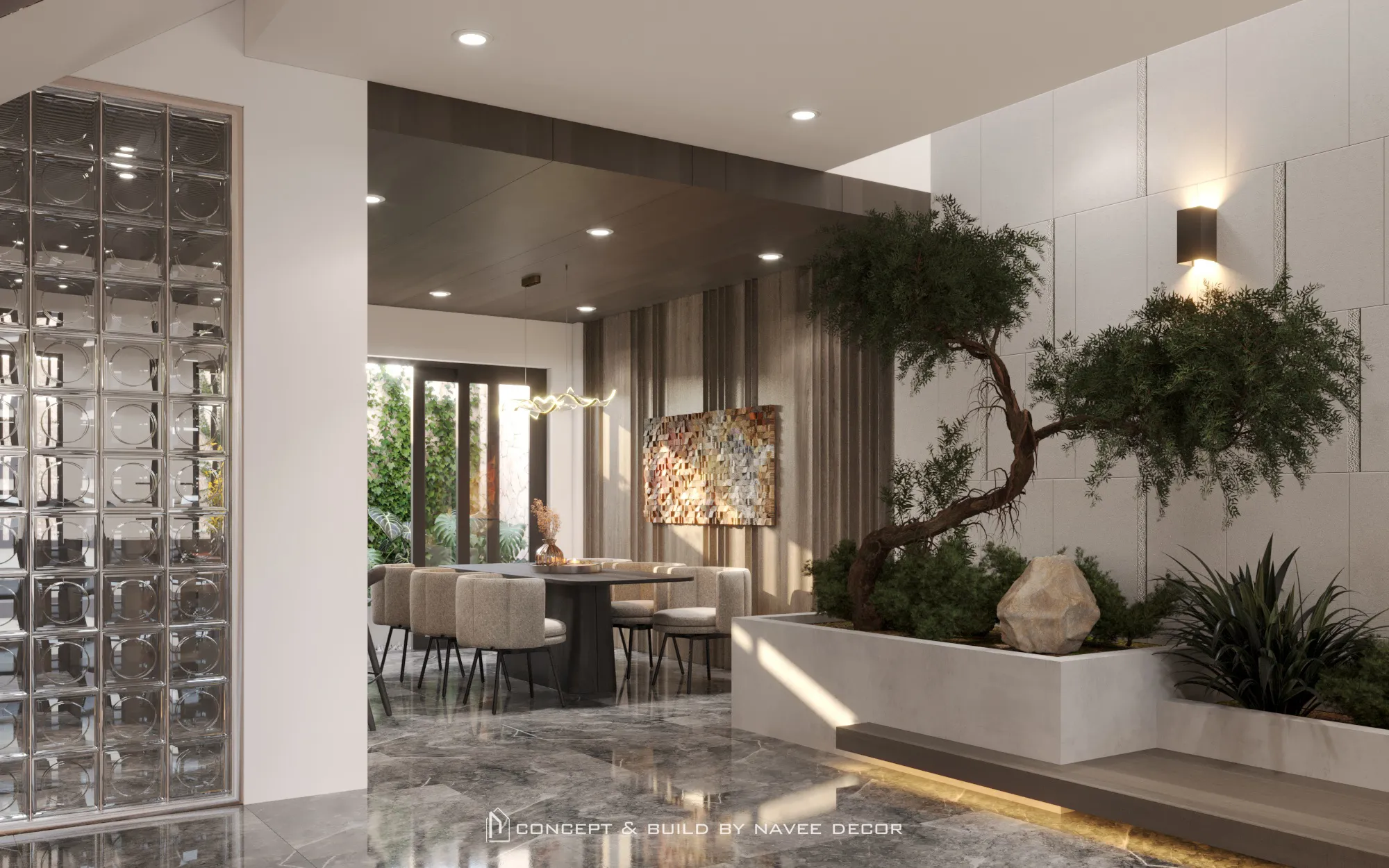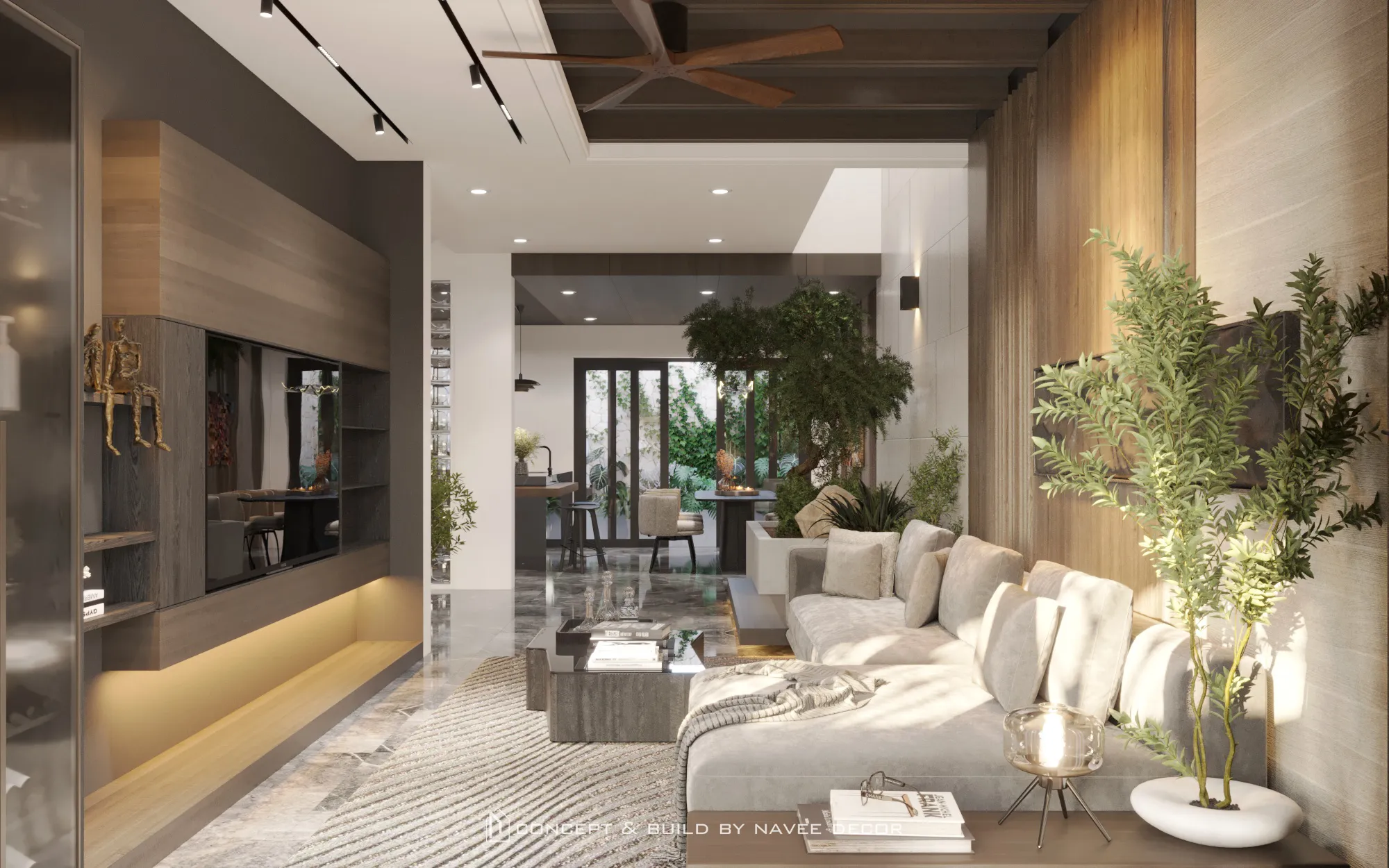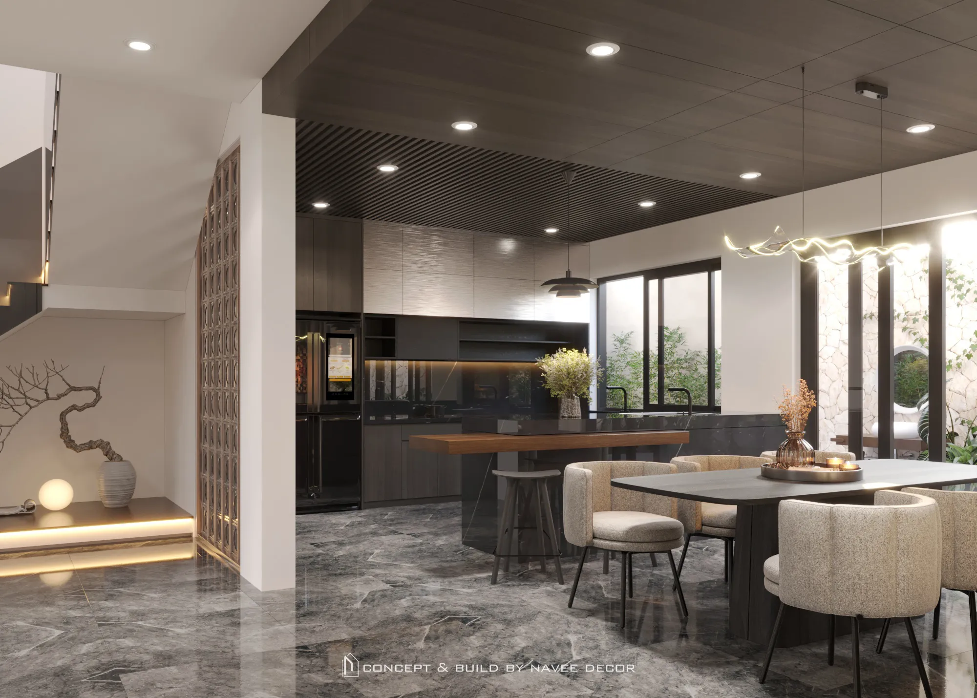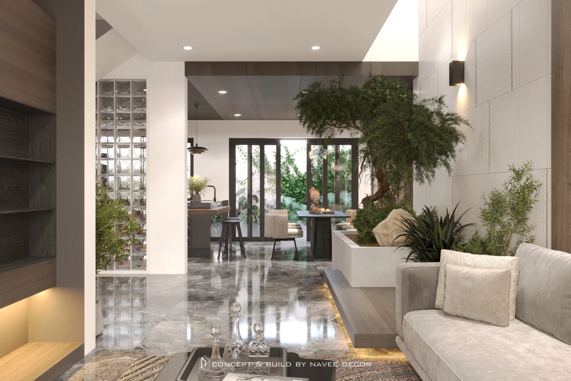 Không gian mở ra bằng khoảng đệm xanh mát đón ánh sáng tự nhiên. Bên trong, bảng màu trung tính sang trọng kết hợp cùng chất liệu gỗ, đá và kim loại tạo nên tổng thể hài hòa và tràn đầy sinh khí.