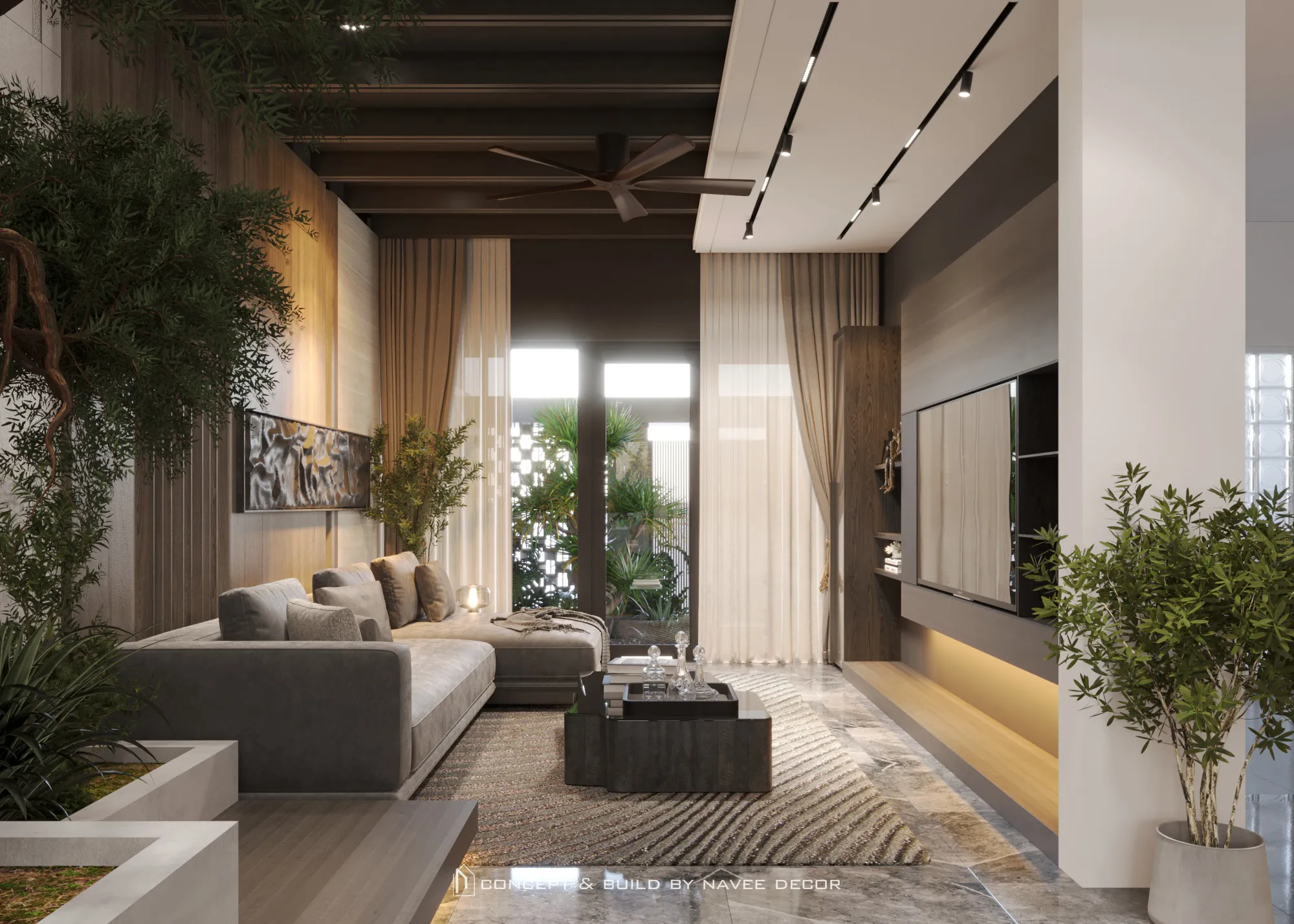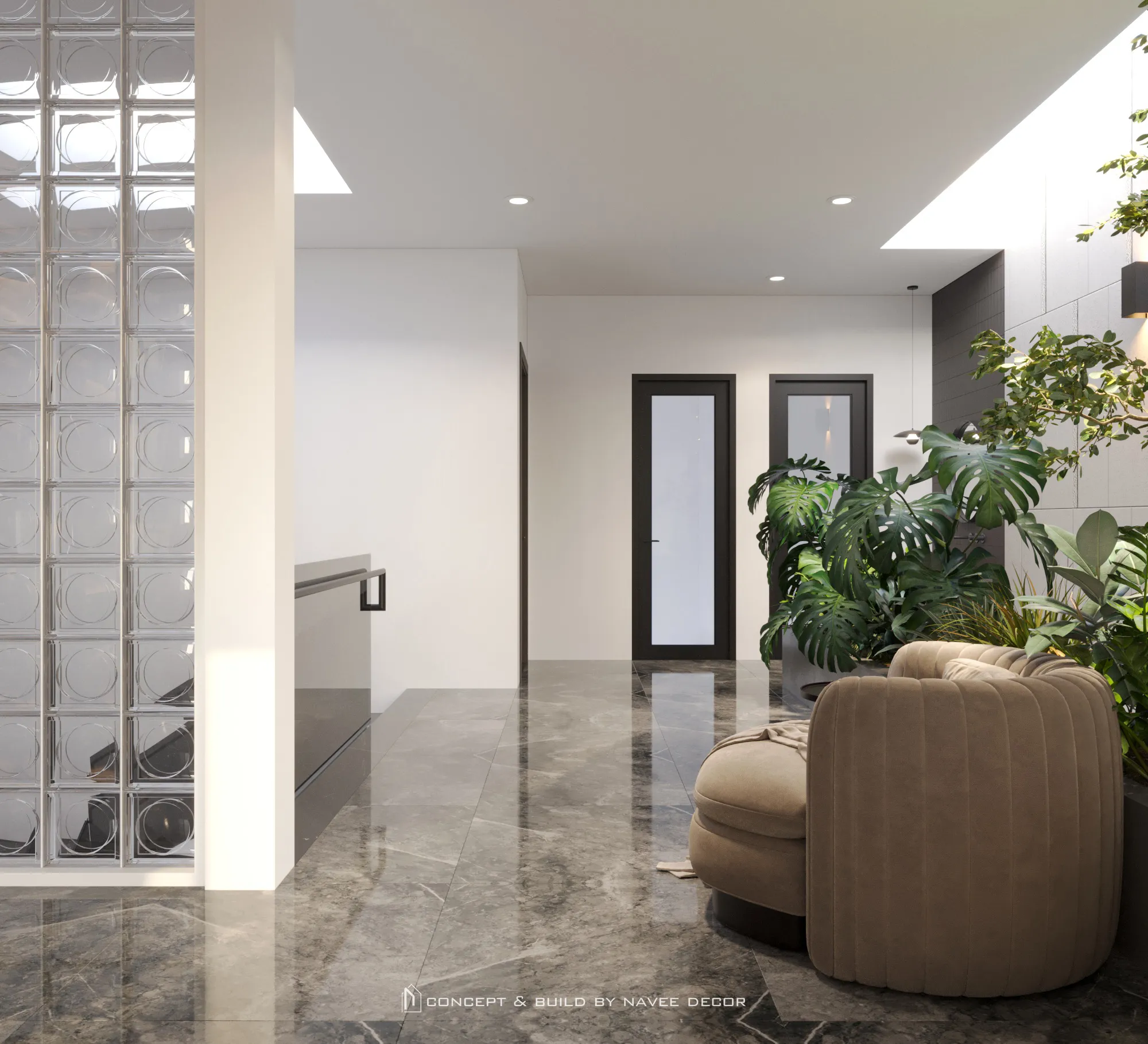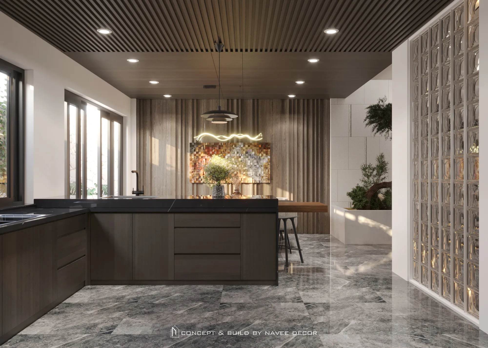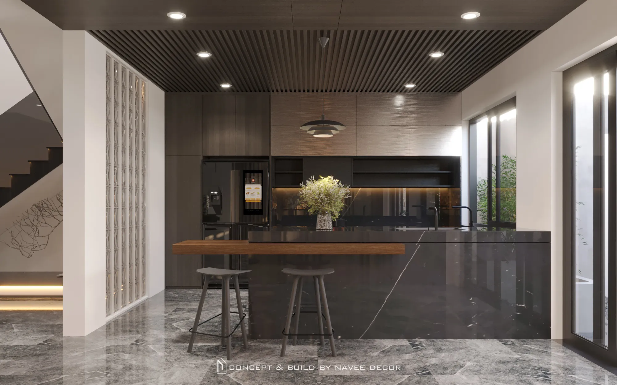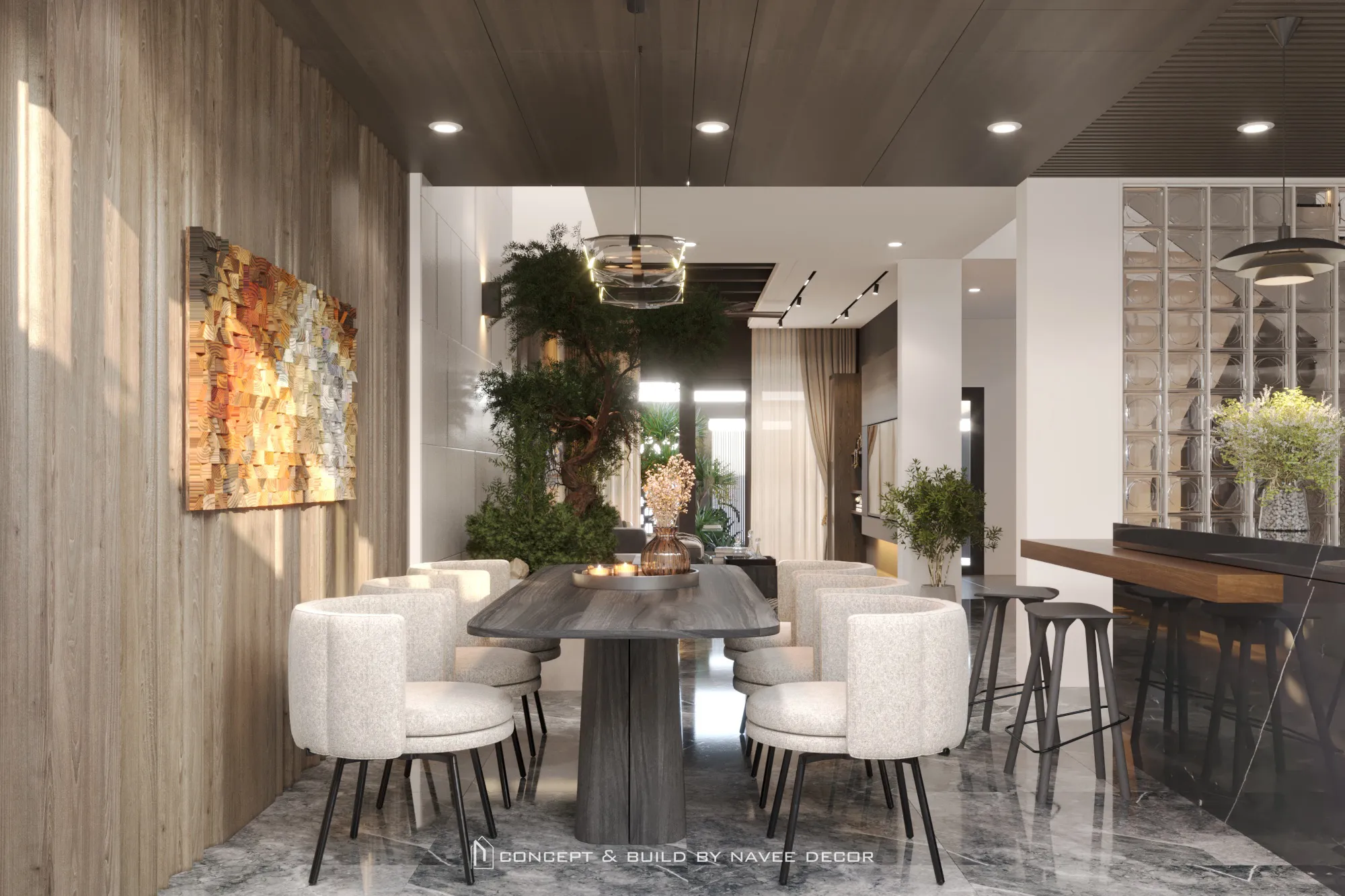 Không gian mở ra bằng khoảng đệm xanh mát đón ánh sáng tự nhiên. Bên trong, bảng màu trung tính sang trọng kết hợp cùng chất liệu gỗ, đá và kim loại tạo nên tổng thể hài hòa và tràn đầy sinh khí.