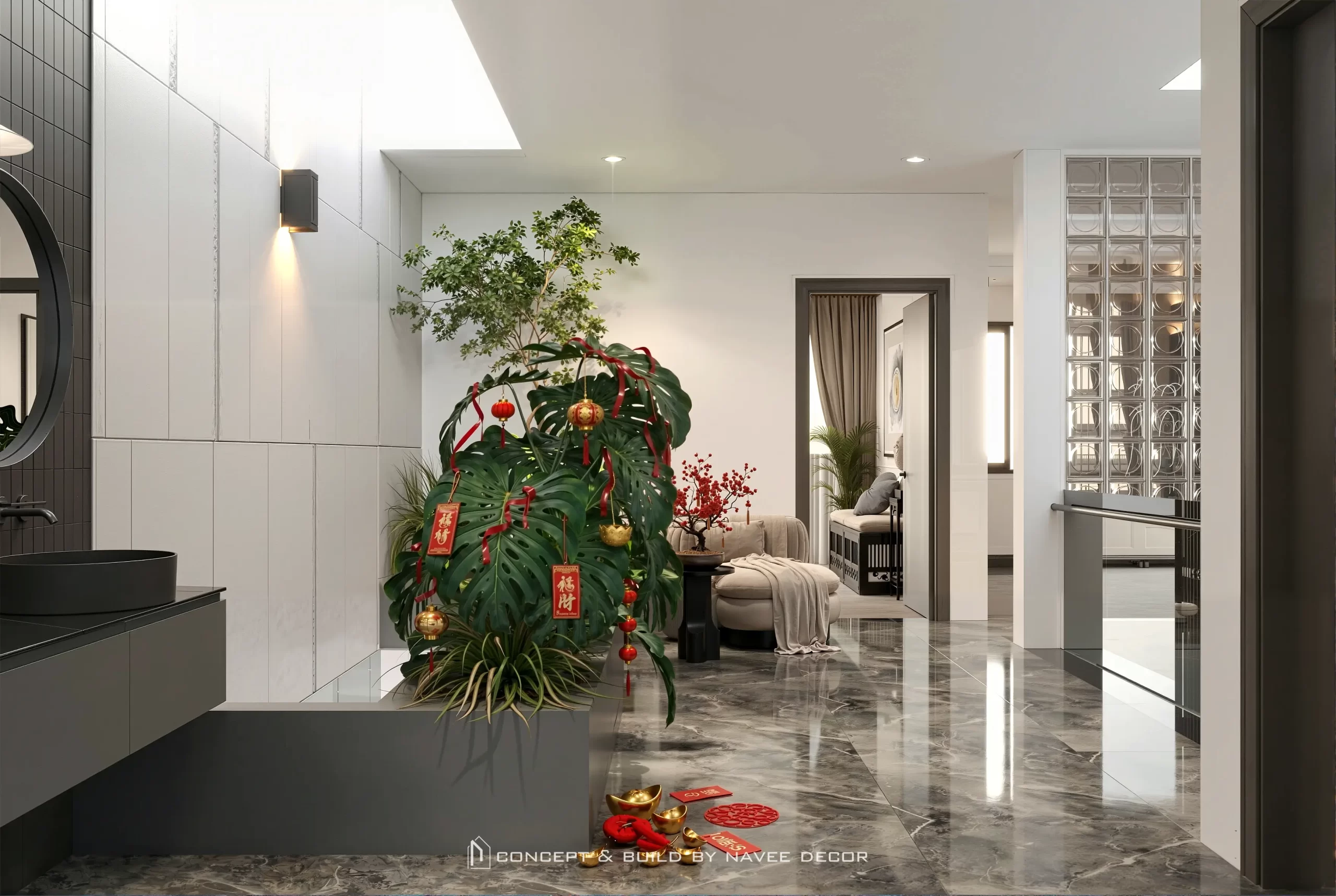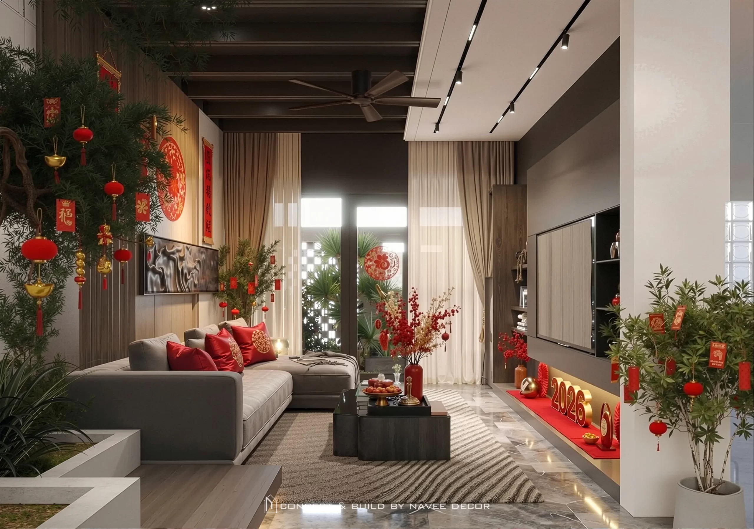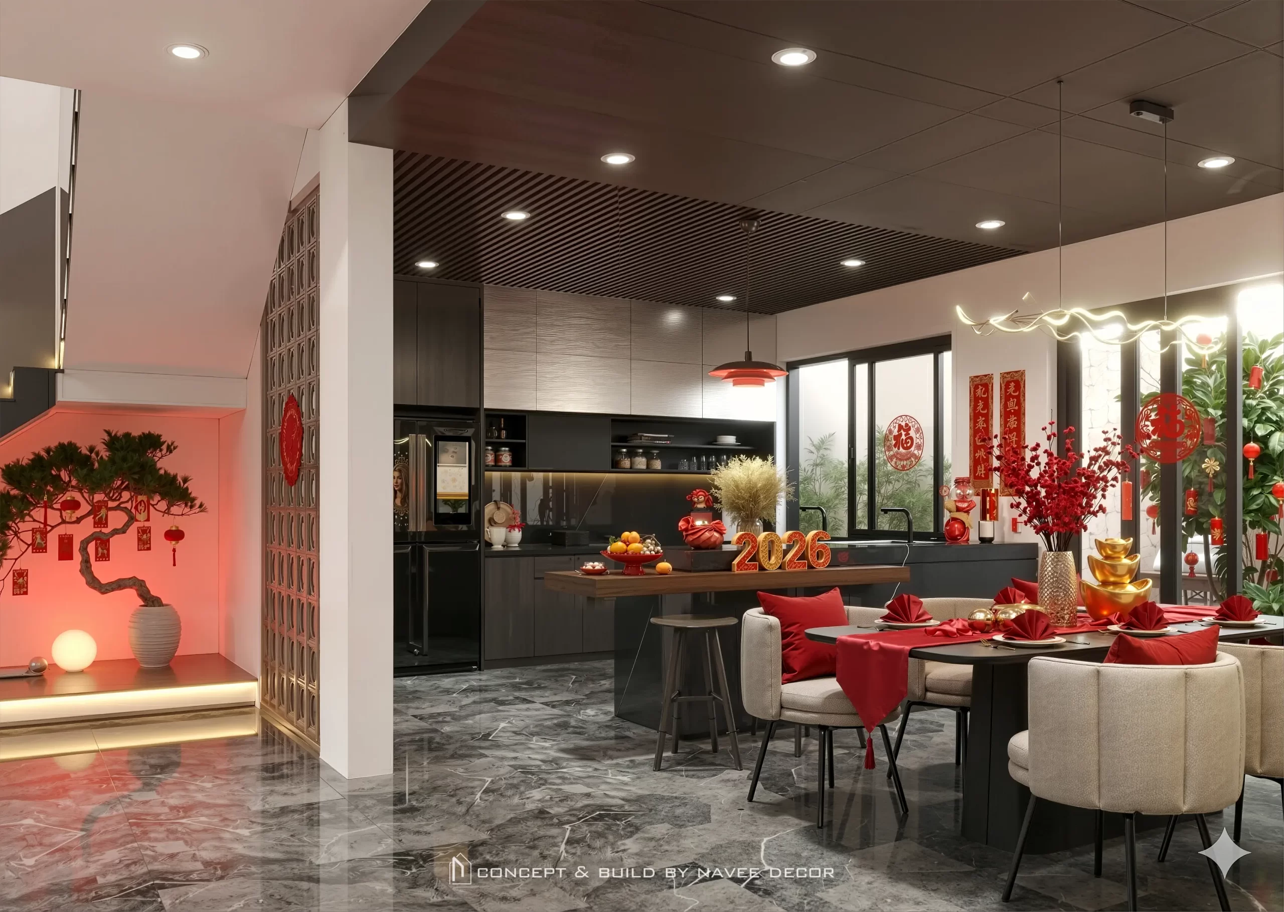 Đặc biệt khi Tết về, ngôi nhà như được “đánh thức” bởi những điểm nhấn sắc đỏ may mắn. Từ phòng khách ấm cúng, khu bếp gắn kết đến bàn ăn sang trọng — tất cả đem lại một bầu không khí đoàn viên ấm áp, nơi mỗi khoảnh khắc sum họp đều trở nên ý nghĩa và đủ đầy yêu thương.