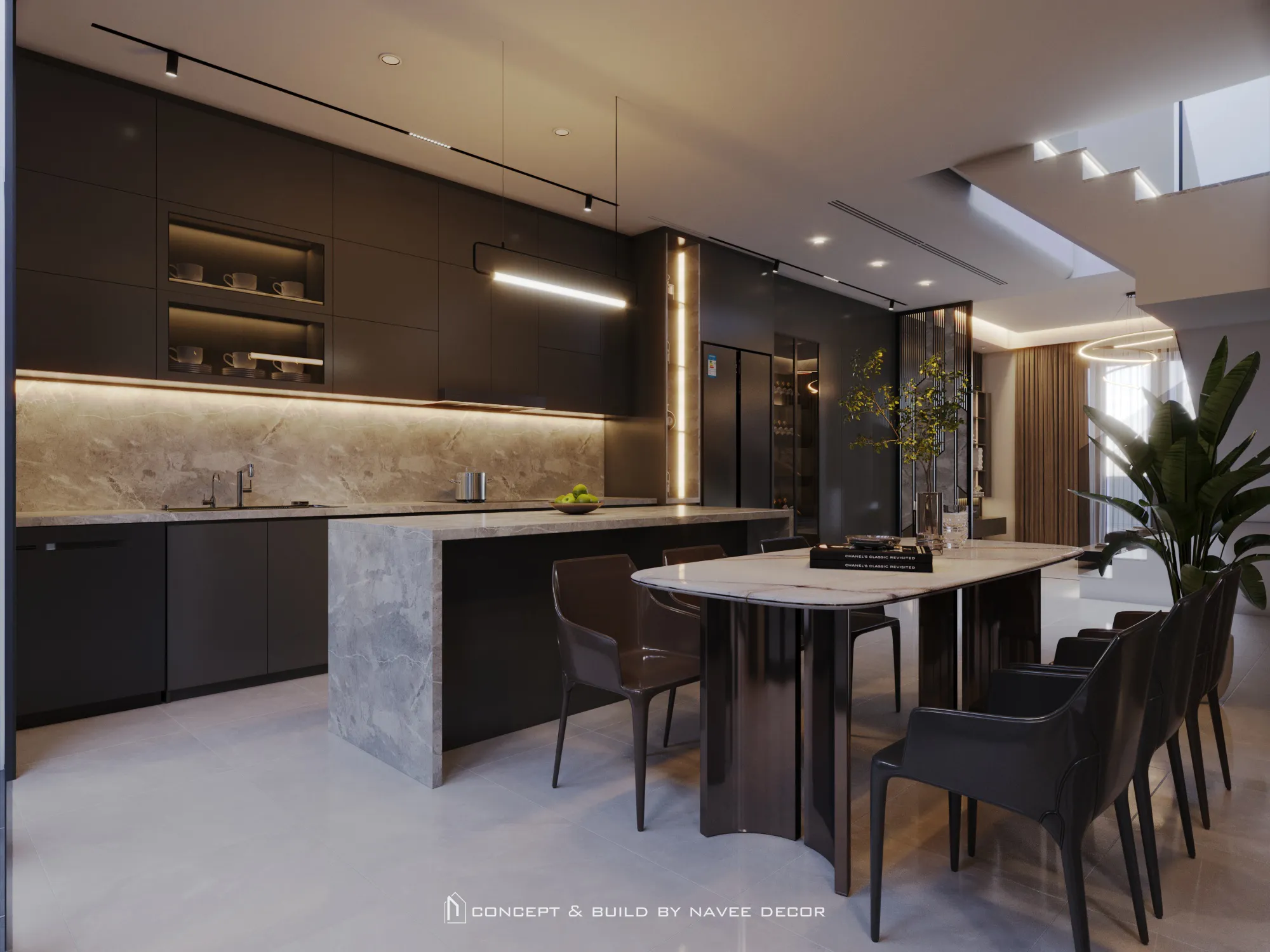 Khu bếp không còn là "góc khuất cuối nhà" mà trở thành sân khấu trung tâm. Hệ tủ âm tường được đẩy về một phía, nhường chỗ cho đảo đá tự nhiên vươn ra như điểm neo thị giác, là nơi gia đình tụ họp.
