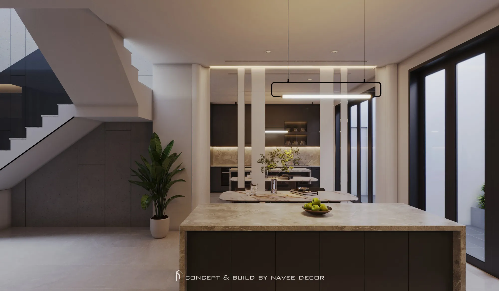Hãy tưởng tượng: bạn bước qua cửa, và ánh mắt tự nhiên bị dẫn dắt bởi một đường thẳng vô hình xuyên suốt từ sảnh – cầu thang – bếp – đảo ăn. Không có vách ngăn nào chặn lại. Không có góc khuất nào làm gián đoạn tầm nhìn, chức năng này chuyển tiếp sang chức năng khác một cách mượt mà như bản nhạc không lời.