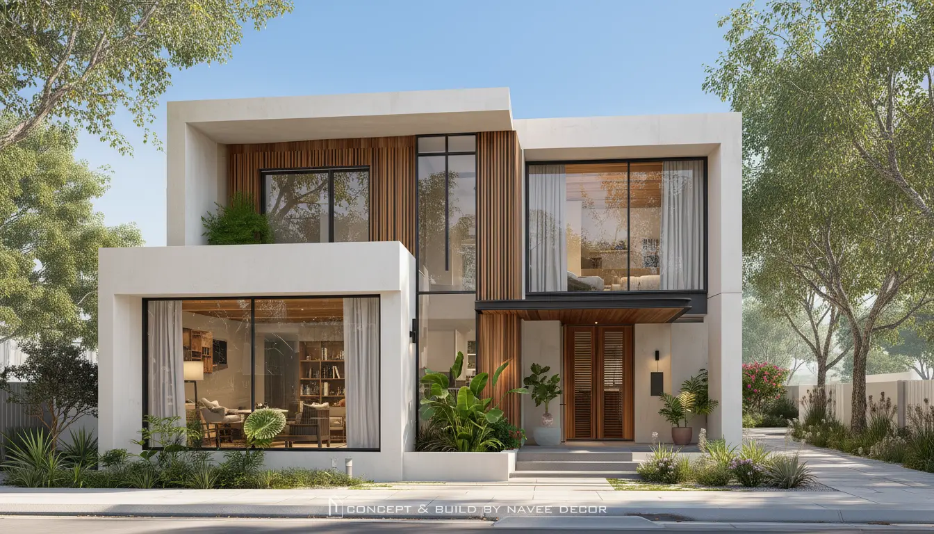 Concept đầu tiên của chuỗi phong cách thiết kế tại Navee Decor là sự kết hợp hài hòa giữa tối giản hiện đại và ấm áp tự nhiên. Với mặt tiền hình khối hiện đại, những mảng tường trắng tinh gọn kết hợp lam gỗ ấm tinh tế tạo nên vẻ đẹp thời thượng nhưng gần gũi.
