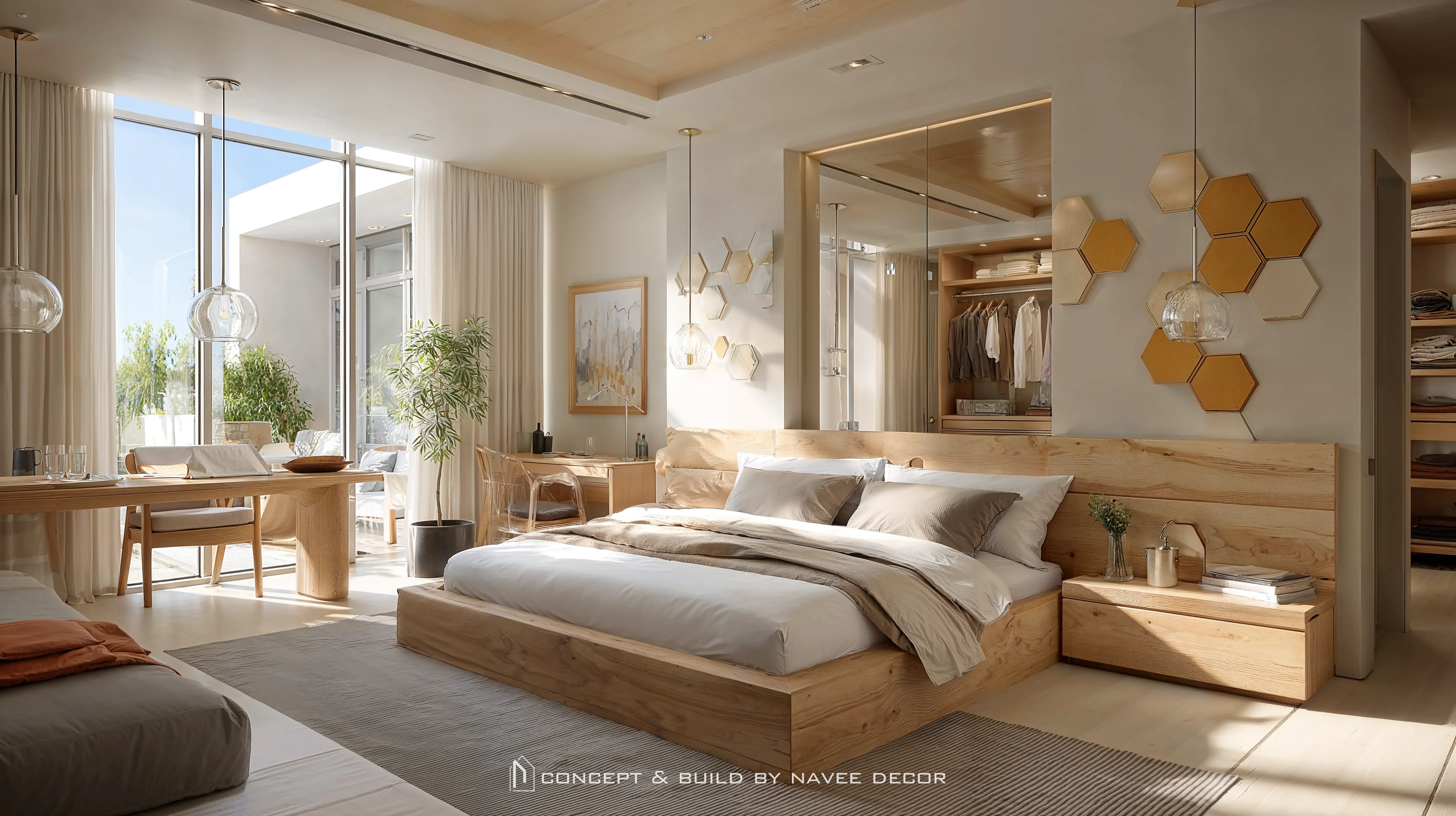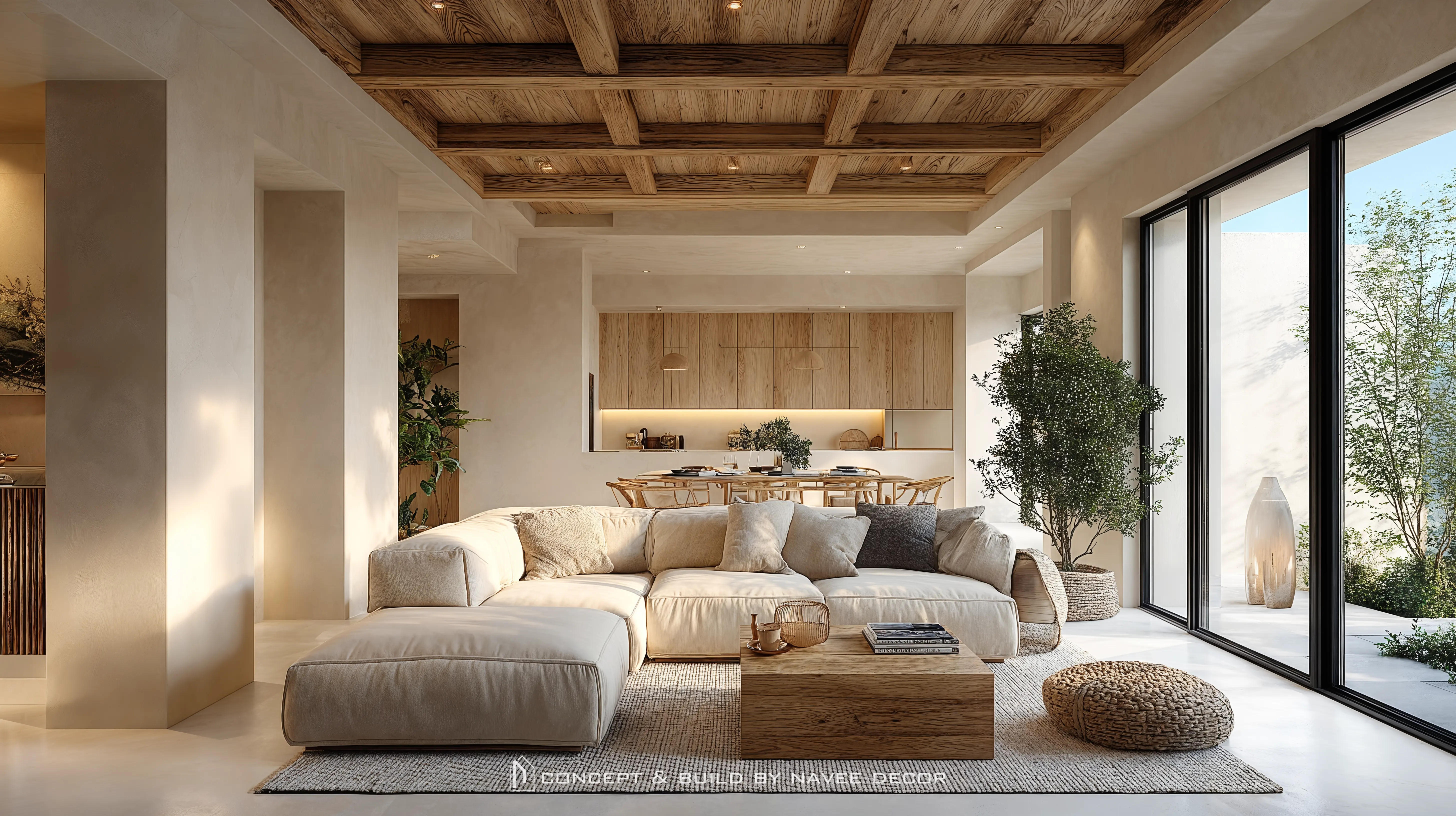 Bước vào bên trong, không gian mở ngập tràn ánh sáng, nội thất gỗ mộc cùng be trắng hòa quyện nhẹ nhàng, mang đến cảm giác thư thái ngay từ ánh nhìn đầu tiên. Dù là phòng khách mềm mại, phòng ngủ ngập nắng, góc làm việc đầy cảm hứng ay phòng tắm chuẩn resort – tất cả đều được Navee thiết kế theo tiêu chí: ít nhưng trọn vẹn, đơn giản nhưng sang trọng, bình yên nhưng giàu cảm xúc.