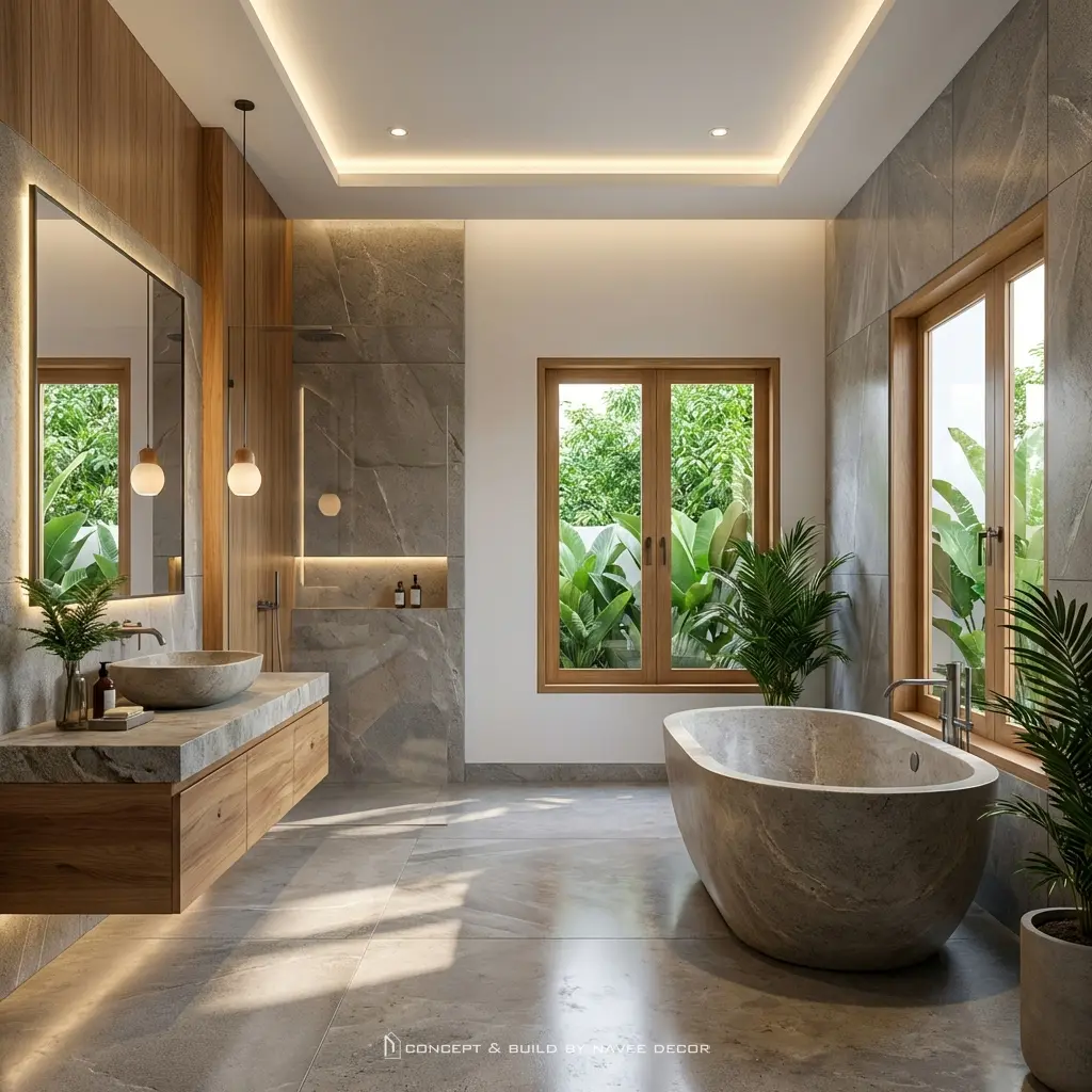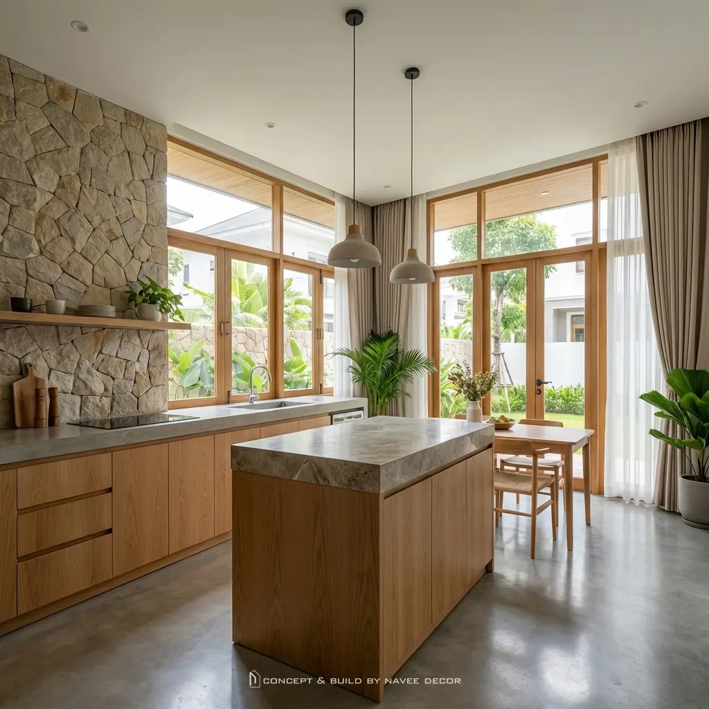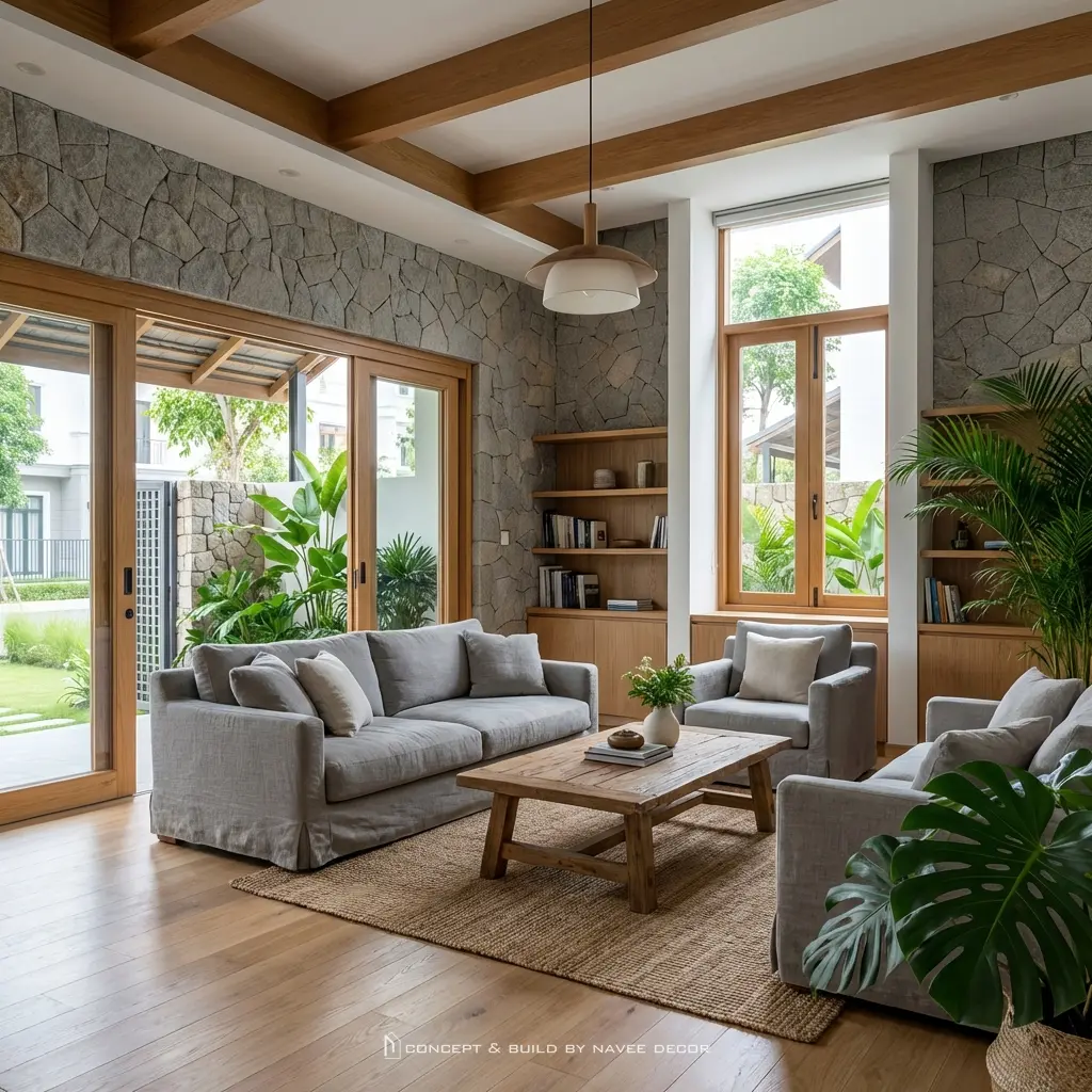 Ánh nắng rơi nhẹ qua từng khung cửa, gió lướt qua những khoảng mở, thiên nhiên len vào rất khẽ… mọi thứ như mềm hơn, yên hơn. Vật liệu tự nhiên đá thô, gỗ ấm, cây xanh hiện diện một cách mộc mạc mà bền bỉ theo thời gian.